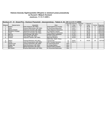 Halowe Zawody Ogólnopolskie Oficjalne w skokach przez przeszkody na Kucach i Małych Koniach Jaszkowo, 11-13.11.2005 r. Konkurs 31 - D - Grand Prix - Konkurs Poznański - dwunawrotowy - Tabela A; Art. 261.4.3 (13-11-2005) Miejsce 1 2 3 4 5 6 7 8 9 10 Nazwa konia Bolero Aleks Skania Texass Burghof's Voyager Tifani Ben 64 Drawita Pietrek Zawodnik Piotr Kaliszuk (JM.1992) Paulina Malinowska (JM.1990) Katarzyna Kowalik (JM.1992) Agnieszka Szubert (Mł.1993) Katarzyna Kowalik (JM.1992) Anna Szrajer (JM.1991) Filip Mizgier (Mł.1993) Wojciech Dahlke (JM.1992) Negra Fama Speed Limit Kalgar GB Macao HS Grafit I Andrzej Bedliński (JM.1991) Julia Kruszyniewicz (JM.1992) Justyna Kamińska (JM.1990) Karol Żuchowicz (JM.1992) Marta Pacholska (JM.1991) Paulina Malinowska (JM.1990) Klub Zielonogórski KJ Przylep KJ Szumawa Bobrowiec TKKJ Mazovia Warszawa KJ Hubertus Lusowo TKKJ Mazovia Warszawa Kielecki Klub Jeździecki KJ CH Jaszkowo BKS Kłos Budzyń OSK Stow. Sport. Nowy Ciechocinek JKS Tornado Szczecin KJ Dominanta Kicin KJ Amigo Będzin WLKS Krakus Kraków KJ Szumawa Bobrowiec I Nawrót I Nawrót Pkt. Czas 0 50,33 0 49,37 0 55,32 0 51,78 4 52,83 5 61,52 8 49,28 10 80,95 12 16 Elim. Elim. Elim. Elim. 56,87 52,13 II Nawrót Pkt. 0 0 4 4 0 4 4 4 II Nawrót Czas 36,48 36,57 37,98 38,76 39,86 38,18 35,35 49,04 Suma 0 0 4 4 4 9 12 14 8 44,65 20 Nagroda 800 PLN 700 PLN 500 PLN 350 PLN 250 PLN 50 PLN 50 PLN 50 PLN 50 PLN