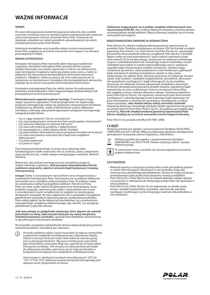 WAŻNE INFORMACJE SERWIS W czasie obowiązywania dwuletniej gwarancji zalecamy, aby wszelkie czynności serwisowe inne niż wymiana baterii wykonywane były wyłącznie przez autoryzowane centrum serwisowe firmy Polar. Gwarancja nie obejmuje uszkodzeń ani szkód pośrednich spowodowanych serwisem nieautoryzowanym przez Polar Electro. Informacje kontaktowe oraz wszystkie adresy centrów serwisowych firmy Polar znajdują się na stronie www.polar.com/support i na stronach poszczególnych krajów. ŚRODKI OSTROŻNOŚCI Komputer treningowy Polar wyświetla dane dotyczące wydolności organizmu. Komputer treningowy Polar pozwala określić poziom wysiłku fizycznego oraz okresy regeneracji w trakcie i po zakończeniu sesji treningowej. Urządzenie wykonuje pomiar pracy serca, a także (w zależności od zastosowania kompatybilnych akcesoriów/sensorów) prędkości, odległości, kadencji, pozycji itp. Inne zastosowania nie są zamierzone ani domniemane. Kompletna lista kompatybilnych akcesoriów znajduje się na stronie www.polar.com/en/products/accessories. Komputera treningowego Polar nie należy używać do wykonywania pomiarów środowiskowych, które mogą wymagać profesjonalnych lub przemysłowych technik pomiarowych. Minimalizowanie zagrożeń podczas treningu: Z treningiem mogą wiązać się pewne zagrożenia. Przed przystąpieniem do regularnego programu treningowego należy się zastanowić nad poniższymi kwestiami związanymi ze zdrowiem. Jeżeli na którekolwiek z pytań odpowiesz twierdząco, zalecamy, abyś przed rozpoczęciem programu treningowego zasięgnął porady lekarza. • • • • • • • Czy w ciągu ostatnich 5 lat nie ćwiczyłeś/aś? Czy masz podwyższone ciśnienie krwi lub wysoki poziom cholesterolu? Czy zażywasz lekarstwa na ciśnienie lub serce? Czy masz lub miałeś/aś problemy z oddychaniem? Czy zauważyłeś/aś u siebie objawy jakiejś choroby? Czy przechodzisz rekonwalescencję po poważnej chorobie lub leczeniu? Czy masz wszczepiony rozrusznik serca bądź inne urządzenie elektroniczne? • Czy palisz papierosy? • Czy jesteś w ciąży? Poza intensywnością treningu na pracę serca wpływają także farmakologiczne środki nasercowe, leki na ciśnienie, astmę, oddychanie, stany psychiczne itp., a także napoje energetyzujące, narkotyki, alkohol i nikotyna. Ważne jest, aby podczas treningu zwracać szczególną uwagę na reakcje własnego organizmu. Jeśli poczujesz niespodziewany ból lub nadmierne zmęczenie, zakończ ćwiczenie bądź kontynuuj z mniejszą intensywnością. Uwaga! Osoby z wszczepionym rozrusznikiem serca mogą korzystać z komputerów treningowych Polar. Teoretycznie nie są możliwe zakłócenia rozrusznika serca wywołane przez komputery Polar. W praktyce nigdy nie zanotowano żadnych przypadków zakłóceń. Pomimo to firma Polar nie może wydać żadnej oficjalnej gwarancji stwierdzającej, że jej produkty mogą być używane przez osoby z rozrusznikami serca oraz z wszczepionymi innymi urządzeniami ze względu na szeroką gamę dostępnych rozwiązań. W razie wątpliwości lub w przypadku wystąpienia jakichkolwiek niezwykłych objawów podczas użytkowania produktów Polar należy zgłosić się do lekarza lub skontaktować się z producentem wszczepionego urządzenia elektronicznego, aby określić, czy występuje jakiekolwiek ryzyko dla zdrowia. Jeśli masz alergię na jakąkolwiek substancję, która objawia się wskutek jej kontaktu ze skórą, bądź też jeśli obawiasz się reakcji alergicznej wskutek korzystania z produktu, sprawdź listę składników zamieszczoną w specyfikacjach technicznych produktu. W przypadku wystąpienia jakiejkolwiek skórnej reakcji alergicznej przerwij używanie produktu i skontaktuj się z lekarzem. W wyniku działania wilgoci i tarcia może dojść do zdarcia czarnej farby z powierzchni nadajnika na klatkę piersiową i zabrudzenia odzieży. Odzież w ciemnych kolorach może z kolei zabarwić monitory pracy serca o jaśniejszych kolorach. Aby jasne monitory pracy serca Polar były nieskazitelnie czyste przez długi czas, upewnij się, że Twoja odzież treningowa nie farbuje. Jeśli stosujesz na skórze perfumy lub środek do odstraszania owadów, upewnij się, że nie mają one kontaktu z komputerem treningowym ani nadajnikiem na klatkę piersiową. Jeśli trenujesz w chłodnych warunkach atmosferycznych (-20°C do -10°C/-4°F do 14°F), zalecamy noszenie komputera treningowego pod rękawem kurtki, bezpośrednio na skórze. 1.0 PL 02/2014 Zakłócenia mogą pojawić się w pobliżu urządzeń elektronicznych oraz stacji bazowych WLAN. Aby uniknąć błędnych odczytów, utrzymuj dystans od potencjalnych źródeł zakłóceń. Więcej informacji znajduje się na stronie www.polar.com/support. MIĘDZYNARODOWA GWARANCJA OGRANICZONA Polar Electro Oy udziela międzynarodowej gwarancji ograniczonej na produkty Polar. Produkty sprzedawane na terenie USA lub Kanady są objęte gwarancją Polar Electro, Inc. Polar Electro Oy/Polar Electro Inc. gwarantuje pierwszemu konsumentowi/nabywcy urządzenia Polar Electro, iż produkt będzie wolny od wad materiałowych i wad w jakości wykonania przez okres dwóch (2) lat od daty zakupu. Gwarancja nie obejmuje normalnego zużycia i uszkodzenia baterii lub normalnego zużycia materiałów, innych uszkodzeń powstałych w wyniku nieprawidłowego użycia, nadużycia, wypadku bądź niezachowania środków ostrożności, niewłaściwego utrzymania sprawności, wykorzystywania w celu handlowym, pękniętych bądź zadrapanych obudów/wyświetlaczy, opaski na rękę, paska elastycznego czy odzieży Polar. Niniejsza gwarancja nie obejmuje również szkód, strat, kosztów i wydatków bezpośrednich, pośrednich, ubocznych lub specjalnych wynikających z bądź odnoszących się do produktu. Gwarancja nie obejmuje również zakupionych produktów używanych. W okresie obowiązywania gwarancji produkt zostanie naprawiony bądź wymieniony na no