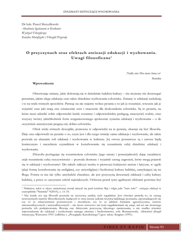 DYLEMATY DOTYCZĄCE WYCHOWANIA Dr hab. Paweł Skrzydlewski Akademia Igatianum w Krakowie Wydział Filozoficzny Katedra Metafizyki i Filozofii Przyrody O przyczynach oraz efektach ateizacji edukacji i wychowania. Uwagi filozoficzne 1 Nulla sine Deo mens bona est Seneka Wprowadzenie Obserwując zmiany, jakie dokonują się w dziedzinie ludzkiej kultury – nie możemy nie dostrzegać przemian, jakim ulega edukacja oraz także dziedzina wychowania człowieka. Zmiany w edukacji zaskakują i to na wiele różnych sposobów. Patrząc na nie stajemy wobec pytania o to jak je rozumieć, wreszcie jak je wyjaśnić oraz jaki mają one ostatecznie sens i znaczenie dla doskonalenia człowieka. Są to pytania, na które musi udzielić sobie odpowiedzi każdy rozumny i odpowiedzialny pedagog, nauczyciel, rodzic, oraz wszyscy twórcy jakichkolwiek form zorganizowanego społecznie systemu edukacji i wychowania – o ile oczywiście autentycznie pragną oni, dobra człowieka. Obok wielu różnych dyscyplin, pomocna w odpowiedzi na te pytania, okazuje się być filozofia. Daje ona odpowiedź na pytanie o to, czym jest i dla czego istnieje sama edukacja i wychowanie, ale także pozwala na ukazanie roli edukacji i wychowania w kulturze. Jej owoce poznawcze są i zawsze będą koniecznym i naczelnym czynnikiem w kształtowaniu się rozumienia całej dziedziny edukacji i wychowania. Filozofia posługując się rozumieniem człowieka (jego natury i potencjalności) dając zasadniczy zrąb rozumienia całej rzeczywistości – pozwala dostrzec i wyjaśnić szereg zagrożeń, które mogą pojawić się w edukacji i wychowaniu2. Do takich zaliczyć trzeba w pierwszej kolejności ateizm i laicyzm, w ogóle jakąś formę kształtowania się areligijnej, czy antyreligijnej i bezbożnej kultury ludzkiej, zamykającej się na Boga. Forma ta ma nie tylko antyludzki charakter, ale jest przyczyną dewastacji edukacji i całej kultury ludzkiej, a przez to zaczynem szkód największych. Ochrona przed tymi zgubnymi efektami powinna być Niniejszy tekst w nieco zmienionej wersji ukazał się pod tytułem Bóg i religia jako "nowe tabu" - ateizacja edukacji w czasopiśmie "Scientia" 9(2015), s. 11-33. 2 Nie każdy też typ filozofii pozwala na rzeczową analizę tych zagadnień. Jest również prawdą to, że szereg nowożytnych nurtów filozoficznych, będących w swej istocie jedynie krytyką ludzkiego poznania, opowiadających się czy to za relatywizmem poznawczym i moralnym, czy to za jakimiś formami agnostycyzmu, nurtów antymetafizycznych i antyrealistycznych – nie może rzeczowo ani tymi zagadnieniami się zająć, ani też nie dostrzega potrzeby ich podejmowania. Bywają one faktycznie przyczyną ideowego zamieszania, a nie rzadko również wprowadzania do edukacji i wychowania samego ateizmu i bezbożnictwa, zob. Romanowski, Aktualność filozofii tomistycznej, Warszawa 1931 (odbitka z „Przeglądu Katolickiego”);por. także: Krąpiec (1991). 1 FIDES ET RATIO Strona 93 DYLEMATY DOTYCZACE WYCHOWANIA przedmiotem troski wszystkich zainteresowanych dobrem człowieka realizowanym przez proces edukacji i wychowania. Należy mieć świadomość tego, że jeśli tej rozumnej troski zabrkaknie - dewastacja kulturowa spowodowana przez ateizm i bezbożnictwo w niedalekiej przyszłości otworzą drogę do zjawiska przeciwnego, lecz nie mniej groźnego, jakim jest fundamentalizm religijny, ideologizujący całość ludzkiej kultury. 1. Potrzeba zrozumienia problemu: podstawowe dystynkcje i supozycje Poczynione analizy nie mają na celu jakiejś formy konfesyjnej apologii chrześcijaństwa, choć ochrona, wsparcie i umacnianie tegoż leży w żywotnym interesie całej cywilizacji Zachodu. Znajomość dziejów ukazuje, że zaniechania w tej materii, nieskuteczność i obojętność przynoszą zawsze rozstrój życia indywidualnego, rodzinnego, narodowego i państwowego. Dokonywane analizy są rodzajem filozoficznego namysłu, ukazującego ważny problem pedagogiczny i kulturowy, także narodowy. Zostanie on zaprezentowany na drodze naturalnego, nieodwołującego się do prawd wiary religijnej, dyskursu. Droga ta nie wyklucza tak potrzebnych dziś działań ludzi religijnych, instytucjonalnych i indywidualnych, dokonywanych w różnych obszarach (prawa, mediów, polityki, szkolnictwa, literatury, sztuki, obronności i innych) zmierzających do obrony, umocnienia i rozwoju szeroko pojętej kultury religijnej, a w sposób szczególny, kultury chrześcijańskiej, katolickiej, polskiej3. Bez wątpienia jesteśmy świadkami nasilania się procesów przenikania ateistycznych koncepcji i praktyk także do edukacji i wychowania. Pojawia się tu szereg pytań, a wśród nich oto czy edukacja może realizować swe naturalne funkcje i zadania poddana ateizacji i ideologii antyreligijnej? Jakie faktyczne uzasadnienie kryje się za zjawiskiem rugowania Boga i religii z procesu edukacyjnego i wychowawczego człowieka? Oto niektóre problemy, poruszane w niniejszej rozprawie. By należycie przedstawić zagadnienie ateizacji edukacji – trzeba w pierwszej kolejności właściwie dokonać zdefiniowania problemu, by po jego opisie i interpretacji dać mu wyjaśnienie jego natury oraz zaprezentować racje istnienia samego zjawiska, danego do wyjaśnienia. Nie jest to zadanie łatwe4. Uczynić to można przede wszystkim na gruncie poznania i rozumienia o charakterze filozoficznym. Dopiero po wykonaniu tego, można należycie zrozumieć konsekwencje i charakter edukacji, w której doszło do jej złączenia z ateizmem, laicyzacją, agnostycyzmem, subiektywizmem czy też bezbożnictwem. Ale czym jest edukacja i jak pojąć wychowanie? Czym jest ateizm i co ateizmem nie jest? Czym jest wreszcie ludzka kultura i obecny w niej system wychowania i edukacji? Przywołać tu można wnioski, jakie zaprezentował przed laty F. Koneczny, który jasno przy wykorzystaniu wiedzy historycznej, wykazywał, że upadek katolicyzmu jest w Polsce ruiną polskości