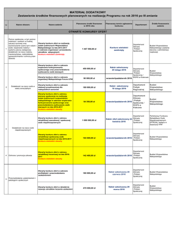 MATERIAŁ DODATKOWY Zestawienie środków finansowych planowanych na realizację Programu na rok 2016 po III zmianie Lp Nazwa obszaru Planowane środki finansowe w 2016 roku Nazwa zadania Planowany termin ogłoszenia konkursu Departament Źródła finasowania zadania OTWARTE KONKURSY OFERT 1 Pomoc społeczna, w tym pomoc rodzinom i osobom w trudnej sytuacji życiowej oraz wyrównywanie szans tych rodzin i osób; wspieranie rodziny i systemu pieczy zastępczej; działalność na rzecz rodziny, macierzyństwa, rodzicielstwa, upowszechniania i ochrony praw dziecka Otwarty konkurs ofert na realizację zadań publicznych Województwa Małopolskiego na lata 2013-2017 w zakresie organizacji i prowadzeniu ośrodków adopcyjnych Konkurs wieloletni zamknięty Otwarty konkurs ofert w zakresie wspierania funkcjonowania społecznego oraz przeciwdziałania wykluczeniu osób starszych Otwarty konkurs ofert w zakresie organizacji Małopolskiego Forum UTW 2 Działalność na rzecz osób w wieku emerytalnym Otwarty konkurs ofert w zakresie edukacji prozdrowotnej dla małopolskich seniorów Otwarty konkurs ofert z zakresu pomocy społecznej na realizację zadań publicznych województwa małopolskiego w zakresie wspierania funkcjonowania społecznego oraz przeciwdziałania wykluczeniu osób starszych na lata 2016-2017 Konkurs wieloletni otwarty Otwarty konkurs ofert z zakresu rehabilitacji zawodowej i społecznej osób niepełnosprawnych 3 4 5 1 447 550,00 zł Konkurs wieloletni zamknięty 450 000,00 zł Nabór zakończony 25 lutego 2016 90 000,00 zł wrzesień/październik 2016 180 000,00 zł Nabór zakończony 19 lutego 2016 54 350,00 zł Departament Zdrowia i Polityki Społecznej Departament Zdrowia Budżet i Polityki Województwa Społecznej / Małopolskiego ROPS w Krakowie Departament Polityki Regionalnej Budżet Województwa Małopolskiego Departament Zdrowia i Polityki wrzesień/październik 2016 Społecznej / ROPS w Krakowie Budżet Województwa Małopolskiego Departament Zdrowia 1 000 000,00 zł Budżet Województwa Małopolskiego (zadanie zlecone z administracji rządowej) Nabór ofert zakończony 22 i Polityki kwietnia 2016 Społecznej Państwowy Funduszu Rehabilitacji Osób Niepełnosprawnych (PFRON), będące w dyspozycji WM Działalność na rzecz osób niepełnosprawnych Ochrona i promocja zdrowia Departament Zdrowia wrzesień/październik 2016 i Polityki Społecznej Otwarty konkurs ofert z zakresu rehabilitacji społecznej osób niepełnosprawnych na lata 2016-2017 Konkurs wieloletni otwarty 164 069,00 zł Otwarty konkurs ofert z zakresu rehabilitacji leczniczej na lata 20162017 Konkurs wieloletni otwarty 142 400,00 zł Otwarty konkurs ofert w zakresie profilaktyki i przeciwdziałania uzależnieniom 180 000,00 zł Nabór zakończony 29 czerwca 2016 Departament Zdrowia i Polityki Społecznej Budżet Województwa Małopolskiego Otwarty konkurs ofert w dziedzinie rozwoju ośrodków leczenia uzaleznień 470 000,00 zł Nabór zakończony 29 marca 2016 Departament Zdrowia i Polityki Społecznej Budżet Województwa Małopolskiego Departament Zdrowia wrzesień/październik 2016 i Polityki Społecznej Przeciwdziałanie uzależnieniom i patologiom społecznym Budżet Województwa Małopolskiego Budżet Województwa Małopolskiego MATERIAŁ DODATKOWY Zestawienie środków finansowych planowanych na realizację Programu na rok 2016 po III zmianie Lp Nazwa obszaru Planowane środki finansowe w 2016 roku Nazwa zadania Otwarte konkursy ofert z zakresu upowszechniania kultury fizycznej: 0,00 zł 6 Departament Źródła finasowania zadania Departament Turystyki i Sportu Budżet Województwa Małopolskiego 1 450 000,00 zł I nabór zakończony 18 grudnia 2015 II nabór zakończony: 18 marca 2016 Departament Turystyki i Sportu Budżet Województwa Małopolskiego "Wakacje z piłką nożną - Małopolska Liga Wiejska" - organizacja wakacyjnych turniejów sportowych w piłce nożnej o zasięgu wojewódzkim 400 000,00 zł Nabór ofert zakończony 11 marca 2016 Departament Turystyki i Sportu Budżet Województwa Małopolskiego "Rodzinne Rajdy Rowerowe" organizacja rodzinnych rajdów rowerowych towarzyszących ważnym wydarzeniom rowerowym w regionie 200 000,00 zł Nabór ofert zakończony 11 marca 2016 Departament Turystyki i Sportu Budżet Województwa Małopolskiego "Weekendy z piłką ręczną" organizacja konsultacji szkoleniowych w piłce ręcznej (w 5 subregionach małopolski) dla dziewcząt i chłopców ze szkół podstawowych, zakończonych wojewódzkim turniejem finałowym, z udziałem 10 najlepszych drużyn, celem wyłonienia Mistrza 250 000,00 zł Nabór ofert zakończony 11 marca 2016 Departament Turystyki i Sportu Budżet Województwa Małopolskiego "Junior Sport"- organizacja zajęć pozaszkolnych dla dzieci ze szkół podstawowych z klas IV-VI w wielu dyscyplinach sportowych (na zasadach określonych przez Ministerstwo Sportu i Turystyki) 400 000,00 zł Nabór zakończony 7 stycznia 2016 Departament Turystyki i Sportu Budżet Województwa Małopolskiego "Mały Mistrz" - organizacja zajęć w ramach godzin lekcyjnych dla dzieci ze szkół podstawowych z klas I-III w różnych dyscyplinach sportowych (na zasadach określonych przez Ministerstwo Sportu i Turystyki) 350 000,00 zł Nabór zakończony 7 stycznia 2016 Departament Turystyki i Sportu Budżet Województwa Małopolskiego Agro-Hipo-Sport-Terapia - organizacja zajęć rekreacyjnych i sportowych upowszechniających jeździectwo 200 000,00 zł II kwartał 2016 Departament Turystyki i Sportu Budżet Województwa Małopolskiego Otwarty konkurs ofert z zakresu współzawodnictwa szkolenia sportowego dzieci i młodzieży 450 000,00 zł Nabór zakończony 31 grudnia 2015 Departament Turystyki i Sportu Budżet Województwa Małopolskiego Otwarty konkurs ofert z zakresu współzawodnictwa i szkolenia sportowego dzieci i młodzieży na lata 2015-2016 Konkurs wieloletni zamknięty 1 305 000,00 zł Konkurs wieloletni zamknięty Departament Turystyki i Spor
