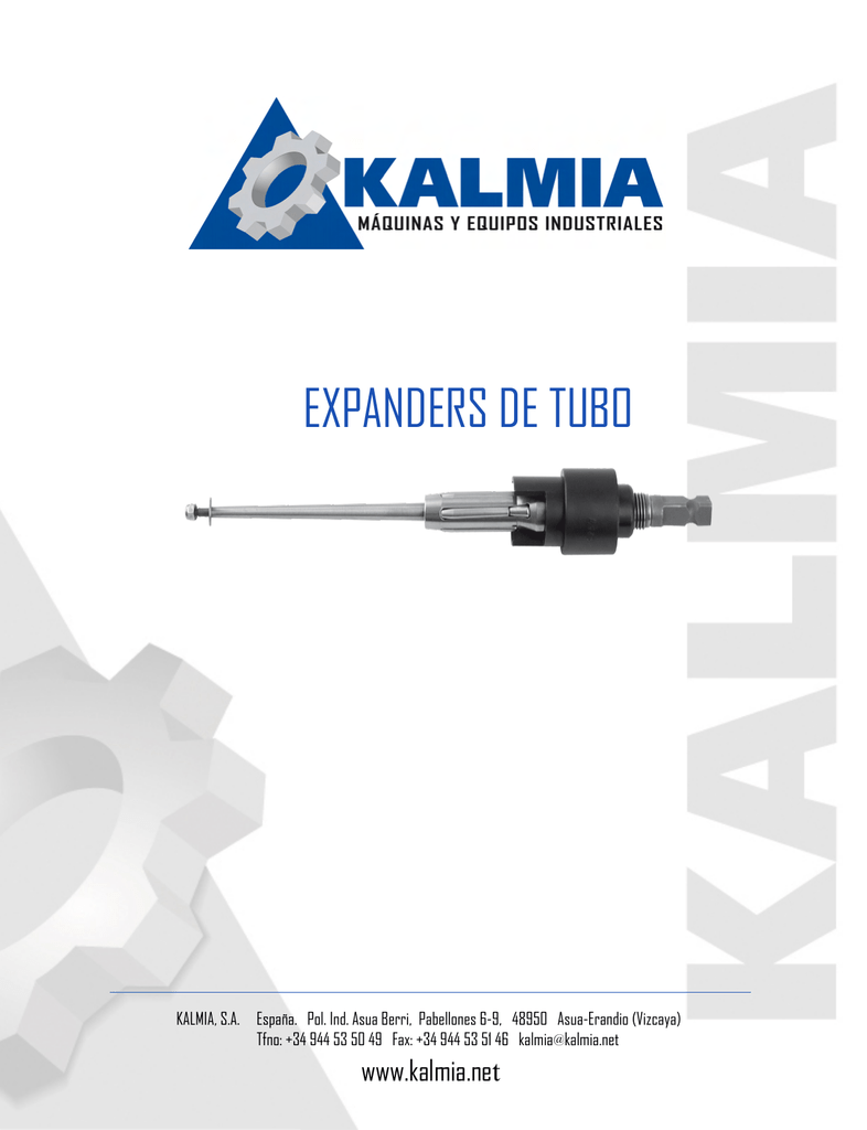 EXPANDERS DE TUBO KALMIA, S.A. España. Pol. Ind. Asua Berri, Pabellones 6-9, 48950 Asua-Erandio (Vizcaya) Tfno: +34 944 53 50 49 Fax: +34 944 53 51 46 [email protected] www.kalmia.net KALMIA, S.A. www.kalmia.net KALMIA, S.A. España. Pol. Ind. Asua Berri, Pabellones 6-9, 48950 , Asua-Erandio (Vizcaya) Tfno: +34 944 53 50 49 Fax: +34 944 53 51 46 [email protected] KALMIA, S.A. KALMIA, S.A. Index How to determinate a correct expansion? .................................................................................................. A-1 Tube Hole Gage .................................................................................... A-3 Tube rolling setup guide................................................................................................................................... A-5 Boiler Tube Installation code .......................................................................................................................... A-6 2R Type rol .......................................................................................................................................... A-6 Proper Way To Set Condenser Expander ...................................................................................................... A-6 Most Common Method of Setting a Boiler Expander ............................................................................... A-7 Step rolling (thick tube sheet) ......................................................................................................................... A-7 Double tube sheet application ....................................................................................................................... A-8 Condenser and heat exchanger tube expanders Typical thrust collars ....................................................................................................B-2 Rolls - for expanders series 800 , 800-5 , 1200 , 1200-5 , 8012 .................................................................B-3 Recommended Rolling Motors ........................................................................................................................B-4 900 series ...............................................................................................B-7 1300 series .............................................................................................B-8 800 series ...............................................................................................B-9 800-5 series ......................................................................................... B-12 1200 series .......................................................................................... B-14 1200-5 series....................................................................................... B-17 F600 series ......................................................................................... B-19 8012 series .......................................................................................... B-20 Refinery tube expander ..................................................................... B-22 Sugar refinery expander .................................................................... B-23 Linsen expanders ............................................................................... B-24 Notching&expanding expander ....................................................... B-24 Step-by-step ....................................................................................... B-24 PSE PIPE, CBTE, Diesel engine expanders ........................................ B-25 Special Tube Expanders “MULTI ROW”, TWTC, TACK, 5-ROLL EXPANDER with nylon bush, Baffle tube expanders .......... B-25 Boiler tube expanders Recommended Rolling Motors ....................................................................................................................... C-2 Short Mandrel’s Expansion Range................................................................................................................. C-3 KS Series Boiler Tube expanders ..........................................................C-4 Parallel Expansion Firetube Expanders...............................................C-6 PZ Series Boiler Tube expanders ..........................................................C-7 P2 Series Boiler Tube expanders ..........................................................C-9 Firetube Boiler Flaring Tube Expanders ........................................... C-11 Universal Combination Roller Beading Tool .................................... C-12 KALMIA, S.A. KRAIS KALMIA, TubeS.A. Expanders Rolling controls Tube Rolling Systems Installation Tools Beveling Tools Tube Removal Tools Tube Pulling Equipment Accesories K20 Pneumatic Rolling Motors ............................................................. D-2 PUSH&PULL K50-600 Pneumatic Rolling Motor ................................. D-4 Auto-K50 Rolling Motor with Autorevers ............................................ D-6 Right Angle Rolling Motor K77 ............................................................. D-7 Right Angle Rolling Motor .................................................................... D-8 FlexExpander ........................................................................................... E-2 TES-700-M Electronic Controller ............................................................ E-7 Tool for Serrating Tube Sheet ................................................................. F-2 Tube End Facer ......................................................................................... F-5 MiniMill 600 ............................................................................................. F-7 MiniMill ................................................................................................... G-2 HyperMill................................................................................................. G-5 Recommended cutting speeds
