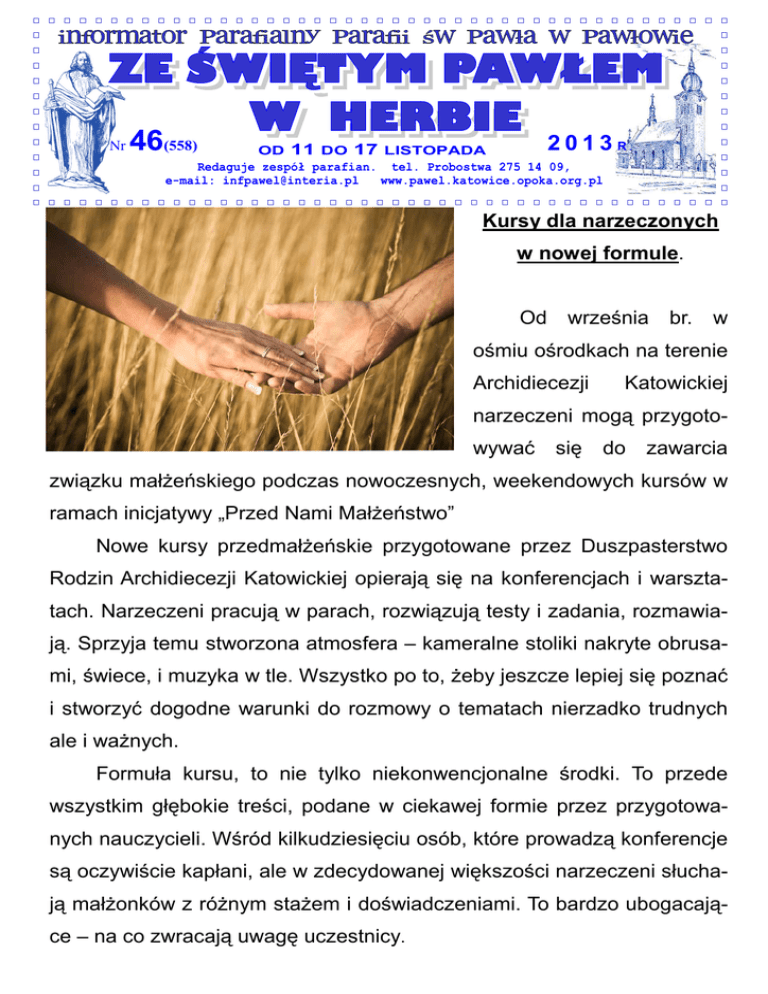 Nr 46(558) 2 0 1 3 R. OD 11 DO 17 LISTOPADA Redaguje zespół parafian. tel. Probostwa 275 14 09, e-mail: [email protected] www.pawel.katowice.opoka.org.pl Kursy dla narzeczonych w nowej formule. Od września br. w ośmiu ośrodkach na terenie Archidiecezji Katowickiej narzeczeni mogą przygotowywać się do zawarcia związku małżeńskiego podczas nowoczesnych, weekendowych kursów w ramach inicjatywy „Przed Nami Małżeństwo” Nowe kursy przedmałżeńskie przygotowane przez Duszpasterstwo Rodzin Archidiecezji Katowickiej opierają się na konferencjach i warsztatach. Narzeczeni pracują w parach, rozwiązują testy i zadania, rozmawiają. Sprzyja temu stworzona atmosfera – kameralne stoliki nakryte obrusami, świece, i muzyka w tle. Wszystko po to, żeby jeszcze lepiej się poznać i stworzyć dogodne warunki do rozmowy o tematach nierzadko trudnych ale i ważnych. Formuła kursu, to nie tylko niekonwencjonalne środki. To przede wszystkim głębokie treści, podane w ciekawej formie przez przygotowanych nauczycieli. Wśród kilkudziesięciu osób, które prowadzą konferencje są oczywiście kapłani, ale w zdecydowanej większości narzeczeni słuchają małżonków z różnym stażem i doświadczeniami. To bardzo ubogacające – na co zwracają uwagę uczestnicy. Pierwsze kursy odbyły się już w Koniakowie (dwa razy), Pszczynie i Chorzowie. - Zaskoczyła nas postawa ogromnej otwartości narzeczonych wobec treści, które proponowaliśmy. Nie padło słyszane czasami "a ile to będzie trwało?". Jako prelegenci zostaliśmy obdarzeni zaufaniem słuchaczy, którzy z uwagą śledzili nasze wypowiedzi, chętnie wykonywali ćwiczenia aktywizujące i nie bali się zadawać pytań. – mówią Beata i Piotr Warotowie – jedna z par prowadzących kurs w ośrodku przy parafii Św. Jadwigi w Chorzowie. Następna szansa dla narzeczonych na dobre przygotowanie się do sakramentu nadarzy się już niebawem. Do końca roku Duszpasterstwo Rodzin proponuje jeszcze kilka terminów w różnych lokalizacjach (Rybnik Boguszowice, Katowice, Chorzów, Jastrzębie, Koniaków). Na większość kursów są jeszcze wolne miejsca. Można także zapisywać się na kursy zaplanowane na 2014 rok. Wszystkie niezbędne informacje, lista nauczycieli oraz system umożliwiający zapisy on-line znajdują się na stronie internetowej projektu: www.przednamimalzenstwo.pl OGŁOSZENIA DUSZPASTERSKIE ● Zapraszam na Nieszpory niedzielne o godz. 1630. ● W imieniu katolickich Wspólnot i Ruchów w Zabrzu (Ruchu Światło - Życie, Domowego Kościoła, Odnowy w Duchu św., Pustyni w Mieście i innych) zapraszam we wtorek do naszego kościoła na "Modlitwę za Zabrze": o godz. 1900 Adoracja Najświętszego Sakramentu i o 1930 Eucharystia w intencji Miasta Zabrze i jego Mieszkańców. ● Msza św. szkolna w środę o godz. 800. ● W czwartek o godz. 1845 spotkanie młodzieży przygotowującej się do przyjęcia Sakramentu Bierzmowania. ● W czwartek po Mszy św. porannej odbędzie się Adoracja Najświętszego Sakramentu. ● W poniedziałek Święto Niepodległości - o godz. 1800 Msza św. w intencji Ojczyzny. ● W tym tygodniu przypada III piątek miesiąca poświęcony Miłosierdziu Bożemu - Msza św. w intencji czcicieli odprawiona zostanie w piątek o godz. 1800. ● Okazja do Spowiedzi świętej przed każdą Mszą św. ● W przyszłą niedzielę przeżywać będziemy w naszej Archidiecezji Dzień Muzyki Sakralnej. ● W Gościu Niedzielnym: W 2013 roku umrze o 40 tysięcy więcej Polaków, niż się urodzi. To największa tak duża różnica w ujemnym przyroście naturalnym w powojennej historii Polski. Z prognoz wynika że w 2060 roku będzie nas już tylko ok. 30 milionów. Niestety, kryzys demograficzny będzie dla nas bardzo kosztowny. Ponadto "Gościu": - czym właściwie jest czyściec? Słowa "czyściec" nie ma w Biblii, pojawiło się ono dopiero w XII wieku; - czy modlitwa o wylanie Ducha Świętego jest do zbawienia koniecznie potrzebna? ● Kolekta w przyszłą niedzielę będzie przeznaczona na pokrycie kosztów remontu dachu. „Bóg zapłać” za dzisiejsze ofiary na potrzeby Stolicy Apostolskiej. INTENCJE MSZY św. od 11 do 17 listopada 2013 r. 11.XI. Poniedziałek Wsp. Św. Marcina z Tours, bpa 12.XI. Wtorek Wspomnienie św. Jozafata, bpa i męczennika. g. 1800 Koncelebra - Za Ojczyznę, - Za + Stefanię Brem (30. dniowa), męża Józefa oraz rodziców z obu stron. g. 700 g. 1800 g. 1900 g. 1930 13.XI. Środa g. 700 g. 800 - Za parafian. Msza św. szkolna - Za parafian. g. 700 - Za ++ rodziców Kisperski, Skrzydło, męża Henryka oraz 2 siostry. po Mszy św. Adoracja Najświętszego Sakramentu - Za + Gertrudę Cygan w rocznicę śmierci. Wsp. św.św. Benedykta, Jana, Mateusza, Izaaka i Krystyna, 14.XI. Czwartek Wsp. Bł. Marii Luizy Merkert, dz. 15. XI. Piątek - Za ++ Tadeusza i Huberta Bazgier oraz szwagra Tomasza Cziura - Za ++ Pawła Brzęk, Julię i Teofila Jarczyk oraz pokrewieństwo Brzęk, Jarczyk, Kujon i Rolnik. Adoracja Najświętszego Sakramentu - Msza św. w intencji Miasta Zabrze i jego Mieszkańców. g. 1800 g. 700 - Za + Franciszka Plewik w 50. rocznicę śmierci. g. 1800 - Ku czci Miłosierdzia Bożego w intencji czcicieli. Wsp. Św. Alberta Wielkiego, bpa i dra 16.XI. Sobota g. 700 - W intencji rodzin Bernaś i Bieniek. g. 1800 - Za + Stanisława Kozłowskiego. Wsp. rocznicy pośw. rzymskich Bazylik sw.sw. Piotra i Pawła g. 630 Godzinki ku czci Matki Bożej, g. 700 - Za ++ Jana Czaja oraz Elżbietę Respondek w dniu urodzin. NIEDZIELA g. 1000 Koncelebra 33 ZWYKŁA - Do Miłosierdzia Bożego i Matki Boskiej Częstochowskiej z W CIĄGU ROKU podziękowaniem za odebrane łaski, z prośbą o dalszą opieDzień Muzyki kę Bożą i zdrowie dla Stanisława Jankiewicz w 50. rocznicy Liturgicznej w urodzin oraz o błogosławieństwo Boże dla Krzysztofa i TomaArchidiecezji sza z okazji urodzin, Te Deum Katowickiej - Msza św. chrzcielna: za Miłosza Kulpok, rodziców i chr