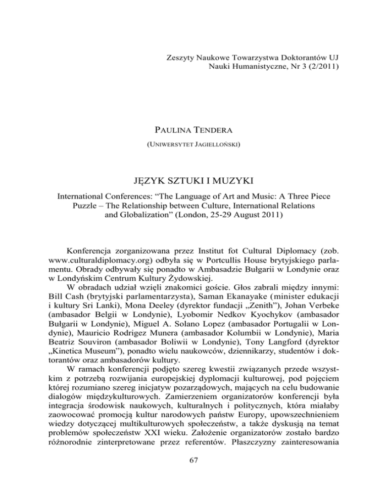 Zeszyty Naukowe Towarzystwa Doktorantów UJ Nauki Humanistyczne, Nr 3 (2/2011) PAULINA TENDERA (UNIWERSYTET JAGIELLOŃSKI) JĘZYK SZTUKI I MUZYKI International Conferences: “The Language of Art and Music: A Three Piece Puzzle – The Relationship between Culture, International Relations and Globalization” (London, 25-29 August 2011) Konferencja zorganizowana przez Institut fot Cultural Diplomacy (zob. www.culturaldiplomacy.org) odbyła się w Portcullis House brytyjskiego parlamentu. Obrady odbywały się ponadto w Ambasadzie Bułgarii w Londynie oraz w Londyńskim Centrum Kultury Żydowskiej. W obradach udział wzięli znakomici goście. Głos zabrali między innymi: Bill Cash (brytyjski parlamentarzysta), Saman Ekanayake (minister edukacji i kultury Sri Lanki), Mona Deeley (dyrektor fundacji „Zenith”), Johan Verbeke (ambasador Belgii w Londynie), Lyobomir Nedkov Kyochykov (ambasador Bułgarii w Londynie), Miguel A. Solano Lopez (ambasador Portugalii w Londynie), Mauricio Rodrigez Munera (ambasador Kolumbii w Londynie), Maria Beatriz Souviron (ambasador Boliwii w Londynie), Tony Langford (dyrektor „Kinetica Museum”), ponadto wielu naukowców, dziennikarzy, studentów i doktorantów oraz ambasadorów kultury. W ramach konferencji podjęto szereg kwestii związanych przede wszystkim z potrzebą rozwijania europejskiej dyplomacji kulturowej, pod pojęciem której rozumiano szereg inicjatyw pozarządowych, mających na celu budowanie dialogów międzykulturowych. Zamierzeniem organizatorów konferencji była integracja środowisk naukowych, kulturalnych i politycznych, która miałaby zaowocować promocją kultur narodowych państw Europy, upowszechnieniem wiedzy dotyczącej multikulturowych społeczeństw, a także dyskusją na temat problemów społeczeństw XXI wieku. Założenie organizatorów zostało bardzo różnorodnie zinterpretowane przez referentów. Płaszczyzny zainteresowania 67 Paulina Tendera __________________________________________________________________________________________________________________________________________________________________________________________________________________________________ oraz prywatnej pracy zawodowej sprawiły, że w czasie obrad mieszały się wypowiedzi osobiste, czasem nawet emocjonalne, z naukowymi i teoretycznymi, te zaś przybierały charakter konkretnych i szczegółowych referatów lub ogólnych dywagacji dotyczących kondycji kultury współczesnej. Próby podzielenia się osobistymi doświadczeniami życiowymi i zawodowymi podejmowali szczególnie przedstawiciele państw afrykańskich, np. Kenii i Zimbabwe. Jak podkreślali referenci, Afryka boryka się współcześnie przede wszystkim z brakiem nowoczesnych narzędzi komunikacyjnych (dostęp do internetu), które umożliwiłby promocję kultury narodowej, prezentację artystów czy wreszcie sprzedaż prac i rękodzieła miejscowych twórców. Ponadto pedagodzy i wychowawcy zwracali uwagę na konieczność integracji i edukacji młodzieży i dzieci pochodzenia afrykańskiego pod kątem znajomości kultur narodowych. Dużą grupę uczestników stanowili goście ze Stanów Zjednoczonych oraz Niemiec; ich wypowiedzi dotyczyły takich zagadnień jak historia tańca, muzyki, teatru itd., referaty te odbiegały więc od głównego tematu konferencji. Niestety, poza ogólnymi refleksjami i diagnozami dotyczącymi kultury współczesnej i jej związków z polityką, a także uzależnieniem od napływu środków finansowych, trudno było znaleźć referat, który stanowiłby faktyczną i konkretną ofertę współpracy międzynarodowej. Wyjątek stanowił bardzo ciekawy referat Tony’ego Langforda, dyrektora londyńskiego muzeum „Kinetica” – wystąpienie spotkało się z dużym zainteresowaniem nie tylko ze względu na przedstawione możliwości współpracy artystycznej, naukowej i dydaktycznej, ale także ze względu na pasję referenta i godną podziwu znajomość tematu oraz upór w realizacji przedsięwzięć artystycznych. W ramach konferencji “The Language of Art and Music” zaprezentowano projekty badawcze realizowane w ramach Instytutu Filozofii Uniwersytetu Jagiellońskiego, których kierownikiem jest prof. Leszek Sosnowski. Prezentacja ta miała przyczynić się do rozszerzenia kręgu współpracowników o przedstawicieli zagranicznych ośrodków naukowych oraz pomóc w nawiązaniu kontaktów z osobami, które badają w swojej pracy zawodowej zbliżone do strony polskiej kwestie filozoficzno-artystyczne. W ramach konferencji zaprezentowano między innymi następujące przedsięwzięcia: „Od filozofii światła od sztuki światła. Heglowska interpretacja przemian pojęcia” jest projektem promotorskim finansowanym ze środków Ministerstwa Nauki i Szkolnictwa Wyższego, realizowanym od 2010 roku. Jego celem jest napisanie oraz obrona pracy doktorskiej, która poświęcona będzie historii metafizyki światła, ze szczególnym uwzględnieniem roli, jaką odegrała ona w rozwoju filozofii sztuki i estetyki począwszy od starożytności, a kończąc u progu XXI wieku. Szczególne znaczenie odegrała tu filozofia Platona, pod której wpływem rozwijały się wszystkie nurty średniowiecznej metafizyki światła. W ujęciu ściśle filozoficznym praca zakończy się omówieniem koncepcji Hegla. Zakończenie projektu badawczego przewiduje się na czerwiec 2012 roku. 68 Język sztuki i muzyki __________________________________________________________________________________________________________________________________________________________________________________________________________________________________ “Polish Journal of Aesthetics” jest przedsięwzięciem naukowo-redakcyjnym, którego głównym celem jest stworzenie czasopisma anglojęzycznego, wydawanego w ramach Instytutu Filozofii Uniwersytetu Jagiellońskiego. Aby przedsięwzięcie to zakończyło się sukcesem, konieczne jest zbudowanie sprawnie działającego zespołu redakcyj