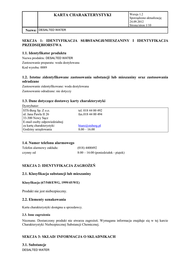 KARTA CHARAKTERYSTYKI Wersja 1.2 Sporządzono aktualizację 24.09.2012 Strona/stron 1/10 Nazwa: DESALTED WATER SEKCJA 1: IDENTYFIKACJA SUBSTANCJI/MIESZANINY I IDENTYFIKACJA PRZEDSIĘBIORSTWA 1.1. Identyfikator produktu Nazwa produktu: DESALTED WATER Zastosowanie preparatu: woda destylowana Kod wyrobu: 0089 1.2. Istotne zidentyfikowane zastosowania substancji lub mieszaniny oraz zastosowania odradzane Zastosowanie zidentyfikowane: woda destylowana Zastosowanie odradzane: nie dotyczy 1.3. Dane dotyczące dostawcy karty charakterystyki Dystrybutor: STS-Berg Sp. Z o.o. ul. Jana Pawła II 26 33-300 Nowy Sącz E-mail osoby odpowiedzialnej za kartę charakterystyki Godziny urzędowania tel. 018 44 00 492 fax.018 44 00 494 [email protected] 8.00 – 16.00 1.4. Numer telefonu alarmowego Telefon alarmowy zakładu: czynny od (018) 4400492 8:00 – 16:00 (poniedziałek - piątek) SEKCJA 2: IDENTYFIKACJA ZAGROŻEŃ 2.1. Klasyfikacja substancji lub mieszaniny Klasyfikacja (67/548/EWG, 1999/45/WE) Produkt nie jest niebezpieczny. 2.2. Elementy oznakowania Karta charakterystyki dostępna u sprzedawcy. 2.3. Inne zagrożenia Nieznane. Dostarczony produkt nie stwarza zagrożeń. Wymagana informacja znajduje się w tej karcie Charakterystyki Niebezpiecznej Substancji Chemicznej. SEKCJA 3: SKŁAD/ INFORMACJA O SKŁADNIKACH 3.1. Substancje DESALTED WATER KARTA CHARAKTERYSTYKI Wersja 1.2 Sporządzono aktualizację 24.09.2012 Strona/stron 2/10 Nazwa: DESALTED WATER Nie dotyczy 3.2. Mieszaniny Składniki stwarzające zagrożenie: brak SEKCJA 4: ŚRODKI PIERWSZEJ POMOC 4.1. Opis środków pierwszej pomocy Porady ogólne: W pierwszej kolejności należy wyprowadzić poszkodowaną osobę na świeże powietrze. Ułożyć na lewym boku z głową skierowaną w dół. W przypadku utrzymujących się objawów zatrucia takich jak bóle, zawroty głowy, wymioty lub jakichkolwiek wątpliwości zasięgnąć porady medycznej. Nigdy nie podawać niczego doustnie osobie nieprzytomnej. 4.1.1. Na skutek wdychania: 1. W przypadku wystąpienia takiej potrzeby – wykonać sztuczne oddychanie. 2. Zapewnić pomoc lekarską. 4.1.2. Kontakt ze skórą: 1. Zdjąć skażone ubranie. Oczyścić mechanicznie skażoną skórę, przemyć dużą ilością wody, następnie wodą z łagodnym mydłem. NIE stosować rozpuszczalników lub rozcieńczalników. 2. W przypadku, gdy podrażnienie skóry nie mija, skonsultować się z lekarzem dermatologiem. 4.1.3. Kontakt z oczami: 1. Przemyć skażone oczy strumieniem letniej wody przez 15-20 minut, przy wywiniętych powiekach, usunąć szkła kontaktowe. 2. Zapewnić pomoc okulisty. 4.1.4. W przypadku połknięcia: 1. W razie zatrucia doustnego przepłukać usta wodą. NIE WYWOŁYWAĆ WYMIOTÓW (niebezpieczeństwo zachłyśnięcia). 2. Do chwili odtransportowania do szpitala choremu zapewnić spokój, leżenie i ciepło. 4.2. Najważniejsze ostre i opóźnione objawy oraz skutki narażenia Objawy: brak dostępnej informacji. Zagrożenia: brak dostępnej informacji 4.3. Wskazania dotyczące wszelkiej natychmiastowej pomocy lekarskiej i szczególnego postępowania z poszkodowanym Pierwsza procedura pomocy powinny być ustalona w porozumieniu z lekarzem medycyny pracy. Zasięgnąć porady medycznej SEKCJA 5: POSTĘPOWANIE W PRZYPADKU POŻARU 5.1. Środki gaśnicze Odpowiednie środki gaśnicze: Środki gaśnicze, które nie mogą być użyte ze względów DESALTED WATER Stosować zraszanie wodą, piany alkoholopodobne, suche chemikalia lub dwutlenek węgla. Chłodzić zbiorniki i ich otoczenie poprzez zraszanie wodą. Nie stosować prądów wodnych. KARTA CHARAKTERYSTYKI Wersja 1.2 Sporządzono aktualizację 24.09.2012 Strona/stron 3/10 Nazwa: DESALTED WATER bezpieczeństwa 5.2. Szczególne zagrożenia związane z substancją lub mieszaniną Szczególne zagrożenia: Specyficzne zagrożenia w czasie zwalczania pożaru: W przypadku pożaru może powstawać tlenek węgla oraz toksyczne dymy. Ponieważ produkt zawiera organiczne, palne składniki, w czasie pożaru tworzyć się będzie czarny, gęsty dym zawierający niebezpieczne produkty spalania (patrz w sekcji 10). Narażenie na działanie produktów rozkładu może zagrażać zdrowiu. Chłodzić zamknięte zbiorniki narażone na ogień poprzez zraszanie wodą. Zebrać oddzielnie zanieczyszczoną wodę gaśniczą Nie można jej usunąć do kanalizacji. Pozostałości po pożarze i zanieczyszczona woda gaśnicza muszą być usunięte zgodnie z lokalnymi przepisami. 5.3. Informacje dla straży pożarnej Środki ochrony indywidualnej strażaków: W razie konieczności w czasie gaszenia pożaru ubrać aparat z niezależnym doprowadzeniem powietrza. Hełm ochronny z wizjerem, odzież ognioodporna (bluza i spodnie ognioodporne z taśmami wokół ramion, nóg i pasa), rękawice ochronne, odporne na cięcie i dielektryczne, sprzęt izolujący autonomiczny. SEKCJA 6: POSTĘPOWANIE W PRZYPADKU NIEZAMIERZONEGO UWOLNIENIA DO ŚRODOWISKA 6.1. Indywidualne środki ostrożności, wyposażenie ochronne i procedury w sytuacjach awaryjnych Indywidualne środki ostrożności: Pary rozpuszczalnika są cięższe od powietrza i mogą unosić się nad podłogą. Zapewnić wystarczającą wentylację. Użyć środków ochrony osobistej. Ewakuować załogę w bezpieczne miejsce. Nie dopuścić do zbliżania się ludzi do wycieku/rozsypania od strony nawietrznej. Zapewnić wentylację. 6.2. Środki ostrożności w zakresie ochrony środowiska Środki ostrożność w zakresie ochrony środowiska Starać się, aby nie dopuścić do przedostania się materiału do sieci wodnej lub kanalizacji. W przypadku skażenia produktem rzek, jezior lub ścieków powiadomić odpowiednie władze. 6.3. Metody i materiały zapobiegające rozprzestrzenianiu się skażenia i służące do usuwania skażenia Metody oczyszczania: DESALTED WATER Czyścić detergentami. Unikać rozpuszczalników. Zebrać wyciek w niepalny materiał absorbujący (ziemię, piasek, ziemię okrzemkową, wermikulit) i umie