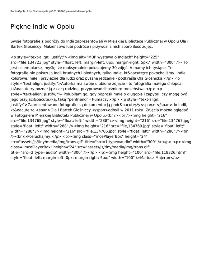 Radio Opole: http://radio.opole.pl/101,96866,piekne-indie-w-opolu Piękne Indie w Opolu Swoje fotografie z podróży do Indii zaprezentowali w Miejskiej Bibliotece Publicznej w Opolu Ola i Bartek Głośniccy. Małżeństwo lubi podróże i przywozi z nich sporo ilość zdjęć. <p style="text-align: justify;"><img alt="MBP wystawa o Indiach" height="225" src="file,134723.jpg" style="float: left; margin-left: 0px; margin-right: 5px;" width="300" />- To jest osiem plansz, myślę, że maksymalnie pokazujemy 30 zdjęć. A mamy ich tysiące. Te fotografie nie pokazują Indii brudnych i biednych, tylko Indie, które pokochaliśmy. Indie kolorowe, miłe i przyjazne dla ludzi oraz pyszne jedzenie - podkreśla Ola Głośnicka.</p> <p style="text-align: justify;">Autorka ma swoje ulubione zdjęcie - to fotografia małego chłopca, który poznał ją z całą rodziną, przyprowadził ośmioro rodzeństwa.</p> <p style="text-align: justify;">- Polubiłam go, gdy poprosił mnie o długopis i zapytał, czy mogę być jego przyjaciółką, taką "penfriend" - tłumaczy.</p> <p style="text-align: justify;">Zaprezentowane fotografie są dokumentacją podróży<span> </span>do Indii, którą <span>Ola i Bartek Głośniccy </span>odbyli w 2011 roku. Zdjęcia można oglądać w Fotogalerii Miejskiej Biblioteki Publicznej w Opolu.<br /><br /><img height="216" src="file,134765.jpg" style="float: left;" width="288" /><img height="216" src="file,134767.jpg" style="float: left;" width="288" /><img height="216" src="file,134769.jpg" style="float: left;" width="288" /><img height="216" src="file,134766.jpg" style="float: left;" width="288" /><br /><br />Posłuchajmy:</p> <p><img class="mcePlayerBox" height="24" src="assets/js/tiny/media/img/trans.gif" title="src=1|type=audio" width="300" /></p> <p><img class="mcePlayerBox" height="24" src="assets/js/tiny/media/img/trans.gif" title="src=2|type=audio" width="300" /></p> <p><img height="100" src="file,118326.html" style="float: left; margin-left: 0px; margin-right: 5px;" width="100" />Mariusz Majeran</p>