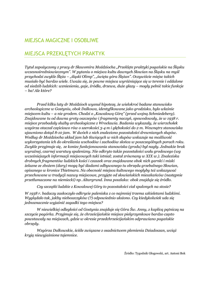 MIEJSCA MAGICZNE I OSOBLIWE MIEJSCA PRZEKLĘTYCH PRAKTYK Tytuł zapożyczony z pracy dr Sławomira Moździocha „Przeklęte praktyki pogańskie na Śląsku wczesnośredniowiecznym”. W pytaniu o miejsca kultu dawnych Słowian na Śląsku na myśl przychodzi zwykle Ślęża – „śląski Olimp”, „święta góra Ślężan”. Oczywiście miejsc takich musiało być bardzo wiele. Uważa się, że pewne miejsca wyróżniające się w terenie i oddalone od siedzib ludzkich: wzniesienia, gaje, źródła, drzewa, duże głazy – mogły pełnić takie funkcje – ba! Ale które? Przed kilku laty dr Moździoch wysnuł hipotezę, że wielokroć badane stanowisko archeologiczne w Gostyniu, obok Dalkowa, identyfikowane jako grodzisko, było właśnie miejscem kultu – a nie grodem. Chodzi o „Kowalową Górę” (przed wojną Schmiedeberg). Znajdowane tu od dawna groty oszczepów i fragmenty naczyń, spowodowały, że w 1938 r. miejsce przebadały służby archeologiczne z Wrocławia. Badania wykazały, że wierzchołek wzgórza otaczał częściowo rów o szerokości 3-4 m i głębokości do 2 m. Wewnątrz stanowiska ujawniono dotąd 8-10 jam. W dwóch z nich znaleziono pozostałości drewnianych słupów. Według dr Moździocha układ jam lub tkwiących w nich słupów wskazuje na możliwość wykorzystania ich do określania wschodów i zachodów słońca w poszczególnych porach roku. Zwykle przyjmuje się, ze koniec funkcjonowania stanowiska (grodu) był nagły. Jednakże brak wyraźnej, czarnej warstwy spalenizny. Nie odkryto także pozostałości wału grodowego (wg wcześniejszych informacji miejscowych taki istniał; został zrównany w XIX w.). Znaleziska drobnych fragmentów ludzkich kości i czaszek oraz znajdowane obok nich garnki i miski żelazne ze zbożem (dary) mogą być śladami odbywanego tu obrzędu grzebalnego Słowian, opisanego w kronice Thietmara. Na obecność miejsca kultowego mogłyby też wskazywać przechowane w tradycji nazwy miejscowe, przyjęte od słowiańskich mieszkańców (następnie przetłumaczone na niemiecki) np. Altargrund. Inna poszlaka: obok znajduje się źródło. Czy szczątki ludzkie z Kowalowej Góry to pozostałości ciał spalonych na stosie? W 1938 r. badaczy zaskoczyło odkrycie paleniska z co najmniej trzema szkieletami ludzkimi. Wyglądało tak, jakby nieboszczyków (?) odpowiednio ułożono. Czy kiedykolwiek uda się jednoznacznie wyjaśnić zagadki tego miejsca? W niewielkiej odległości od Gostynia znajduje się Góra Św. Anny, z kaplicą pątniczą na szczycie pagórka. Przyjmuje się, że chrześcijańskie miejsce pielgrzymkowe bardzo często powstawały na miejscach, gdzie w okresie przedchrześcijańskim odprawiano pogańskie obrzędy. Wzgórza Dalkowskie, ściśle związane z osadnictwem plemienia Dziadoszan, wciąż kryją niewyjaśnione tajemnice. Źródło: Tygodnik Głogowski, art. Antoni Bok