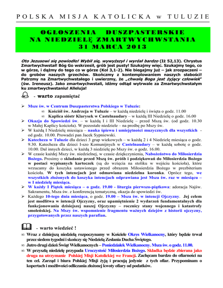 POLSKA MISJA KATOLICKA w TULUZIE OGŁOSZENIA DUSZPASTERSKIE NA NIEDZIELĘ ZMARTWYCHWSTANIA 31 MARCA 2013 Oto Jezusowi się powiodło! Wybił się, wywyższył i wyrósł bardzo (Iż 52,13). Chrystus Zmartwychwstał! Bóg Go wskrzesił, grób jest pusty! Szukajmy więc. Szukajmy tego, co w górze, i dążmy do tego co w górze (Kol 3,1-2). Nie biegajmy już – jak zrozpaczeni – do grobów naszych grzechów. Skończmy z kontemplowaniem naszych słabości! Patrzmy na Zmartwychwstałego i uwierzmy, że „chwałą Boga jest żyjący człowiek” (św. Ireneusz). Jako zmartwychwstali, idźmy odtąd wytrwale za Zmartwychwstałym ku zmartwychwstaniu! Alleluja! ֠ - warto zapamiętać Msze św. w Centrum Duszpasterstwa Polskiego w Tuluzie: • Kościół św. Andrzeja w Tuluzie – w każdą niedzielę i święta o godz. 11.00 • Kaplica sióstr Klarysek w Castelnaudary – w każdą III Niedzielę o godz. 16.00 Okazja do Spowiedzi św. – w każdą I i III Niedzielę – przed Mszą św. (od godz. 10.30 w Małej Kaplicy kościoła). W pozostałe niedziele – na prośbę po Mszy św. W każdą I Niedzielę miesiąca – nauka śpiewu i umiejętności muzycznych dla wszystkich od godz. 10.00. Prowadzi pan Jacek Sypniewski. Katecheza w Tuluzie dla dzieci 3 grup wiekowych – w każdą 2 i 4 Niedzielę miesiąca o godz. 9.30. Katecheza dla dzieci I-szo Komunijnych w Castelnaudary – w każdą sobotę o godz. 10.00. Dal innych dzieci, w każdą 3 niedzielę po Mszy św. o godz. 16.00. W czasie każdej Mszy św. niedzielnej, w czasie dziękczynienia, Nabożeństwo do Miłosierdzia Bożego. Prosimy o składanie przed Mszą św. próśb i podziękowań do Miłosierdzia Bożego w postaci wypisanych karteczek (są do wzięcia na stoliku w wejściu kościoła), które wrzucamy do koszyka ustawionego przed obrazem Miłosierdzia Bożego w prezbiterium kościoła. W tych intencjach jest odmawiana niedzielna koronka. Oprócz tego, we wszystkich złożonych do koszyka intencjach odprawiana jest Msza św. raz w miesiącu – w I niedzielę miesiąca. W każdy I Piątek miesiąca – o godz. 19.00 - liturgia pierwszo-piątkowa: adoracja Najśw. Sakramentu, Msza św. z konferencją tematyczną, okazja do spowiedzi św. Każdego 10-tego dnia miesiąca, o godz. 19.00 – Msza św. w intencji Ojczyzny. Jej celem jest modlitwa w intencji Ojczyzny, oraz upamiętnienie 2 wydarzeń fundamentalnych dla funkcjonowania dzisiejszej naszej Ojczyzny – rocznicy stany wojennego i katastrofy smoleńskiej. Na Mszy św. wspomnienie fragmentu ważnych dziejów z historii ojczyzny, przygotowanych przez naszych parafian. - warto wiedzieć ! • Wraz z dzisiejszą niedzielą rozpoczynamy w Kościele Okres Wielkanocny, który będzie trwał przez siedem tygodni i skończy się Niedzielą Zesłania Ducha Świętego. • Jutro drugi dzień Świąt Wielkanocnych – Poniedziałek Wielkanocny. Msza św. o godz. 11.00. • W przyszłą niedzielę przypada Uroczystość Miłosierdzia Bożego. Składka będzie zbierana jako druga na utrzymanie Polskiej Misji Katolickiej we Francji. Zachęcam bardzo do ofiarności na ten cel. Zarząd i biura Polskiej Misji żyją i pracują jedynie z tych ofiar. Przypominam o kopertach i możliwości odliczania złożonej kwoty ofiary od podatków. • Dzięki ofiarności wiernych, Polska Parafia w Tuluzie otrzymała nowe naczynia liturgiczne: złoty kielich z czterema ewangelistami i głęboką patenę, które zastąpiły wysłużone bardzo i zniszczone stare naczynia. Koszt wyniósł ponad 400 Euro. Całość zasponsorowały rodziny: państwa SKARBEK i KAMIONKÓW. W imieniu całej naszej polskiej parafii w Tuluzie składam serdeczne podziękowania za ten gest serca oraz troski o piękno i godność liturgii Mszy św. • Pragnę również bardzo serdecznie podziękować naszym drogim parafiankom za przygotowanie i zorganizowanie w Wielką Sobotę, w czasie święcenia pokarmów, przyjęcia z kawą i ciastem. Pani Ewie za zebranie ofiar na ten cel, pani Krystynie za przygotowanie Sali i przeprowadzenie spotkania, a pani Marcie za przygotowanie prezentów wielkanocnych dla dzieci. Koszt organizacji wyniósł 160 Euro (kawa, ciasto, napoje dla dzieci i paczki wielkanocne oraz zastawa plastikowa). Zebraliśmy od parafian 70 Euro, resztę, czyli 90 Euro dopłaciła parafia. Tym, którzy wspomogli tę organizację ofiarowując swoje 5 Euro, składamy serdeczne podziękowania. To była duża pomoc. • Ogromnie podziękowania kieruję do pani Kamili za zrobienie tegorocznej dekoracji Grobu Pańskiego. To był wielki wysiłek, zważywszy jest sytuacje rodzinną i możliwości czasowe. Bóg zapłać. • Wyrazy wdzięczności kieruje również do osób które pomagały w prowadzeniu liturgii Wielkiego Tygodnia. Szczególnie pani Elżbiecie za prowadzenie licznych śpiewów, które ubogaciły naszą modlitwę. • Jeszcze osobne podziękowania kieruje do osób, które dbały o funkcjonowanie naszej polskiej parafii podczas mojej marcowej nieobecności: szczególnie panu Bogdanowi i pani Krystynie. Bóg zapłać. • Zachęcam do regularnego odwiedzania naszej parafialnej strony internetowej. Jej adres, to: www.parafiapl-tuluza.eu. Można tam na bieżąco śledzić wszystkie bieżące informacje z życia parafii oraz z życia polonii i naszej ojczyzny. Z upływem każdego tygodnia kolejne pod-strony są uruchamiane. Zachęcam do zaglądania . Kalendarz liturgiczny na nadchodzący tydzień: • Piątek 05.04. – I Piątek miesiąca. Msza św. o godz. 19.30. Okazja do spowiedzi św. • Sobota 06.04. – I Sobota miesiąca. • Niedziela 07.04. – II Niedziela Wielkanocna – Niedziela Miłosierdzia Bożego. Składka zbierana na potrzeby Polskiej Misji Katolickiej we Francji. INTENCJE MSZALNE na miesiąc: marzec – kwiecień 2013 Niedziela 17.03 Godz. 11.00 V Niedz. W. Postu 2 Niedziela 24.03 VI Niedz. W. Postu Godz. 11.00 Niedziela Palmowa Wielki Czwartek 28.03 W int. + Adama PLEŚNARA. Zmarł we Wrocławiu 