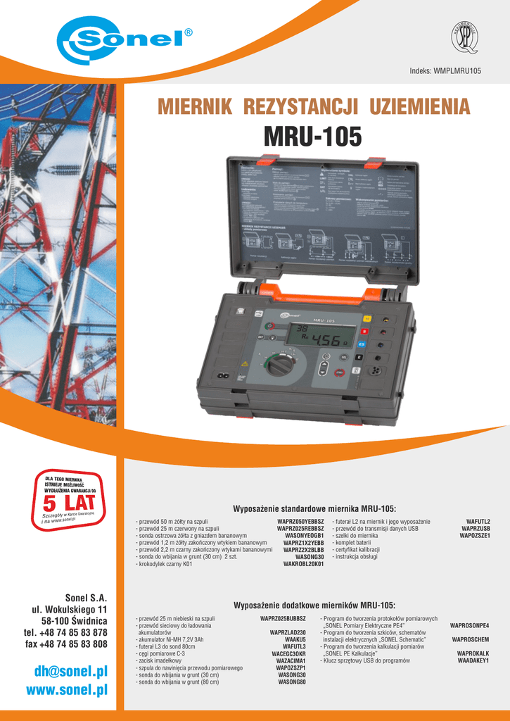 Indeks: WMPLMRU105 MIERNIK REZYSTANCJI UZIEMIENIA MRU-105 Wyposażenie standardowe miernika MRU-105: - przewód 50 m żółty na szpuli WAPRZ050YEBBSZ - przewód 25 m czerwony na szpuli WAPRZ025REBBSZ - sonda ostrzowa żółta z gniazdem bananowym WASONYEOGB1 - przewód 1,2 m żółty zakończony wtykiem bananowym WAPRZ1X2YEBB - przewód 2,2 m czarny zakończony wtykami bananowymi WAPRZ2X2BLBB - sonda do wbijania w grunt (30 cm) 2 szt. WASONG30 - krokodylek czarny K01 WAKROBL20K01 Sonel S.A. ul. Wokulskiego 11 58-100 Świdnica tel. +48 74 85 83 878 fax +48 74 85 83 808 [email protected] www.sonel.pl - futerał L2 na miernik i jego wyposażenie - przewód do transmisji danych USB - szelki do miernika - komplet baterii - certyfikat kalibracji - instrukcja obsługi WAFUTL2 WAPRZUSB WAPOZSZE1 Wyposażenie dodatkowe mierników MRU-105: - przewód 25 m niebieski na szpuli - przewód sieciowy do ładowania akumulatorów - akumulator Ni-MH 7,2V 3Ah - futerał L3 do sond 80cm - cęgi pomiarowe C-3 - zacisk imadełkowy - szpula do nawinięcia przewodu pomiarowego - sonda do wbijania w grunt (30 cm) - sonda do wbijania w grunt (80 cm) WAPRZ025BUBBSZ WAPRZLAD230 WAAKU5 WAFUTL3 WACEGC3OKR WAZACIMA1 WAPOZSZP1 WASONG30 WASONG80 - Program do tworzenia protokołów pomiarowych „SONEL Pomiary Elektryczne PE4” - Program do tworzenia szkiców, schematów instalacji elektrycznych „SONEL Schematic” - Program do tworzenia kalkulacji pomiarów „SONEL PE Kalkulacje” - Klucz sprzętowy USB do programów WAPROSONPE4 WAPROSCHEM WAPROKALK WAADAKEY1 MRU-105 MIERNIK REZYSTANCJI UZIEMIENIA Pomiar rezystancji uziemień w układzie trzy- i czterobiegunowym: Pomiar rezystancji uziemienia: - możliwość pomiarów uziemień wielokrotnych metodą trzybiegunową bez rozłączania mierzonych uziomów (z zastosowaniem cęgów pomiarowych), zakres pomiarowy wg IEC61557-5: 0,12Ω...20kΩ - nadzorowanie warunków pomiaru (np. obecności napięć zakłócających, wpływu rezystancji elektrod pomiarowych RH i RS oraz stanu baterii), - wysoka odporność na napięcia zakłócające. Zakres Rozdzielczość Błąd podstawowy 0,00...9,99Ω 0,01Ω ±(3% w.m. + 3 cyfry) 10,0...99,9Ω 0,1Ω 100...999Ω 1Ω Pomiar rezystywności gruntu metodą Wennera: 1,00...9,99kΩ 0,01kΩ - możliwością wyboru odległości pomiędzy elektrodami pomiarowymi - pomiar na różnych głębokościach, 10,0...20,0kΩ 0,1kΩ ±(2% w.m. + 2 cyfry) Pomiar rezystancji metodą dwu- lub czteroprzewodową. Pamięć 300 wyników pomiarów z możliwością przesłania do komputera (łącze USB) Przyrząd spełnia wymagania normy PN-EN 61557. Bezpieczeństwo elektryczne: - rodzaj izolacji podwójna, zgodnie z PN-EN 61010-1 i IEC 61557 - kategoria pomiarowa III 300V wg PN-EN 61010-1 - stopień ochrony obudowy wg PN-EN 60529 IP54 Pozostałe dane techniczne: - zasilanie miernika - zasilanie ładowarki (MRU-101) - wyświetlacz - gwarancja baterie alkaliczne LR14 (rozmiar C) (5 szt.) lub pakiet akumulatorów Ni-MH 100...250V, 50...60Hz ciekłokrystaliczny, o wysokości 20mm 36 miesięcy (opcja 5 lat) Czy wiesz, że... Miernik MRU-105 wykonuje pomiary prądem o częstotliwości 128Hz, dzięki temu jest bardzo odporny na zakłócenia pochodzące od sieci 50Hz ? Pomiar rezystancji uziemienia przy pomocy cęgów: zakres pomiarowy wg IEC61557-5: 0,16Ω...20kΩ Zakres Rozdzielczość Błąd podstawowy 0,00...9,99Ω 0,01Ω ±(8% w.m. + 3 cyfry) 10,0...99,9Ω 0,1Ω 100...999Ω 1Ω 1,00...9,99kΩ 0,01kΩ 10,0...20,0kΩ 0,1kΩ ±(8% w.m. + 2 cyfry) Pomiar rezystywności gruntu Zakres Rozdzielczość Błąd podstawowy 0,00...9,99Ωm 0,01Ωm ±(3% w.m. + 3 cyfry) 10,0...99,9Ωm 0,1Ωm 100...999Ωm 1Ωm 1,00...9,99kΩm 0,01kΩ 10,0...99,9kΩm 0,1kΩ 100...999kΩm 1kΩm Zależna od dokładności pomiaru Re 4p ale nie mniejsza niż 1cyfra Skrót „w.m.” oznacza „wartość mierzoną wzorcową”. Czy wiesz, że... Nominalne warunki użytkowania: - temperatura pracy - maksymalne napięcie zakłóceń AC+DC podczas pomiaru: - prąd pomiarowy dla wartości rezystancji ≤100Ω: - maksymalne napięcie pomiarowe: - częstotliwość prądu pomiarowego 0...+40°C 24V (68Vp-p) nie mniejszy niż 225mA 40V 128Hz Miernik MRU-105 pozwala mierzyć metodą techniczną rezystancję uziemień wielokrotnych, za pomocą dodatkowych cęgów, bez konieczności rozłączania złącz kontrolnych? Zawartość niniejszego folderu nie stanowi oferty w rozumieniu prawa i jest publikowany dla celów informacyjnych bez odpowiedzialności prawnej. v.1