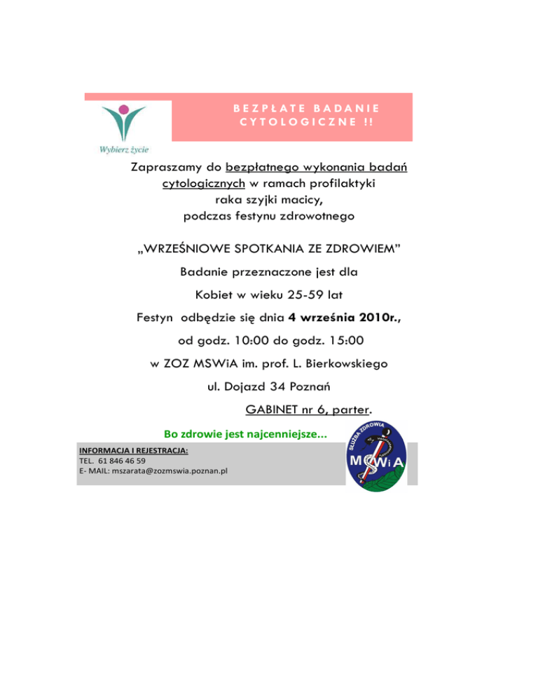 B E Z P Ł AT E B A DA N I E CYTOLOGICZNE !! Zapraszamy do bezpłatnego wykonania badań cytologicznych w ramach profilaktyki raka szyjki macicy, podczas festynu zdrowotnego „WRZEŚNIOWE SPOTKANIA ZE ZDROWIEM” Badanie przeznaczone jest dla Kobiet w wieku 25-59 lat Festyn odbędzie się dnia 4 września 2010r., od godz. 10:00 do godz. 15:00 w ZOZ MSWiA im. prof. L. Bierkowskiego ul. Dojazd 34 Poznań GABINET nr 6, parter. Bo zdrowie jest najcenniejsze... INFORMACJA I REJESTRACJA: TEL. 61 846 46 59 E- MAIL: [email protected]