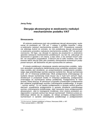 J. DuŜy Jerzy DuŜy Decyzja akcesoryjna w zwalczaniu naduŜyć mechanizmów podatku VAT Streszczenie W artykule analizowana jest rola podatkowej decyzji akcesoryjnej, wydawanej na podstawie art. 108 ust. 1 ustawy o podatku towarów i usług, w zwalczaniu naduŜyć mechanizmów podatku VAT. Prowadzone rozwaŜania skłaniają Autora do wniosku, Ŝe rola podatkowej decyzji akcesoryjnej w zwalczaniu procederu naduŜycia mechanizmów podatku VAT nie jest jednoznaczna. Od tego, czy decyzje te zapiszą się pozytywnie w zwalczaniu zjawiska naduŜycia mechanizmów podatkowych, czy teŜ nie, zdecyduje ich stosowanie w zgodzie z ich naturą, a więc obok, a nie zamiast innych ustaleń, we wszystkich przypadkach, w których jest to tylko moŜliwe, oraz traktowanie takich decyzji tylko jako podstawy zainicjowania konkretnych postępowań karnych, ale absolutnie nie jako wyznacznika ich zakresu. W prawie podatkowym obowiązuje zasada samowymiaru podatku. Jedynym sposobem podwaŜenia deklarowanej przez podatnika wysokości naleŜnego podatku jest określenie, po przeprowadzeniu postępowania podatkowego, jego prawidłowego wymiaru poprzez wydanie tzw. decyzji wymiarowej (zob. art. 21 Ordynacji podatkowej). Obok postępowania zmierzającego do wydania decyzji wymiarowej moŜe toczyć się w myśl tych samych reguł, określonych w przepisach Działu VI Ordynacji podatkowej, postępowanie zmierzające do wymierzenia sankcji podatkowej. Postępowania te róŜni sprawa, której dotyczą. W pierwszym przypadku przedmiotem postępowania jest ustalenie prawidłowego wymiaru zobowiązania podatkowego, w drugim – wymiar sankcji1. Co do zasady postępowanie w sprawie sankcji powinno stanowić uzupełnienie postępowania w sprawie określenia prawidłowego wymiaru zobowiązania podatkowego, stąd nazywane bywa postępowaniem akcesoryjnym. Jest to rozwiązanie modelowe, choć moŜna prowadzić postępowanie w sprawie sankcji bez decyzji wymiarowej2. Doktryna prawa podatkowego skłania się do poglądu, Ŝe relacje pomiędzy postępowaniem wymiarowym w sprawie zobowiązania podatkowego a postępowaniem 1 2 R. W o l a ń s k i, System podatkowy w Polsce, Warszawa 2009, s. 407. Patrz szerzej ibidem, s. 408–409. 116 Prokuratura i Prawo 9, 2014 Decyzja akcesoryjna w zwalczaniu naduŜyć… w sprawie sankcji nie są tak ścisłe, aby postępowanie w sprawie sankcji uznawać za niesamoistne3. Pomimo to raz jeszcze naleŜy podkreślić, Ŝe wysoce poŜądana jest sytuacja prowadzenia i postępowania wymiarowego i postępowania w sprawie sankcji podatkowej. Niestety, w wielu wypadkach organy podatkowe nie prowadzą z róŜnych przyczyn postępowań podatkowych zakończonych wymiarową decyzją podatkową, a prowadzą postępowania ograniczone tylko do określenia sankcji podatkowej. Jest to rozwiązanie prostsze, nie związane z takimi trudnościami dowodowymi jak wydanie decyzji wymiarowej, gwarantujące z większości wypadków osiągnięcie załoŜonego celu – utrzymanie decyzji w mocy, a w następnie w oparciu o ustalenia decyzji przeprowadzenie skutecznego – bo zakończonego wyrokiem skazującym postępowania karnoskarbowego. W przypadku najbardziej rozpowszechnionej na gruncie podatku od towarów i usług sankcji wymierzanej w oparciu o art. 108 ust. 1 ustawy o podatku od towarów i usług (u.o.p.t.u.) ta wydawałoby się prosta droga do osiągnięcia celu – eliminacji zjawiska wystawiania fikcyjnych faktur, a w konsekwencji naduŜyć mechanizmów podatku VAT, nie przynosi jednak zadawalających efektów. Odpowiedź na pytanie dlaczego wymaga odniesienia do charakteru prawnego sankcji podatkowej i prowadzonego postępowania podatkowego zmierzającego do określenia jej wymiaru, jak i będącego jej logicznym następstwem postępowania karnoskarbowego. Decyzja nakładana na podstawie art. 108 ust. 1 u.o.p.t.u. w oparciu o stwierdzenie faktu wystawienia fikcyjnych faktur ma słuŜyć poprzez zawartą w niej dolegliwość eliminacji zjawiska wystawiania fikcyjnych faktur będących koniecznym elementem naduŜyć mechanizmu podatku VAT. Rodzi się pytanie o znaczenie takich decyzji w zwalczaniu naduŜyć mechanizmów podatku VAT na gruncie prawa podatkowego, ale takŜe i karnego, poniewaŜ prowadzone postępowania karne będą czerpać z zawartych w nich ustaleń, zwłaszcza wówczas, gdy decyzja wymiarowa nie zostanie wydana. Przepis artykułu 108 ust. 1 u.o.p.t.u. łączy obowiązek podatkowy z samym faktem wystawienia faktury bez względu na to, czy zdarzenie gospodarcze, które było tego podstawą miało miejsce, czy teŜ nie. Ustawodawca poprzez tę regulację wprowadził do polskiego systemu prawa podatkowego zasadę zapłaty kwoty wskazanej jako podatek na fakturze niezaleŜnie od realnej przyczyny jej wystawienia, obejmując tym samym obowiązkiem wspomnianej zapłaty takŜe wystawców faktur fikcyjnych (pustych). Przepis art. art. 108 ust. 1 u.o.p.t.u. jest sankcją podatkową4. Sankcje podatkowe słuŜą zagwarantowaniu lub wymuszeniu realizacji roszczenia 3 4 Ibidem. Tak W. M a r u c h i n, VAT. Komentarz, Dom Wydawniczy ABC, Warszawa 2005, wyd. II (uwaga 1 do art. 108 ustawy o podatku od towarów i usług). Prokuratura i Prawo 9, 2014 117 J. DuŜy podatkowego i nakładane są w celach niefiskalnych5. Oczywiście, sankcje fiskalne zwiększają dochody budŜetu Państwa, ale nie pełnią roli fiskalnej w znaczeniu, jakie przypisuje się podatkom6. Taką właśnie, wewnętrzną sankcją jest przepis art. 108 ust. 1 u.o.p.t.u. Jego rolą nie jest zapewnienie płacenia przez sprawców wystawiających fikcyjne faktury podatku z tego tytułu, lecz zapobieganie procederowi wystawiania fikcyjnych faktur (a w konsekwencji zapobieganie naduŜyciom procedury tego podatku) poprzez wymierzenie bardzo dotkliwej sankcji wystawcy takich dokumentów – zapłaty kwoty wskazanej jako podatek na fikcyjnej fakturze. Celem tej regulacji jest zagwarantowanie realizacji obowiązku podatkowego określonego w ustawie o po