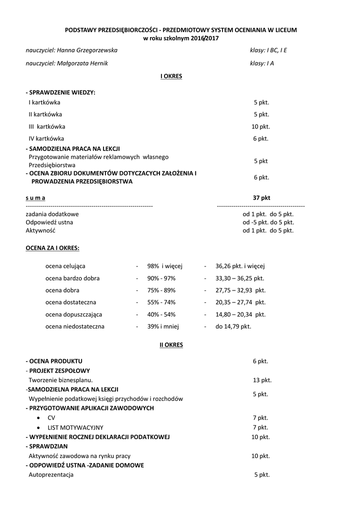 PODSTAWY PRZEDSIĘBIORCZOŚCI - PRZEDMIOTOWY SYSTEM OCENIANIA W LICEUM w roku szkolnym 2016/2017 nauczyciel: Hanna Grzegorzewska klasy: I BC, I E nauczyciel: Małgorzata Hernik klasy: I A I OKRES - SPRAWDZENIE WIEDZY: I kartkówka 5 pkt. II kartkówka 5 pkt. III kartkówka 10 pkt. IV kartkówka 6 pkt. - SAMODZIELNA PRACA NA LEKCJI Przygotowanie materiałów reklamowych własnego Przedsiębiorstwa - OCENA ZBIORU DOKUMENTÓW DOTYCZACYCH ZAŁOŻENIA I PROWADZENIA PRZEDSIĘBIORSTWA 5 pkt 6 pkt. suma -------------------------------------------------------------zadania dodatkowe Odpowiedź ustna Aktywność 37 pkt ------------------------------------------od 1 pkt. do 5 pkt. od -5 pkt. do 5 pkt. od 1 pkt. do 5 pkt. OCENA ZA I OKRES: ocena celująca - 98% i więcej - 36,26 pkt. i więcej ocena bardzo dobra - 90% - 97% - 33,30 – 36,25 pkt. ocena dobra - 75% - 89% - 27,75 – 32,93 pkt. ocena dostateczna - 55% - 74% - 20,35 – 27,74 pkt. ocena dopuszczająca - 40% - 54% - 14,80 – 20,34 pkt. ocena niedostateczna - 39% i mniej - do 14,79 pkt. II OKRES - OCENA PRODUKTU - PROJEKT ZESPOŁOWY Tworzenie biznesplanu. -SAMODZIELNA PRACA NA LEKCJI Wypełnienie podatkowej księgi przychodów i rozchodów - PRZYGOTOWANIE APLIKACJI ZAWODOWYCH CV LIST MOTYWACYJNY - WYPEŁNIENIE ROCZNEJ DEKLARACJI PODATKOWEJ - SPRAWDZIAN Aktywność zawodowa na rynku pracy - ODPOWIEDŹ USTNA -ZADANIE DOMOWE Autoprezentacja 6 pkt. 13 pkt. 5 pkt. 7 pkt. 7 pkt. 10 pkt. 10 pkt. 5 pkt. -------------------------------------------------------------suma -------------------------------------------------------------Ogólnopolski Dzień Przedsiębiorczości , prezentacja Odpowiedź ustna Aktywność -----------------------------------------------------63 pkt -----------------------------------------------------7 pkt. od -5 pkt. – do 5 pkt. od 1 pkt. – do 5 pkt. OCENA ZA II OKRES: ocena celująca - 98% i więcej - 61,74 pkt. i więcej ocena bardzo dobra - 90% - 97% - 56,70 – 61,73 pkt. ocena dobra - 75% - 89% - 47,25 – 55,99 pkt. ocena dostateczna - 55% - 74% - 34,65 – 47,24 pkt. ocena dopuszczająca - 40% - 54% - 25,20 – 34,63 pkt. ocena niedostateczna - 39% i mniej - do 25,19 pkt. OCENA ROCZNA: (ocena roczna jest sumą punktów z pierwszego i drugiego okresu) ocena celująca - 98% i więcej - 98 pkt. i więcej ocena bardzo dobra - 90% - 97% - 90 – 97,99 pkt. ocena dobra - 75% - 89% - 75 – 89,99 pkt. ocena dostateczna - 55% - 74% - 55 – 74,99 pkt. ocena dopuszczająca - 40% - 54% - 40 – 54,99 pkt. ocena niedostateczna - 39% i mniej - do - 39,99 pkt. INFORMACJE SZCZEGÓŁOWE: 1. Uczeń nieobecny podczas kartkówek z przyczyn usprawiedliwionych ma prawo do uzupełnienia w/w prac, w terminie ustalonym przez nauczyciela, nie później jak na dwa tygodnie przed zakończeniem semestru. Zaliczenia zaległych kartkówek odbywać się będą w godzinach popołudniowych po zakończeniu zajęć lekcyjnych. Uczeń nieobecny z przyczyn nieusprawiedliwionych w dniu, w którym odbywa się pisemne sprawdzenie wiedzy lub kiedy wyznaczony został termin oddania prac zaliczeniowych, nie ma prawa do zaliczenia w/w prac, konsekwencją tego jest otrzymanie 0 pkt. 2. Kartkówki i prace pisemne nieczytelne nie będą oceniane. Prace osób posiadających orzeczenia o dysgrafii, będą poprawiane wspólnie z uczniem. 3. Prace pisemne indywidualne (CV, list motywacyjny, zadania dodatkowe) uczniowie zobowiązani są do oddania w wyznaczonym terminie, osobiście na lekcji „Podstawy przedsiębiorczości”. Uczniowie nieobecni z przyczyn usprawiedliwionych, w/w prace oddają na pierwszej lekcji po powrocie do szkoły. Prace wykonane zespołowo należy oddać w pierwszym wyznaczonym terminie bez względu na nieobecność poszczególnych osób należących do zespołu. Oddanie prac w innym terminie niż wyznaczony przez nauczyciela wiąże się z otrzymaniem mniejszej ilości punktów. Każdy dzień zwłoki to –1 pkt. Zdobycie mniejszej ilości punktów wiąże się z otrzymaniem niższej oceny. 4. Nauczyciel ma prawo do zwiększenia puli punktów podstawowych w przypadku konieczności dodatkowego sprawdzenia wiadomości w formie ustnej lub pisemnej, zgodnie z zasadami Statutu Szkoły. W w/w przypadkach pula punktów będzie zwiększona o ustaloną przez nauczyciela liczbę punktów. 5. Autoprezentacji można dokonać od chwili poznania zasad do dnia wystawienia ocen okresowych. Termin ustala uczeń wspólnie z nauczycielem. 6. Warunkiem otrzymania pozytywnej oceny rocznej jest uzyskanie niezależnie 40% pkt. w I i II okresie. Uzyskanie mniejszej ilości punktów niż wymagane 40% jest jednoznaczne z koniecznością zaliczenia całego okresu. 7. Ocena roczna jest sumą punktów z I i II okresu. 8. Każdy uczeń ma możliwość podwyższenia pozytywnej oceny proponowanej jeżeli posiada wszystkie wymagane zaliczenia zawarte w puli zadań obowiązkowych. Chcąc uzyskać wyższą ocenę uczeń powinien poprawić ocenę z dwóch kartkówek napisanych w I okresie lub sprawdzianu w II okresie. Do puli punktów wlicza się kartkówki i sprawdzian w którym uczeń otrzymał wyższą ilość punktów. W sytuacji, gdy do otrzymania wyższej oceny okresowej lub rocznej brakuje do 2 pkt. uczeń nie ma obowiązku pisania sprawdzianu. Uzupełnia brakującą ilość punktów pisząc kartkówkę z materiału wyznaczonego przez nauczyciela. Poprawa odbywa się w terminie ustalonym wspólnie przez ucznia i nauczyciela. 9. W przypadku uzyskania niedostatecznej oceny okresowej lub proponowanej rocznej, chcąc uzyskać ocenę dopuszczającą, uczeń ma obowiązek napisania sprawdzianu zaliczeniowego z zakresu materiału obowiązującego w danym okresie. Uczeń może przystąpić do w/w sprawdzianu jeżeli posiada 50% obecności na lekcjach. Poprawa odbywa się w terminie ustalonym wspólnie przez ucznia i nauczyciela. 10. Ocena może być podwyższona poprzez uzyskanie punktów za wykonanie zadań dodatkowych. 11. Punkty dodatkowe będą doliczone do obowiązkow
