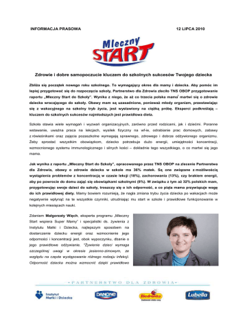 INFORMACJA PRASOWA 12 LIPCA 2010 Zdrowie i dobre samopoczucie kluczem do szkolnych sukcesów Twojego dziecka ZbliŜa się początek nowego roku szkolnego. To wymagający okres dla mamy i dziecka. Aby pomóc im lepiej przygotować się do rozpoczęcia szkoły, Partnerstwo dla Zdrowia zleciło TNS OBOP przygotowanie i raportu „Mleczny Start do Szkoły”. Wynika z niego, Ŝe aŜ co trzecia polska mama martwi się o zdrowie dziecka wracającego do szkoły. Obawy mam są uzasadnione, poniewaŜ młody organizm, przestawiając się z wakacyjnego na szkolny tryb Ŝycia, jest wystawiony na cięŜką próbę. Eksperci podkreślają – kluczem do szkolnych sukcesów najmłodszych jest prawidłowa dieta. Szkoła stawia wiele wymagań i wyzwań organizacyjnych, zarówno przed rodzicami, jak i dziećmi. Poranne wstawanie, uwaŜna praca na lekcjach, wysiłek fizyczny na wf-ie, odrabianie prac domowych, zabawy z rówieśnikami oraz zajęcia pozaszkolne wymagają sprawnego, zdrowego i dobrze odŜywionego organizmu. śeby sprostać wszystkim obowiązkom, dziecko potrzebuje duŜo energii, umiejętności koncentracji, wzmocnionego systemu immunologicznego i silnych kości – dokładnie tego wszystkiego, o co martwi się jego mama. Jak wynika z raportu „Mleczny Start do Szkoły”, opracowanego przez TNS OBOP na zlecenie Partnerstwa dla Zdrowia, obawy o zdrowie dziecka w szkole ma 36% matek. Są one związane z moŜliwością wystąpienia problemów z koncentracją w czasie lekcji (18%), zachorowania (13%), czy brakiem energii, aby po powrocie do domu zająć się obowiązkami szkolnymi (8%). W związku z tym aŜ 32% polskich mam, przygotowując swoje dzieci do szkoły, troszczy się o ich odporność, a co piąta mama przywiązuje wagę do ich prawidłowej diety. Mamy bowiem rozumieją, Ŝe nagła zmiana trybu Ŝycia dziecka po wakacjach moŜe negatywnie wpłynąć na te wszystkie czynniki, utrudniając mu start w szkole i prawidłowe funkcjonowanie w kolejnych miesiącach nauki. Zdaniem Małgorzaty Więch, eksperta programu „Mleczny Start wspiera Super Mamy” i specjalistki ds. Ŝywienia z Instytutu Matki i Dziecka, najlepszym sposobem na dostarczenie dziecku energii oraz wzmocnienie jego odporności i koncentracji jest, obok wypoczynku, dbanie o jego prawidłowe odŜywianie. "śywienie dzieci wymaga szczególnej uwagi w okresie jesienno-zimowym, ze względu na częste występowanie róŜnego rodzaju infekcji. Odporność dziecka moŜna wzmocnić dzięki prawidłowo skomponowanej diecie, która powinna dostarczać odpowiednią ilość energii i składników odŜywczych. Niektóre składniki pokarmowe, głównie witaminy i składniki mineralne - zwłaszcza witamina C, witamina A, Ŝelazo i cynk, wspomagają zdolności obronne organizmu". Dobrze zbilansowana dieta zmniejszy ryzyko zachorowań oraz pozwoli mamie i dziecku przejść obronną ręką przez trudny okres rozpoczęcia nauki lub powrotu do szkoły. Szczególną rolę powinno pełnić w niej śniadanie – najwaŜniejszy posiłek w ciągu dnia. Podobnie jak podręczniki i przybory szkolne, śniadanie jest inwestycją w codzienny rozwój ucznia. Pokrywając ¼ dziennego zapotrzebowania na energię, daje młodemu człowiekowi siłę potrzebną do stawienia czoła czekającym go wyzwaniom. Warto zatem kaŜdego dnia dbać o to, by było poŜywne i zawierało składniki odŜywcze niezbędne do prawidłowego rozwoju dziecka. „Z myślą o potrzebach kaŜdej mamy troszczącej się o zdrowie swoich dzieci, Partnerstwo dla Zdrowia stworzyło Mleczny Start. Jest to kaszka manna z mlekiem, wzbogacona o witaminy i minerały waŜne dla odporności, energii, mocnych kości, koncentracji oraz tworzenia energii dziecka w wieku szkolnym. Mleczny Start to proste i zdrowe danie, które powinno się znaleźć w diecie kaŜdego ucznia” – mówi Ewa Zacharewicz, MenedŜer ds. Relacji Zewnętrznych i Komunikacji Danone, komentując obawy polskich mam o zdrowie ich dzieci przedstawione w raporcie „Mleczny Start do Szkoły”. „Mam nadzieję, Ŝe Mleczny Start pomoŜe polskim mamom zadbać o zdrowie dziecka i kaŜdego dnia wyprawić je do szkoły” - dodaje Ewa Zacharewicz. Zdrowie ucznia powinno być przedmiotem troski kaŜdej mamy przygotowującej swoją pociechę do szkoły. Podręczniki dostarczają wiedzy, ale dziecko przyswaja ją znacznie trudniej, gdy jest rozkojarzone i pozbawione energii. Dobra kondycja ułatwi uczniowi szkolny start, a gdy juŜ na starcie zacznie odnosić w niej sukcesy, łatwiej poradzi sobie z czekającymi na niego w przyszłości kolejnymi obowiązkami. Informacje dodatkowe: Małgorzata Więch Specjalista ds. Ŝywienia, ekspert programu „Mleczny Start wspiera Super Mamy” z Instytutu Matki i Dziecka. Mama 4 letniej Basi i 7 letniego Bartka. Posiada wieloletnie doświadczenie w doradzaniu polskim mamom jak właściwie zadbać o zdrową dietę ich dziecka. Program „Mleczny Start wspiera Super Mamy” Ogólnopolski program edukacyjny zainicjowany przez koalicję Partnerstwo dla Zdrowia. Jego celem jest upowszechnienie wiedzy dotyczącej zasad prawidłowego odŜywiania dzieci oraz zachęcenie najmłodszych do jedzenia śniadania – najwaŜniejszego posiłku w ciągu dnia. Jest on odpowiedzią na potrzeby kaŜdej polskiej mamy, która pomimo obarczenia wieloma codziennymi obowiązkami, troszczy się o swoje dzieci. Przywiązuje duŜą wagę do ich prawidłowego rozwoju, zarówno fizycznego, jak i intelektualnego i potrzebuje konkretnych sposobów, które pomogą jej wychować je na zdrowe, silne i mądre. Program wspiera znana polska mama – Paulina Smaszcz-Kurzajewska oraz eksperci - psycholog Anna Kałuba-Korczak ze Specjalistycznej Poradni Psychologiczno-Pedagogicznej „Uniwersytet dla Rodziców” i specjalista ds. Ŝywienia Małgorzata Więch z Instytutu Matki i Dziecka. Raport „Mleczny Start do Szkoły” Przygotowany przez TNS OBOP z inicjatywy Partnerstwa dla Zdrowia raport, powstał na podstawie przeprowadzonego