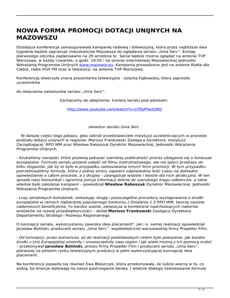 NOWA FORMA PROMOCJI DOTACJI UNIJNYCH NA MAZOWSZU Dzisiejsza konferencja zainaugurowała kampanię radiową i telewizyjną, która przez najbliższe dwa tygodnie będzie zapraszać mieszkańców Mazowsza do oglądania serialu „Unia Serc”. Emisję pierwszego odcinka zaplanowano na 29 września br. Serial będzie można oglądać na antenie TVP Warszawa, w każdy czwartek, o godz. 19.05 i na stronie internetowej Mazowieckiej Jednostki Wdrażania Programów Unijnych www.mazowia.eu. Kampania prowadzona jest na antenie Radia dla Ciebie, radia VOX FM oraz w telewizcji, na antenie TVP Warszawa. Konferencję otworzyła znana prezenterka telewizyjna – Jolanta Fajkowska, która zaprosiła uczestników do obejrzenia zwiastunów serialu „Unia Serc”. Zachęcamy do obejrzenia trailera serialu pod adresem: http://www.youtube.com/watch?v=J7RpPhezU9Q zwiastun serialu Unia Serc W dalszej części tego pokazu, głos zabrali przedstawiciele instytucji uczestniczących w procesie podziału dotacji unijnych w regionie: Mariusz Frankowski Zastępca Dyrektora Instytucji Zarządzającej RPO WM oraz Wiesław Raboszuk Dyrektor Mazowieckiej Jednostki Wdrażania Programów Unijnych. - Szukaliśmy narzędzi, które pozwolą pokazać szerokiej publiczności proces ubiegania się o fundusze europejskie. Formuła serialu pozwoli odejść od filmu instruktażowego, ale nie spłyci przekazu do kilku sloganów, jak by to było w przypadku zastosowania innych form promocji. W tym przypadku potrzebowaliśmy formuły, która z jednej strony zapewni odpowiednią ilość czasu na dokładne opowiedzenie o całym procesie, a z drugiej – zaangażuje widzów i będzie dla nich atrakcyjna. W ten sposób nasz komunikat i ogromna porcja informacji dotrze do szerokiego kręgu odbiorców, a takie właśnie było założenie kampanii – powiedział Wiesław Raboszuk Dyrektor Mazowieckiej Jednostki Wdrażania Programów Unijnych. - Losy serialowych bohaterek, wskazując drogę i poszczególne procedury występowania o środki europejskie w ramach najbardziej popularnego konkursu z Działania 1.5 RPO WM, tworzą swoiste vademecum beneficjenta. To bardzo ważne, zwłaszcza w kontekście nadchodzących naborów wniosków na rozwój przedsiębiorczości – dodał Mariusz Frankowski Zastępca Dyrektora Departamentu Strategii i Rozwoju Regionalnego O koncepcji serialu, wykorzystaniu zjawiska idea placement*, jak i o samej realizacji opowiedział Jarosław Boliński, producent serialu „Unia Serc”, współwłaściciel warszawskiej firmy Propeller Film. - Od koncepcji, przez scenariusz, aż do realizacji podstawowym celem było pokazanie, jak bardzo środki z Unii Europejskiej zmieniły i unowocześniły nasz region i jak wiele można z ich pomocą zrobić – przekonywał Jarosław Boliński, prezes firmy Propeller Film i producent serialu „Unia Serc”, pierwszej na polskim rynku telewizyjnym produkcji w pełni wykorzystującej koncepcję idea placement. Na konferencji pojawiła się również Ewa Błaszczyk, która przekonywała, że ludzie wierzą w to, co widzą, bo emocje wpływają na nasze postrzeganie świata. I właśnie dlatego zastosowanie formuły 1/3 serialu obyczajowego będzie znakomitą platformą dla przekazu informacyjnego. Mówiła także, z własnego doświadczenia, że pomoc uzyskana z RPO przyczynia się do intensyfikacji działań i planów Mazowszan, w tym jej Fundacji. Fabularną osnową scenariusza będzie opowieść o losach mieszkańców województwa. Akcja serialu, losy głównych bohaterów są nierozerwalnie związane z unijnymi funduszami, a specjalnie napisany scenariusz pozwala wplatać wątki promocyjne bez naruszania konstrukcji fabularnej serialu. Wątek fabularny oparty jest na perypetiach dwóch przyjaciółek – Anki i Justyny, które postanowiły wziąć sprawy w swoje ręce i rozwinąć własną firmę z pomocą zewnętrznych środków. Źródłem finansowania inwestycji ma być oczywiście dotacja ze środków Regionalnego Programu Operacyjnego Województwa Mazowieckiego 2007-2013. Dwóch kolejnych bohaterów pracuje w instytucji obsługującej absorpcję środków i właśnie na ich drodze staną wspomniane już bohaterki. Dzięki temu, że serialowe postacie zawodowo związane są z programem RPO WM, projekt zyskał swobodę w pokazywaniu realizowanych lub zakończonych inwestycji. Nic tak dobrze nie wypromuje idei wykorzystania funduszy unijnych, jak przykłady unijnych inwestycji. Serial promuje dobre praktyki i w każdym odcinku „grają” projekty sfinansowane ze środków unijnych. Autorami scenariusza są Katarzyna Stachowicz-Gacek oraz Stanisław Chyla-Smyk. Producentem wykonawczym serialu jest warszawska firma Propeller Film. W główne role wcielili się znani i lubiani aktorzy: Paweł Ławrynowicz, Magdalena Nieć, Joanna Kupińska, Tomasz Mandes, Ryszard Kluge, Maria Niklińska. Do udziału w epizodach zaproszeni zostali m.in. Ewa Błaszczyk, Jolanta Fajkowska, Agnieszka Dulęba-Kasza, Joanna Sydor, Emil Karewicz, Andrzej Precigs, Lech Mackiewicz. ZAŁOŻENIA NADCHODZĄCYCH NABORÓW WNIOSKÓW UNIJNĄ DOTACJĘ: W ostatnim kwartale tego roku Mazowiecka Jednostka Wdrażania Programów Unijnych przeprowadzi nabory z Działania 1.5 RPO WM w trybie konkursu zamkniętego bez preselekcji. W okresie tym ogłoszone zostaną trzy oddzielne konkursy, z podziałem na: -średnie (nabór wniosków: 30.09-14.10.2011r), -małe (nabór wniosków 17.10-02.11.2011r.) i mikroprzedsiębiorstwa (nabór wniosków 04-18.11.2011r.). Łącznie na wsparcie przedsiębiorstw, które złożą prawidłowo przygotowany wniosek aplikacyjny, Zarząd Województwa Mazowieckiego przeznaczył 20 mln euro. W przypadku, gdy konkursy spotkają się z dużym zainteresowaniem, środki finansowe przeznaczone na ich realizację mogą ulec zwiększeniu. RODZAJE PROJEKTÓW: Działania w ramach konkursów ukierunkowane będą na podnoszenie konkurencyjności przedsiębiorstw poprzez realizację nowych inwestycji obejm