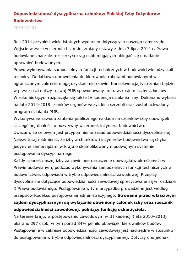 Odpowiedzialność dyscyplinarna członków Polskiej Izby Inżynierów Budownictwa 2014-12-01 Rok 2014 przyniósł wiele istotnych wydarzeń dotyczących naszego samorządu. Wejście w życie w sierpniu br. m.in. zmiany ustawy z dnia 7 lipca 2014 r. Prawo budowlane znacznie rozszerzyło krąg osób mogących ubiegać się o nadanie uprawnień budowlanych. Prawo wykonywania samodzielnych funkcji technicznych w budownictwie odzyskali technicy. Dodatkowo uprawnienia do kierowania robotami budowlanymi w ograniczonym zakresie mogą uzyskać mistrzowie. Konsekwencją tych zmian będzie w przyszłości dalszy rozwój PIIB spowodowany m.in. wzrostem liczby członków. W roku bieżącym rozpoczęła się także IV kadencja działania izby. Dokonano wyboru na lata 2014–2018 członków organów wszystkich szczebli oraz został uchwalony program działania PIIB. Wykonywanie zawodu zaufania publicznego nakłada na członków izby obowiązek szczególnej dbałości o pozytywny wizerunek inżyniera budownictwa. Uważam, że celowym jest przypomnienie zasad odpowiedzialności dyscyplinarnej. Należy tutaj nadmienić, że izby architektów i inżynierów budownictwa są chyba jedynymi samorządami w kraju o skomplikowanym podwójnym systemie postępowania dyscyplinarnego. Każdy członek naszej izby za zawinione naruszenie obowiązków określonych w Prawie budowlanym, podczas wykonywania samodzielnych funkcji technicznych w budownictwie, odpowiada w trybie odpowiedzialności zawodowej. Przepisy dyscyplinarne dotyczące odpowiedzialności zawodowej sprecyzowane są w rozdziale X Prawa budowlanego. Postępowanie w tym przypadku prowadzone jest według przepisów Kodeksu postępowania administracyjnego. Stronami przed właściwym sądem dyscyplinarnym są wyłącznie obwiniony członek izby oraz rzecznik odpowiedzialności zawodowej, pełniący funkcję oskarżyciela. Na terenie kraju, w postępowaniu zawodowym w III kadencji (lata 2010–2013) ukarano 297 osób, w tym ponad 84% pełniło obowiązki kierowników budów. Postępowanie w zakresie odpowiedzialności zawodowej jest nadrzędne w stosunku do postępowania w trybie odpowiedzialności dyscyplinarnej. Dotyczy ono jednak 1 tylko jednego wycinka naszej pracy, a mianowicie wyłącznie nieprzestrzegania Prawa budowlanego podczas pełnienia samodzielnych funkcji technicznych określonych w art. 12 ust. 1 tegoż prawa. Naruszenie pozostałych obowiązków przez członka PIIB, ujętych w art. 41 ustawy z 15 grudnia 2000 r. o samorządach zawodowych architektów oraz inżynierów budownictwa, skutkuje wszczęciem postępowania dyscyplinarnego. Dla przypomnienia, art. 41 zawiera cztery zasady obowiązujące członków izby, a mianowicie: 1) przestrzeganie przy wykonywaniu czynności zawodowych obowiązujących przepisów oraz zasad wiedzy technicznej, 2) przestrzeganie zasad etyki zawodowej, 3) stosowanie się do uchwał organów izby, 4) regularne opłacanie składek członkowskich. Nieprzestrzeganie którejkolwiek z tych zasad może skutkować nałożeniem kary dyscyplinarnej. Tryb postępowania dyscyplinarnego reguluje Rozporządzenie Ministra Infrastruktury z dnia 31 października 2002 r. w sprawie szczegółowych zasad i trybu postępowania dyscyplinarnego w stosunku do członków samorządów zawodowych architektów, inżynierów budownictwa oraz urbanistów. W postępowaniu dyscyplinarnym, oprócz obwinionego i rzecznika odpowiedzialności zawodowej, stroną jest także pokrzywdzony. Inny jest także katalog kar. Art. 54 ust. 1 ustawy samorządowej definiuje cztery rodzaje kar: 1) upomnienie, 2) nagana, 3) zawieszenie na okres do 2 lat w prawach członka izby, 4) skreślenie z listy członków izby. W przypadku orzeczenia którejkolwiek z kar, ukarany dodatkowo może zostać zobowiązany do pokrycia kosztów postępowania. Opłata ta jest zryczałtowana i w zależności od rodzaju nałożonej kary wynosi od 500 do 3000 zł. Co prawda postępowanie dyscyplinarne nie dotyczy przewinień związanych z wykonywaniem samodzielnych funkcji technicznych, niemniej ukaranie karą okresowego zawieszenia w prawach członka lub skreślenia z listy członków izby jest w skutkach tożsame z zakazem wykonywania samodzielnych funkcji technicznych. W latach 2010–2013 karami w trybie odpowiedzialności dyscyplinarnej ukarano 2 ponad 30 osób, co stanowiło około 10% wszystkich ukaranych. Mimo nielicznych przypadków prowadzenia postępowań w tym trybie, zauważa się braki wiedzy o obowiązujących uregulowaniach, wynikających z faktu przynależności do PIIB. Mam nadzieję, że omówienie typowych wykroczeń dyscyplinarnych pozwoli w przyszłości na ich wyeliminowanie. Obowiązek stosowania się do uchwał organów izby oraz regularnego opłacania składek (art. 41 ust. 1 pkt. 3 i 4) nie powinien budzić żadnych wątpliwości. W analizowanym okresie pięć osób zostało ukaranych karą upomnienia i dodatkowo opłatą pieniężną za lekceważenie ww. zasad. We wszystkich przypadkach ukarani, mimo zawieszenia w prawach członka izby oraz braku obowiązkowego ubezpieczenia od odpowiedzialności cywilnej, pełnili samodzielne funkcje techniczne. Pozostałe kary orzeczone w omawianym okresie dotyczyły nieprzestrzegania zasad etyki zawodowej (art. 41 ust. 1 pkt 2). W każdym omawianym przypadku sądy dyscyplinarne stwierdzały naruszenie punktu 2.1. Kodeksu zasad etyki zawodowej PIIB, który mówi, że w swej działalności członek izby kieruje się dobrem publicznym oraz zasadami uczciwości zawodowej i osobistej. Tak też było w przypadku kradzieży materiałów budowlanych z placu budowy przez kierownika robót, a karą było zawieszenia w prawach członka izby. Rozpatrywano cztery przypadki posługiwania się przez członków naszej izby sfałszowanymi uprawnieniami. Dwie osoby zostały ukarane upomnieniem, a pozostali otrzymali kary nagany i zawieszenia w prawach członka izby. Poza niestosowaniem się do zasady ujętej w punkcie 2.1 kodeksu etyki, w pow