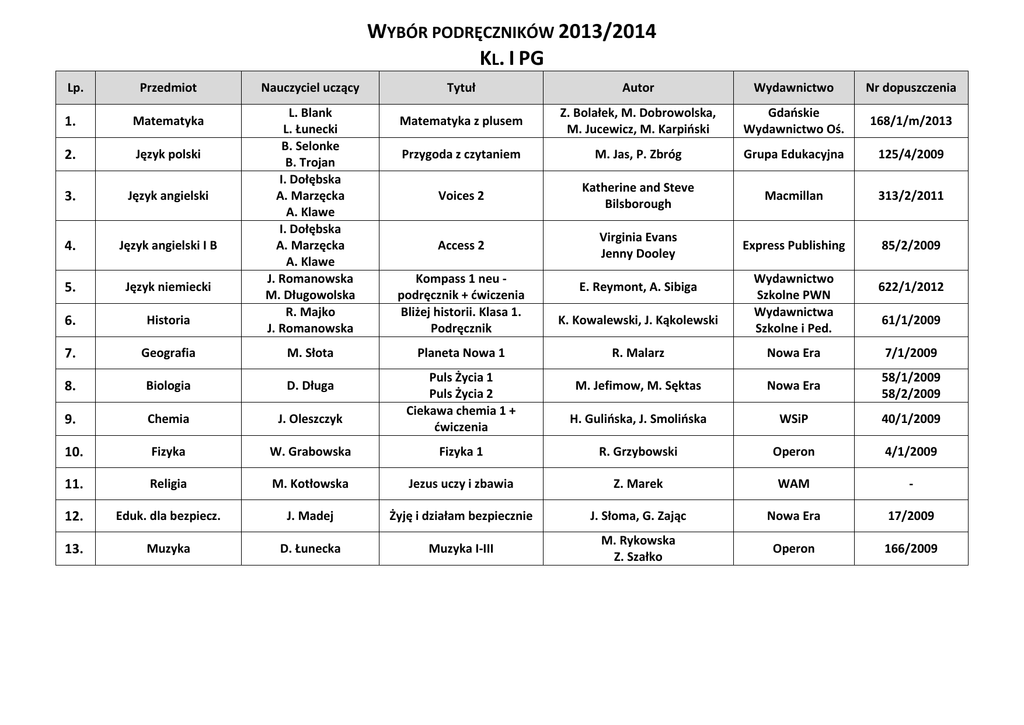 WYBÓR PODRĘCZNIKÓW 2013/2014 KL. I PG Lp. Przedmiot Nauczyciel uczący Tytuł Autor Wydawnictwo Nr dopuszczenia Matematyka z plusem Z. Bolałek, M. Dobrowolska, M. Jucewicz, M. Karpiński Gdańskie Wydawnictwo Oś. 168/1/m/2013 Przygoda z czytaniem M. Jas, P. Zbróg Grupa Edukacyjna 125/4/2009 Voices 2 Katherine and Steve Bilsborough Macmillan 313/2/2011 Access 2 Virginia Evans Jenny Dooley Express Publishing 85/2/2009 L. Blank L. Łunecki B. Selonke B. Trojan I. Dołębska A. Marzęcka A. Klawe I. Dołębska A. Marzęcka A. Klawe J. Romanowska M. Długowolska R. Majko J. Romanowska Kompass 1 neu podręcznik + ćwiczenia Bliżej historii. Klasa 1. Podręcznik Geografia M. Słota Planeta Nowa 1 8. Biologia D. Długa 9. Chemia J. Oleszczyk 10. Fizyka W. Grabowska 11. Religia 12. 13. 1. Matematyka 2. Język polski 3. Język angielski 4. Język angielski I B 5. Język niemiecki 6. Historia 7. E. Reymont, A. Sibiga K. Kowalewski, J. Kąkolewski Wydawnictwo Szkolne PWN Wydawnictwa Szkolne i Ped. 622/1/2012 61/1/2009 R. Malarz Nowa Era 7/1/2009 M. Jefimow, M. Sęktas Nowa Era 58/1/2009 58/2/2009 H. Gulińska, J. Smolińska WSiP 40/1/2009 Fizyka 1 R. Grzybowski Operon 4/1/2009 M. Kotłowska Jezus uczy i zbawia Z. Marek WAM - Eduk. dla bezpiecz. J. Madej Żyję i działam bezpiecznie J. Słoma, G. Zając Nowa Era 17/2009 Muzyka D. Łunecka Muzyka I-III M. Rykowska Z. Szałko Operon 166/2009 Puls Życia 1 Puls Życia 2 Ciekawa chemia 1 + ćwiczenia WYBÓR PODRĘCZNIKÓW 2013/2014 KL. II PG Przedmiot Nauczyciel uczący Tytuł Autor Wydawnictwo Nr dopuszczenia 1. Matematyka L. Blank I. Breczko Matematyka z plusem M. Dobrowolska, M. Jucewicz, M. Karpiński, A. Mysior, K. Zarzycka Gdańskie Wydawnictwa Oś. 168/2/2010 2. Język polski Przygoda z czytaniem M. Jas, P. Zbróg, J. Detka Grupa Edukacyjna 125/5/2010 3. Język angielski New Exam Connections 3 T. Garside, J. SpencerKępczyńska Oxford 259/3/2011/z1 4. Język angielski II B I. Dołębska V. Evans, J. Dooley Express Publishing 85/3/2009 5. Język niemiecki J. Romanowska M. Długowolska E. Reymont, A. Sibiga, M. Jezierska-Niejak Wydawnictwa Szkole PWN 622/2/2012 6. Historia R. Majko K. Kowalewski, J. Kąkolewski WSiP 61/2/2009 7. Geografia M. Słota M. Gembel Planeta Nowa 2 D. Szczypiński, M. Wójtowicz Nowa Era 7/2/2009 8. Biologia D. Długa Puls Życia 2 M. Jefimow Nowa Era 58/2/2009 H. Gulińska, J. Smolińska WSiP 40/2/2009 Lp. B. Selonke B. Trojan A. Klawe I. Dołębska Access 3 + ćwiczenia + Grammar Book Kompass 2 neu podręcznik + ćwiczenia Bliżej historii. Klasa 2. Podręcznik 9. Chemia J. Oleszczyk Ciekawa chemia 1 + ćw Ciekawa chemia 2 + ćw Ciekawa chemia 3 + ćw 10. Fizyka W. Grabowska Fizyka 3 R. Grzybowski Operon 4/3/2011 11. Religia M. Kotłowska Jezus działa i zbawia Z. Marek WAM - 12. Eduk. dla bezpiecz. - - - - - 13. Muzyka - - - - - 14. Wiedza o społecz. R. Majko Wiedza o społeczeństwie cz. 1 E. Dobrzycka, K. Makara Operon 96/1/2009 WYBÓR PODRĘCZNIKÓW 2013/2014 KL. III PG Lp. Przedmiot Nauczyciel uczący L. Blank I. Breczko D. Lange, B. Trojan B. Selonke I. Dołębska, A. Marzęcka, A. Klawe 1. Matematyka 2. Język polski 3. Język angielski 4. Język angielski III A A. Marzęcka 5. Język angielski III B A. Klawe Język niemiecki III A, B Język niemiecki III C, D J. Romanowska M. Długowolska J. Romanowska M. Długowolska R. Majko J. Romanowska 6. 7. Tytuł Autor Wydawnictwo Nr dopuszczenia Matematyka z plusem M. Dobrowolska, M. Jucewicz, M. Karpiński Gdańskie Wydawnictwo Oś. 168/3/2011 Przygoda z czytaniem M. Jas, J. Detka Grupa Edukacyjna SA 125/6/2011 J. Quintana Oxford 349/2011 Oxford 259/3/2011/z1 New Oxford Gimnazjum Expert ćw. (III C/D) New Exam Connections 3 Grammar way 2 (kontynuacja) New Oxford Gimnazjum Expert + ćw. Express Publishing Oxford Wydawnictwo Szkolne PWN Wydawnictwo Szkolne PWN 51/4/2010 Bliżej historii. Klasa 3 Podręcznik T. Garside, J. SpencerKępczyńska J. Dooley, V. Evans, J. Quintana E. Reymont, A. Sibiga, M. Jezierska E. Reymont, A. Sibiga, M. Jezierska K. Kowalewska, J. Kąkolewski WSiP 61/3/2009 Kompass 4 Podręcznik + ćwiczenia Kompass 3 Podręcznik + ćwiczenia 349/2011 51/3/2009 8. Historia 9. Geografia M. Słota Planeta Nowa 3 M. Szubert Nowa Era 7/3/2010 10. Biologia D. Długa Puls Życia 3 B. Sągin, A. Boczarowski Nowa Era 58/3/2010 11. Chemia J. Oleszczyk Ciekawa chemia 3 + ćwiczenia H. Gulińska, J. Smolińska WSiP 40/3/2009 12. Fizyka W. Grabowska Fizyka 1, 2, 3 R. Grzybowski Operon 4/1/2009; 4/2/2010 4/3/2011 13. Religia M. Kotłowska Jezus prowadzi i zbawia Z. Marek WAM - 14. Eduk. dla bezpiecz. - - - - - 15. Muzyka - - - - - 16. Wiedza o społecz. R. Majko Wiedza o społeczeństwie cz. 2 E. Dobrzycka, K. Makara Operon 96/2/2010