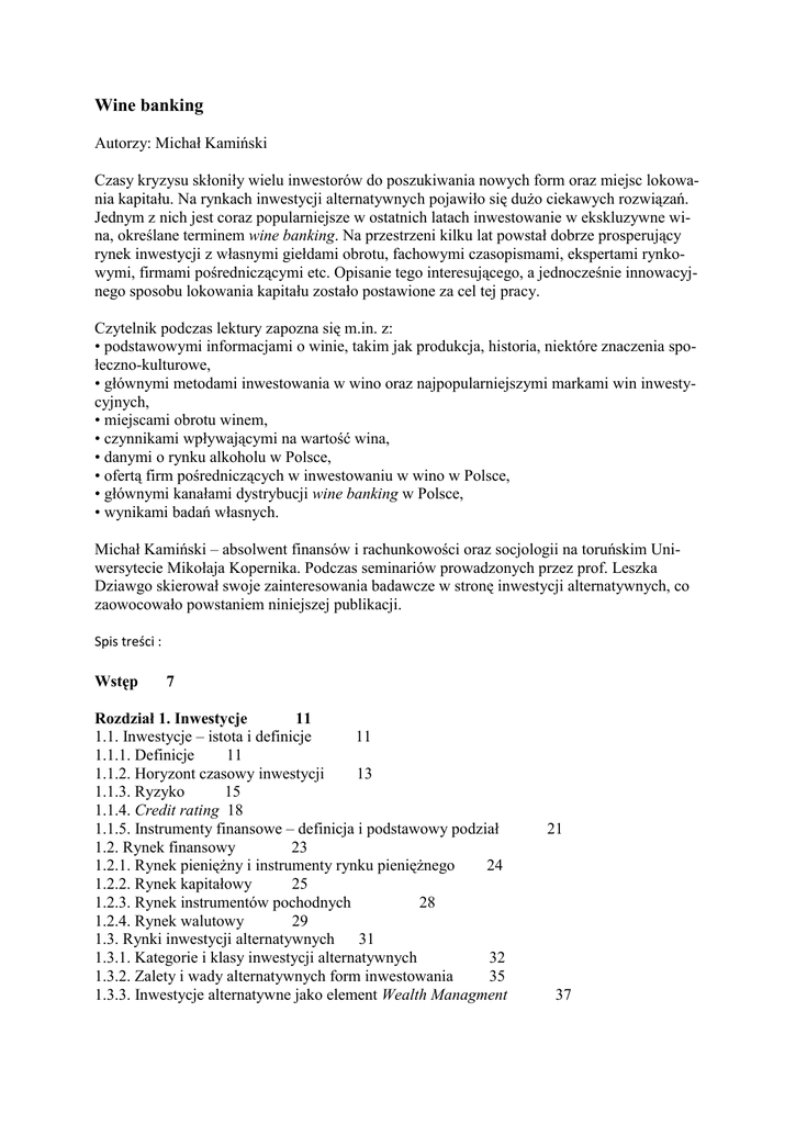 Wine banking Autorzy: Michał Kamiński Czasy kryzysu skłoniły wielu inwestorów do poszukiwania nowych form oraz miejsc lokowania kapitału. Na rynkach inwestycji alternatywnych pojawiło się dużo ciekawych rozwiązań. Jednym z nich jest coraz popularniejsze w ostatnich latach inwestowanie w ekskluzywne wina, określane terminem wine banking. Na przestrzeni kilku lat powstał dobrze prosperujący rynek inwestycji z własnymi giełdami obrotu, fachowymi czasopismami, ekspertami rynkowymi, firmami pośredniczącymi etc. Opisanie tego interesującego, a jednocześnie innowacyjnego sposobu lokowania kapitału zostało postawione za cel tej pracy. Czytelnik podczas lektury zapozna się m.in. z: • podstawowymi informacjami o winie, takim jak produkcja, historia, niektóre znaczenia społeczno-kulturowe, • głównymi metodami inwestowania w wino oraz najpopularniejszymi markami win inwestycyjnych, • miejscami obrotu winem, • czynnikami wpływającymi na wartość wina, • danymi o rynku alkoholu w Polsce, • ofertą firm pośredniczących w inwestowaniu w wino w Polsce, • głównymi kanałami dystrybucji wine banking w Polsce, • wynikami badań własnych. Michał Kamiński – absolwent finansów i rachunkowości oraz socjologii na toruńskim Uniwersytecie Mikołaja Kopernika. Podczas seminariów prowadzonych przez prof. Leszka Dziawgo skierował swoje zainteresowania badawcze w stronę inwestycji alternatywnych, co zaowocowało powstaniem niniejszej publikacji. Spis treści : Wstęp 7 Rozdział 1. Inwestycje 11 1.1. Inwestycje – istota i definicje 11 1.1.1. Definicje 11 1.1.2. Horyzont czasowy inwestycji 13 1.1.3. Ryzyko 15 1.1.4. Credit rating 18 1.1.5. Instrumenty finansowe – definicja i podstawowy podział 1.2. Rynek finansowy 23 1.2.1. Rynek pieniężny i instrumenty rynku pieniężnego 24 1.2.2. Rynek kapitałowy 25 1.2.3. Rynek instrumentów pochodnych 28 1.2.4. Rynek walutowy 29 1.3. Rynki inwestycji alternatywnych 31 1.3.1. Kategorie i klasy inwestycji alternatywnych 32 1.3.2. Zalety i wady alternatywnych form inwestowania 35 1.3.3. Inwestycje alternatywne jako element Wealth Managment 21 37 Rozdział 2. Wino 39 2.1. Historia wina 39 2.2. Podstawowe informacje o winach 42 2.3. Wino jako element kultu 47 2.4. Wino jako środek leczniczy 48 2.5. Wino – symbol biedy i marginalizacji społecznej 2.6. Badanie postrzegania wina w polskim społeczeństwie 2.6.1. Metodologia badania 52 2.6.2. Wyniki badania 53 50 52 Rozdział 3. Wine banking – charakterystyka inwestycji 61 3.1. Wina inwestycyjne 62 3.2. Metody inwestycji w wino 65 3.2.1. Zakup wina en primeur 66 3.2.2. Zakup wina w skrzynkach 66 3.2.3. Fundusze wina 69 3.2.4. Zakup winnicy 70 3.3. Miejsca obrotu winem inwestycyjnym 71 3.3.1. The London International Vintners Exchange (Liv-ex) – giełda rynku win 3.3.2. Aukcje win 75 3.4. Cechy wine banking 77 3.4.1. Cechy wine banking a cechy charakterystyczne dla rynków alternatywnych 3.4.2. Ceny wina 80 3.4.3. Robert Parker – guru rynku wine banking 87 3.4.4. International Wine Challenge 93 3.4.5. Chiny a wine banking 95 3.5. Enoturystyka 97 3.6. Patologie na rynku win 101 Rozdział 4. Wine banking na polskim rynku inwestycyjnym 4.1. Rynek wina w Polsce 105 4.1.1. Rynek wyrobów alkoholowych 106 4.1.2. Rynek wina w Polsce 109 4.2. Polski rynek wine banking 116 4.2.1. Stilnovisti 116 4.2.2. Weath Solutions 118 4.2.3. Wine Advisor 119 4.3. Kanały dystrybucji wine banking 121 Zakończenie Bibliografia Spis tabel Spis wykresów Spis rycin 123 125 130 131 132 105 72 78