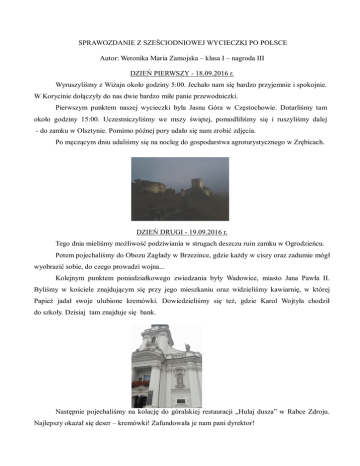 SPRAWOZDANIE Z SZEŚCIODNIOWEJ WYCIECZKI PO POLSCE Autor: Weronika Maria Zamojska – klasa I – nagroda III DZIEŃ PIERWSZY - 18.09.2016 r. Wyruszyliśmy z Wiżajn około godziny 5:00. Jechało nam się bardzo przyjemnie i spokojnie. W Korycinie dołączyły do nas dwie bardzo miłe panie przewodniczki. Pierwszym punktem naszej wycieczki była Jasna Góra w Częstochowie. Dotarliśmy tam około godziny 15:00. Uczestniczyliśmy we mszy świętej, pomodliliśmy się i ruszyliśmy dalej - do zamku w Olsztynie. Pomimo późnej pory udało się nam zrobić zdjęcia. Po męczącym dniu udaliśmy się na nocleg do gospodarstwa agroturystycznego w Zrębicach. DZIEŃ DRUGI - 19.09.2016 r. Tego dnia mieliśmy możliwość podziwiania w strugach deszczu ruin zamku w Ogrodzieńcu. Potem pojechaliśmy do Obozu Zagłady w Brzezince, gdzie każdy w ciszy oraz zadumie mógł wyobrazić sobie, do czego prowadzi wojna... Kolejnym punktem poniedziałkowego zwiedzania były Wadowice, miasto Jana Pawła II. Byliśmy w kościele znajdującym się przy jego mieszkaniu oraz widzieliśmy kawiarnię, w której Papież jadał swoje ulubione kremówki. Dowiedzieliśmy się też, gdzie Karol Wojtyła chodził do szkoły. Dzisiaj tam znajduje się bank. Następnie pojechaliśmy na kolację do góralskiej restauracji „Hulaj dusza” w Rabce Zdroju. Najlepszy okazał się deser – kremówki! Zafundowała je nam pani dyrektor! DZIEŃ TRZECI - 20.09.2016 r. Wyspani i pełni energii po pysznym śniadaniu ruszyliśmy w drogę nad Morskie Oko. Podczas 9-kilometrowej drogi do tego pięknego miejsca podziwialiśmy m.in. Wodogrzmoty Mickiewicza, Tatry oraz bardzo bogatą roślinność. Mogliśmy również zobaczyć i utrwalić sobie, czym charakteryzują się poszczególne piętra gór (czyli to wszystko, co mieliśmy na lekcjach biologii). Szliśmy szybkim, równym tempem, dzięki czemu dotarliśmy do celu w niecałe trzy godziny. A tam... zobaczyliśmy cudowne Tatry! Były widoczne, mimo lekkiej mgły, a tuż na dole wzrok przyciągało magiczne i tajemnicze Morskie Oko. Pijąc gorącą, rozgrzewającą czekoladę, chłonęliśmy piękne widoki, ale... trzeba było wracać do autobusu... Wyruszyliśmy do Zakopanego. Tam wjechaliśmy na Gubałówkę i przeszliśmy się po Krupówkach. Pełni wrażeń i „trochę” zmęczeni zjechaliśmy do dużego drewnianego schroniska. Znajdowało się ono na samej granicy ze Słowacją. Góry, góry i jak to w górach – pokoje na piętrach. Mój był na czwartym. Ale za to miałam widok na piękne Pieniny oraz urokliwy Dunajec. DZIEŃ CZWARTY - 20.09.2016 r. Ten dzień był jednym z najbardziej intensywnych podczas całej wycieczki! Z samego rana ruszyliśmy na Trzy Korony. Nie przeszkadzała nam deszczowa pogoda. „Szliśmy dzielnie, jak prawdziwi rycerze” - to słowa pani przewodnik. Po zejściu ze szczytu każdy był przemarznięty, ale i bardzo dumny z tego, że zdobył niełatwy szczyt. Ruszyliśmy następnie podziwiać krakowskie ulice, Wawel, Barbakan i Stare Miasto. Dotknęliśmy serca Dzwonu Zygmunta i pomyśleliśmy życzenie (z nadzieją, że się spełni), chodziliśmy po urokliwym Rynku Jagiellońskim i zobaczyliśmy zabytkowy Kościół Mariacki. Po zwiedzeniu Krakowa pojechaliśmy do Kopalni Soli w Wieliczce. Schodziliśmy ponad 800 schodów w dół, aby podziwiać cudowny Kościół św. Kingi, dowiedzieć się więcej na temat tego miejsca oraz zobaczyć dawne, drewniane „maszyny”, którymi ludzie wydobywali surowiec na górę. Nie zabrakło również śmiechu po tym, jak pani przewodniczka powiedziała: „Każdy z was może zlizać kilogram soli”. Bardzo komicznie wyglądało, gdy nasi koledzy zaczęli lizać solne ściany kopalni. Do hotelu przyjechaliśmy około godziny 23:00. Zjedliśmy znowu (!) zupę pomidorową i każdy ze zmęczenia poszedł od razu spać. DZIEŃ PIĄTY - 22.09.2016 r. W przedostatni dzień wycieczki spacerowaliśmy po Ojcowskim Parku Narodowym. Widzieliśmy Maczugę Herkulesa, podziwialiśmy duże zamki w Ojcowie i Pieskowej Skale oraz wypiliśmy wodę ze Źródła Miłości. Następnie pojechaliśmy do jaskini „Raj”, w której przypomnieliśmy sobie, co to są stalagmity, stalaktyty, stalagnaty i... mogliśmy je zobaczyć na żywo. Dowiedzieliśmy się również wiele na temat pierwszych ludzi, czyli jak wyglądali, jakich narzędzi używali oraz jak radzili sobie, aby przetrwać. Na koniec, z racji tego, że pogoda nam dopisywała, weszliśmy jeszcze na Łysicę – czyli najwyższy szczyt Gór Świętokrzyskich (611,8m n.p.m.). Zmęczeni zajechaliśmy na kolację, gdzie znowu był kotlet schabowy (!). DZIEŃ SZÓSTY - 23.09.2016 r. Pierwszym punktem tego dnia była neolityczna kopalnia krzemienia pasiastego w Krzemionkach Opatowskich. Następnie ruszyliśmy w stronę Kazimierza Dolnego. Weszliśmy na Górę Trzech Krzyży, przespacerowaliśmy się po rynku miasta oraz kupiliśmy słynne koguciki. Potem przeszliśmy na zamek Kazimierza Wielkiego, gdzie nasza pani przewodniczka, przebrana za królową Jadwigę każdego z nas pasowała na Rycerza Turystyki. Podczas drogi wspominaliśmy tę niesamowitą sześciodniową przygodę..., śpiewaliśmy piosenki trochę z radości, ale też i z żalu, bo nigdy nie wiemy, kiedy tam powrócimy... Do Wiżajn wróciliśmy około godziny 3:00. Dni wycieczki minęły bardzo szybko i niesamowicie. Każdego ranka wstawaliśmy radośni, bo wiedzieliśmy, że mimo deszczowej i pochmurnej pogody, zawsze czekało na nas wiele atrakcji. Codziennie miały miejsce sytuacje bardzo śmieszne i takie, których na pewno nie zapomnę... Obrazki z tej wycieczki na długo pozostaną w mojej pamięci.