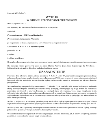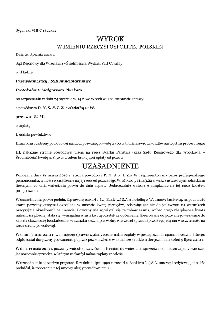 Sygn. akt VIII C 1822/13 WYROK W IMIENIU RZECZYPOSPOLITEJ POLSKIEJ Dnia 24 stycznia 2014 r. Sąd Rejonowy dla Wrocławia - Śródmieścia Wydział VIII Cywilny w składzie : Przewodniczący : SSR Anna Martyniec Protokolant: Małgorzata Pluskota po rozpoznaniu w dniu 24 stycznia 2014 r. we Wrocławiu na rozprawie sprawy z powództwa P. N. S. F. I. Z. z siedzibą w W. przeciwko W. M. o zapłatę I. oddala powództwo; II. zasądza od strony powodowej na rzecz pozwanego kwotę 2 400 zł tytułem zwrotu kosztów zastępstwa procesowego; III. nakazuje stronie powodowej uiścić na rzecz Skarbu Państwa (kasa Sądu Rejonowego dla Wrocławia – Śródmieścia) kwotę 418,50 zł tytułem brakującej opłaty od pozwu. UZASADNIENIE Pozwem z dnia 18 marca 2010 r. strona powodowa P. N. S. F. I. Z.w W., reprezentowana przez profesjonalnego pełnomocnika, wniosła o zasądzenie na jej rzecz od pozwanego W. M.kwoty 11.143,22 zł wraz z ustawowymi odsetkami liczonymi od dnia wniesienia pozwu do dnia zapłaty. Jednocześnie wniosła o zasądzenie na jej rzecz kosztów postępowania. W uzasadnieniu pozwu podała, iż pozwany zawarł z (...) Bank (...) S.A. z siedzibą w W. umowę bankową, na podstawie której pozwany otrzymał określoną w umowie kwotę pieniędzy, zobowiązując się do jej zwrotu na warunkach precyzyjnie określonych w umowie. Pozwany nie wywiązał się ze zobowiązania, wobec czego niespłacona kwota należności głównej stała się wymagalna wraz z kwotą odsetek za opóźnienie. Skierowane do pozwanego wezwanie do zapłaty okazało się bezskuteczne, w związku z czym pierwotny wierzyciel sprzedał przysługującą mu wierzytelność na rzecz strony powodowej. W dniu 13 maja 2010 r. w niniejszej sprawie wydany został nakaz zapłaty w postępowaniu upominawczym, którego odpis został doręczony pozwanemu poprzez pozostawienie w aktach ze skutkiem doręczenia na dzień 9 lipca 2010 r. W dniu 13 maja 2013 r. pozwany wniósł o przywrócenie terminu do wniesienia sprzeciwu od nakazu zapłaty, wnosząc jednocześnie sprzeciw, w którym zaskarżył nakaz zapłaty w całości. W uzasadnieniu sprzeciwu przyznał, iż w dniu 1 lipca 1999 r. zawarł z Bankiem (...) S.A. umowę kredytową, jednakże podniósł, iż roszczenia z tej umowy uległy przedawnieniu. W uzasadnieniu wniosku o przywrócenie terminu wskazał, iż o wydanym nakazie zapłaty dowiedział się dopiero w dniu 7 maja 2013 r., albowiem w okresie, w którym wydany został nakaz zapłaty był w fazie nawrotu choroby alkoholowej. Nie był w stanie pokierować swoim postępowaniem oraz rozeznać się co do czasu i miejsca, w jakim się znajduje. Postanowieniem wydanym na rozprawie w dniu 11 października 2013 r. Sąd przywrócił pozwanemu termin do wniesienia sprzeciwu od nakazu zapłaty. W piśmie procesowym z dnia 31 października 2013 r. strona powodowa wskazała, iż bieg terminu przedawnienia został przerwany, albowiem pierwotny wierzyciel w dniu 19 grudnia 2001 r. wystawił bankowy tytuł egzekucyjny, któremu w dniu 20 marca 2002 r. nadana została klauzula wykonalności, a następnie w dniu 19 sierpnia 2002 r. złożył wniosek o wszczęcie postępowania egzekucyjnego, które umorzone zostało z wniosku wierzyciela w 2009 r. W piśmie procesowym z dnia 13 listopada 2013 r. pozwany podniósł, iż strona powodowa nie wykazała, iż przysługuje jej legitymacja czynna do występowania w niniejszym procesie. Sąd ustalił następujący stan faktyczny W dniu 1 lipca 1999 r. pozwany W. M. zawarł z (...) S.A. z siedzibą w W. umowę kredytu. Na jej podstawie pozwanemu udzielony został kredyt w wysokości 3.000 zł, który wraz z odsetkami pozwany obowiązany był spłacić w 47 ratach miesięcznych. W umowie zastrzeżono, iż w przypadku nie zapłacenia przez kredytobiorcę dwóch kolejnych rat (...) wypowie umowę. Dowód: • Umowa nr (...) k. 91-93. Pismem z dnia 1 marca 2000 r. (...) poinformowała pozwanego, iż wypowiada umowę kredytu nr 206-114/60(...)-99/404, z powodu braku spłaty wymagalnych rat kredytu. Dowód: • Pismo z dnia 1 marca 2000 r. k. 94. W dniu 19 grudnia 2001 r. (...) S.A. wystawiła bankowy tytuł egzekucyjny, w którym stwierdzono, iż na zadłużenie W. M. z tytułu umowy kredytu nr 206-114/60- (...)-99/404/WR3 składają się następujące kwoty: 2.855,53 zł z tytułu należności głównej, 2.074,63 zł z tytułu odsetek oraz 13,65 zł z tytułu niespłaconych kosztów. Dowód: • Bankowy tytuł egzekucyjny nr 449/01 k. 95-96. Postanowieniem Sądu Rejonowego dla Wrocławia – Śródmieścia z dnia 20 marca 2002 r. wskazanemu bankowemu tytułowi egzekucyjnemu nadana została klauzula wykonalności. Dowód: • Odpis postanowienie z dnia 20 marca 2002 r. k. 97-98. Pismem z dnia 19 sierpnia 2002 r. (...) Bank (...) S.A. wniosła do Komornika Sądowego Rewiru V przy Sądzie Rejonowym dla Wrocławia – Śródmieścia o wszczęcie, na podstawie bankowego tytułu egzekucyjnego numer 449/01, postępowania egzekucyjnego przeciwko W. M.. Dowód: • Pismo z dnia 19 sierpnia 2002 r. k. 99-101. Postanowieniem z dnia 16 września 2002 r. Komornik Sądowy Rewiru V przy Sądzie Rejonowym dla Wrocławia Śródmieścia stwierdził swoją niewłaściwość do dalszego prowadzenia postępowania egzekucyjnego i sprawę egzekucyjną KM 1236/02 przekazał Komornikowi Sądowemu Rewiru IX przy Sądzie Rejonowym dla Wrocławia – Śródmieścia. Dowód: • Postanowienie z dnia 16 września 2002 r. k. 102. Pismem z dnia 9 czerwca 2009 r. (...) S.A. wniosła o umorzenie postępowania egzekucyjnego prowadzonego przeciwko W. M., sygn. akt IX KM 1553/02. Dowód: • Pismo z dnia 9 czerwca 2009 r. k. 103. Pozwany cierpi na chorobę alkoholową. Nie pije alkoholu. W 2010 r. u pozwanego trwała faza ostrego nawrotu tej choroby. Znajdował się w stanie apatii, obojętności, frustracji, agresji przeplatanej atakami okropnego lęku, przestał normalnie funkcjonować, nie odbierał telefonów i z nikim się nie konta