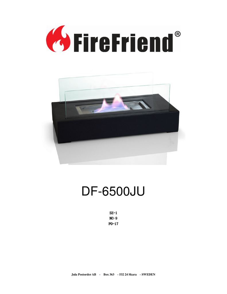 DF-6500JU SESE-1 NONO-9 POPO-17 Jula Postorder AB - Box 363 - 532 24 Skara - SWEDEN BIOETANOL-ELDSTAD ●Bränsle: bio-etanol. ●Maxfyllnad: 0,3 l bio-etanol. ●Minimiavstånd 1 m från brännbara föremål. ●Minsta rumsvolym 66 m3 ●Maximal brinntid: 1 timme Varning: • • • • • • Var god följ alla tillämpliga nationella såväl som lokala föreskrifter som gäller för den här typen av enheter när du använder bioetanol-eldstaden. Se till att ha öppna fönster när du använder bioetanol-eldstaden. Tänd inte enheten om den fortfarande är varm. Enhetens utförande och konstruktion får inte ändras. Endast reservdelar godkända av tillverkaren får användas. Om ventilationen är tillräcklig kan samtidig användning av flera enheter tillåtas. Fyll inte på etanolbränsle när elden är igång. Fyll inte på etanolbränsle när eldstaden fortfarande är varm. Använd endast bio-etanol med ett minimum alkoholinnehåll av 95 % Bioetanol-eldstaden är en miljövänlig eldstad som kan sättas var som helst i huset. Man kan njuta av en riktig eld utan att behöva installera en skorsten. Eftersom bio-etanol brinner praktiskt taget utan utsläpp är ventilation genom ett öppet fönster i de flesta fall tillräckligt i ett rum av lämplig storlek. Var god läs igenom bruksanvisningen före användning av eldstaden och förvara den sedan säkert. Bruksanvisningen packas med produkten när den vidarebefordras till andra. Tillverkaren och importören åtar sig inget ansvar ifall instruktionerna i bruksanvisningen inte har följts! Vänligen observera att någon alltid måste vara närvarande när eldplatsen är igång. 1 DF-6500 Montering Observera: sätt aldrig branddelen I eldplatsen när den är full då detta kan leda till att bio-etanol oavsiktligt spiller över till delar av produkten eller dess omedelbara närhet. 1. Sätt säkerhetsfacket 2. Sätt noggrant glasen och brännaren i eldstadens hölje . i de avsedda öppningarna. 3. Ha alltid enheten placerad på en slät och jämn yta. 4. Plattformen för anordningen måste hålla för minst 10 kg. Om den ej klarar 10 kg så krävs ytterligare stöd. Tillsättande av bio-etanol till eldstaden Ta ej ut fibern! Fibern absorberar etanolbränsle långsamt, så var god häll långsamt etanolbränslet i tratten. Bio-etanolet bör vara påfyllt till mindre än 80 % (omkring 0,3 liter)! 1. Ta ej ut fibern. 2. Använd tratten för att hälla alkokolbränsle i brännaren . 3. Bio-etanolinnehållet I brännaren bör vara mindre än 80 %. ※Fibern absorberar etanolbränsle långsamt, så var god häll långsamt etanolbränslet i tratten. 2 Tändning av bioetanol-eldstad 1. Antänd brännaren efter att denna har fyllts med en tillräcklig mängd bio-etanol 2. Tänd aldrig elden ovanifrån; den bör tändas från sidan. Hastigt uppflammande eller hoppande lågor kan annars uppstå. Tillförsäkra ett säkert avstånd från anordningen. 3. Eldstaden får endast användas i rum av lämplig storlek. Rummets storlek bör vara minst 66 m³, vilket motsvarar en golvyta på 30 m² och en höjd på 2,20 m. 4. Säkerställ även att eldstaden ej placeras på värmekänsliga eller antändliga baser och att ingen ackumulering av värme kan ske på väggar och tak. Säkerställ för detta ändamål att avståndet mellan anordningen och taket är minst 1,8 meter. 5. Var god håll minst 1 meters avstånd från antändningsbara material eller föremål. Observera: om du inte har kunnat antända bio-etanolet i eldutrymmet efter upprepade försök så är det möjligt att en betydande mängd alkohol redan har avdunstat och därmed har minskat dess antändbarhet. I så fall så bör ni vänta ett par minuter och därefter kassera bioetanolet i branddelen. Kassera det vid en återvinningsstation. 3 Släckning av eldstad Förbjudet att släcka eldstaden med vatten! Sätt eldsläckaren direkt över elden under minst 1 minut för att släcka elden Det är bäst att låta eldutrymmet brinna till dess att bio-etanolet helt har förbrukats, så att återantändning av bio-etanolet är tillräckligt säkert . Vidare så skulle detta också förhindra att lukten av alkohol sprids i rummet. Sätt eldsläckaren direkt över elden under minst 1 minut för att släcka elden. Påfyllning och återantänding av eldstaden Förbjudet att tillsätta bio-etanol till en aktiv eld eller till eldutrymmet om det fortfarande är varmt!!! Avsvalningstid 15 minuter 1. Följ stegen i ”släckning av eldstad” innan ni fyller på etanolbränsle. 2. Eldstaden måste svalna under minst 15 minuter med brännaren stängd efter det att elden har slocknat eller har förbrukats i enlighet med ”Släckning av bio-etanol”. 3. Fyll därefter på brännaren (se ”Tillsättning av bio-etanol” för detta) 4. Antänd bio-etanolet som beskrivet i ”Antändning av bio-etanol”. 4 Oavsiktlig påverkan inträffar Avsvalningstid 15 minuter Måste kontrollera och kassera etanolrester kvar i säkerhetsdelen. alla 1. Följ stegen i ”släckning av eldstad”. 2. Tillåt eldstaden att kylas av under minst 15 minuter med brännaren stängd efter det att elden har släckts eller har tagit slut som beskrivet under ”Släckning av bio-etanol”. 3. Måste kontrollera och kassera alla etanolrester kvar i säkerhetsdelen. 4. Fyll därefter på brännaren (se ”Tillsättning av bio-etanol” för detta). 5. Antänd bio-etanolet som beskrivet i ”Antändning av bio-etanol” Säkerhetsanvisningar Enheten är konstruerad för följande ändamål: • Etanol-eldstaden är endast avsedd som dekoration och ska inte användas som värmekälla. • Produkten är avsedd för privat bruk och inte för kommersiellt bruk. • Hur produkten används beskrivs i bruksanvisningen. Den är inte lämplig för annan användning. • Produkten är endast avsedd för eldning med bioetanol, eldning av andra material är förbjuden. 5 Risk för skada & hygienanvisningar • • • • • • • • • Håll el