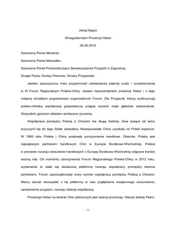 Jiang Deguo Wicegubernator Prowincji Hebei 29.06.2015 Szanowny Panie Ministrze Szanowny Panie Marszałku Szanowny Panie Przewodniczący Stowarzyszenia Przyjaźni z Zagranicą; Drogie Panie, Drodzy Panowie, Drodzy Przyjaciele: Jestem zaszczycony mieć przyjemność odwiedzenia pięknej Łodzi i uczestniczenia w III Forum Regionalnym Polska-Chiny. Jestem reprezentantem prowincji Hebei i z tego miejsca chciałbym pogratulować organizatorom Forum. Dla Przyjaciół, którzy podtrzymują polsko-chińską współpracę gospodarczą pragnę wyrazić moje głębokie zadowolenie. Wszystkim gościom składam serdeczne życzenia. Współpraca pomiędzy Polską a Chinami ma długą historię. Dwa tysiące lat temu przyczynił się do tego Szlak Jedwabny. Nowopowstałe Chiny uzyskały od Polski wsparcie. W 1950 roku Polska i Chiny podpisały porozumienie handlowe. Obecnie, Polska jest największym partnerem handlowym Chin w Europie Środkowo-Wschodniej. Polska w procesie rozwoju stosunków handlowych z Europą Środkowo-Wschodnią odgrywa bardzo ważną rolę. Od momentu zainicjowania Forum Regionalnego Polska-Chiny w 2012 roku, wydarzenie to stało się skuteczną platformą rozwoju współpracy pomiędzy dwoma państwami. Forum zapoczątkowało nowy wymiar współpracy pomiędzy Polską a Chinami. Mamy zamiar skorzystać z tej platformy w celu pogłębienia wzajemnego zrozumienia, zacieśnienia przyjaźni, rozwoju dalszej współpracy. Prowincja Hebei na terenie Chin północnych jest ważną prowincją. Otacza stolicę Pekin, -1- miasto Tianjin, znajduje się bezpośrednio przy Zatoce Pohaj. Prowincję Hebei charakteryzuje dogodne położenie geograficzne, dogodne rozwiązania telekomunikacji transportowej, długoletnia historia również w aspektach kulturalnych. Położenie prowincji Hebei ma znaczenie strategiczne, obok stolicy – Pekinu, miasta Tianjin, zatoki Pohaj. Pozwala ono nam na stanie się prowincją pełną wigoru, witalności i najbardziej obiecującym obszarem Chin. Chiny wdrożyły strategie gospodarcze: „Szlaku Jedwabnego” i „Szlaku Jedwabnego Pasa Morskiego 21 wieku” w celu pogłębiania wzajemnie korzystnej współpracy regionalnej miedzy prowincją Hebei a Polską. Dodatkowo strategie przyniosły historycznie rzadką szansę zarówno dla Polski, jak i prowincji Hebei. Prowincja Hebei pragnie pogłębiać współpracę regionalną z Polską, powiększyć skalę wymiany handlowej, czynionych inwestycji, i z korzyścią dla obu stron rozwijać współpracę w wielu obszarach. Korzystając z okazji, przedstawię cztery propozycje współpracy w aspekcie praktycznym. (1) Praktyczna współpraca w zakresie rozwoju przemysłowego. Polska jako ważny kraj Europy Środkowo-Wschodniej posiada unikalne położenie geograficzne, dobrze rozwiniętą komunikację transportową, sprawne rozwiązania logistyczne. Prowincja Hebei posiada pewne zalety w branżach takich jak: produkcja stali, przemysł petrochemiczny, przemysł lekki, produkcja materiałów budowlanych, produkcja wyposażenia, produkcja nowej energii fotowoltaicznej. Władze prowincji Hebei będą wspierać rodzime przedsiębiorstwa z wymienionych branż w zakresie dokonania inwestycji w Polsce, ustanowienia bazy produkcyjnej, marketingowej i sieci dystrybucyjnej, zarówno w Polsce jak i na świecie. (2) Praktyczna współpraca w zakresie infrastruktury. Prowincja Hebei ma pewne zalety w zakresie zastosowania technologii w infrastrukturze, zarządzania projektami i ich -2- finansowania. Istnieje duża liczba firm z doświadczeniem w tej dziedzinie. Jesteśmy gotowi do zacieśniania współpracy z krajami Europy Środkowo-Wschodniej w zakresie projektów związanych z budową sieci energetycznych, elektrowni fotowoltaicznych, dróg, kolei, gazu miejskiego, mostów, portów, ropociągów, wydobycie złóż i w innych dziedzinach. (3) Praktyczna współpraca w zakresie budownictwa miejskiego. W prowincji Hebei znajduje się 11 średnich i dużych miast; Pekin i Tianjin stanowią ważną część aglomeracji miejskiej. Obecnie prowincja skupia się na promocji nowego procesu urbanizacyjnego. Chcemy rozwijać współpracę z polskimi miastami, wymieniać się doświadczeniami w zakresie planowania przestrzennego i zarządzania projektami budowlanymi również eco cities. (4) Praktyczna współpraca w zakresie kultury. Prowincja Hebei wspiera współpracę w zakresie kultury, edukacji, turystyki, sportu, np. w zakresie współpracy szkół, wymiany w zakresie sportu. Prowincja Hebei pragnie promować znaczące postępy w zakresie projektów współpracy. Panie i Panowie, rząd prowincji Hebei konsekwentnie opowiada się za pogłębianiem współpracy i przyjaźni z Polską. Chcielibyśmy skorzystać z okazji i podjąć skuteczne działania w celu wsparcia przedsiębiorstw chińskich w podjęciu projektów inwestycyjnych w Polsce. „Działanie jest lepsze niż tysiąc słów”. Nasza gotowość do współpracy musi być poparta działaniem zarówno rządu jak i biznesu. Jesteśmy przekonani, że dzięki wspólnym wysiłkom współpraca prowincji Hebei z Polską będzie się rozwijać z obopólnymi korzyściami. Dziękuję wszystkim za uwagę! -3-