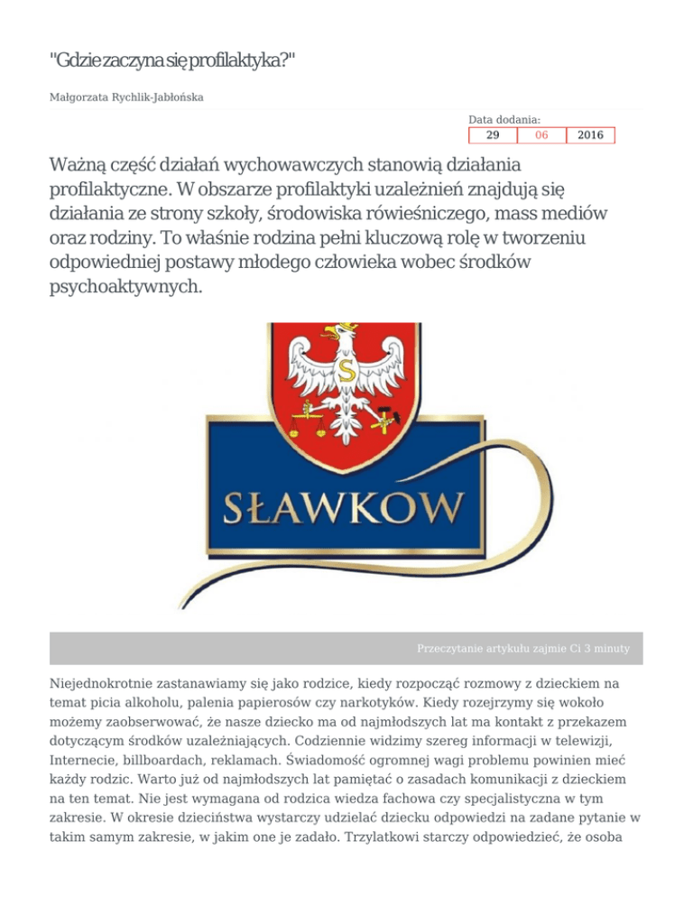 "Gdziezaczynasięprofilaktyka?" Małgorzata Rychlik-Jabłońska Data dodania: 29 06 2016 Ważną część działań wychowawczych stanowią działania profilaktyczne. W obszarze profilaktyki uzależnień znajdują się działania ze strony szkoły, środowiska rówieśniczego, mass mediów oraz rodziny. To właśnie rodzina pełni kluczową rolę w tworzeniu odpowiedniej postawy młodego człowieka wobec środków psychoaktywnych. Przeczytanie artykułu zajmie Ci 3 minuty Niejednokrotnie zastanawiamy się jako rodzice, kiedy rozpocząć rozmowy z dzieckiem na temat picia alkoholu, palenia papierosów czy narkotyków. Kiedy rozejrzymy się wokoło możemy zaobserwować, że nasze dziecko ma od najmłodszych lat ma kontakt z przekazem dotyczącym środków uzależniających. Codziennie widzimy szereg informacji w telewizji, Internecie, billboardach, reklamach. Świadomość ogromnej wagi problemu powinien mieć każdy rodzic. Warto już od najmłodszych lat pamiętać o zasadach komunikacji z dzieckiem na ten temat. Nie jest wymagana od rodzica wiedza fachowa czy specjalistyczna w tym zakresie. W okresie dzieciństwa wystarczy udzielać dziecku odpowiedzi na zadane pytanie w takim samym zakresie, w jakim one je zadało. Trzylatkowi starczy odpowiedzieć, że osoba która bierze narkotyki lub pije dużo alkoholu jest bardzo chora, bo te substancje niszczą mózg i cały organizm. Dziecko zapamięta tą informację, że narkotyk czy alkohol to nic przyjemnego. Wykorzystując odpowiednie sytuacje do przekazania tych informacji, tłumaczymy dziecku to w taki sam sposób jak tłumaczymy np. skąd się bierze śnieg, nie przekazując jednocześnie zbędnych emocji. Tym sposobem uczestniczymy w procesie „oswajania” się naszego dziecka z rozmowami na ten temat i w przyszłości będzie to znacznie łatwiejsze. W okresie dojrzewania rozmowy z własnym dzieckiem nie należą do najłatwiejszych. Głównym powodem tej sytuacji jest to, że jest to okres przejściowy dla młodego człowieka. Nie jest już dzieckiem, ale też jeszcze nie jest dorosłym człowiekiem. Zmiany cechują każdą sferę jego życia. Od fizyczności po poglądy na świat i samego siebie. Ten proces nazywamy dojrzewaniem. Młody człowiek przygotowuje się do nowych ról, uczy się spełniać oczekiwania otoczenia, wyznacza swoje cele. Okres dojrzewania dzieli się na dwa etapy. Pierwszy z nich nazwany dorastaniem wczesnym miedzy 10-12 do około 16 roku życia. Jest to okres dynamicznych przemian. Wszystko co do tej pory było znane przestaje działać, a nic nowego się nie pojawia. Radykalnie zmienia się ciało, wywołując burze zmiennych odczuć. Rozpoczyna się walka o samodzielność i niezależność, ale w parze z nimi idzie dość duże zagubienie. Sposób myślenia ulega zmianie. Młody człowiek kształtuje swoją umiejętność formułowania logicznych wniosków. Rodzic jest nadal ważny, ale młody człowiek zaczyna szukać innych źródeł informacji. Drugą fazę (16 do 20 rok życia) cechuje pojawienie się trudnych pytań związanych z własnym istnieniem, sensem życia itp. Nastolatek sam uważa się za dorosłego, jednak nie jest jeszcze tak traktowany. Obowiązki ma już jak osoba dorosła, choć jeszcze często prawa dziecka. W tym okresie pojawia się silna potrzeba akceptacji, która wywołuje potrzebę poszukiwania osób podobnych sobie. Jest to czas poszukiwań, w którym tworzyć zaczyna się tożsamość człowieka. Niesie to ze sobą duże niebezpieczeństwa. Zmiany, które zachodzą w ciałach nastolatków powodują duże napięcia. Wydzielanie dużych ilości hormonów jest głównym powodem zachowań agresywnych, chwilami braku panowania nad sobą, dużej niecierpliwości i drażliwości młodego człowieka. Związane z tym jest również nasilenie się występowania zachowań ryzykownych. Dużo napięć i niepokojów przynosi postrzeganie własnego ciała. Kreowanemu przez mass media kultowi idealnego ciała nie jest łatwo sprostać. Szczególnie kiedy własne ciało potrafi zaskakiwać. Ten okres jest ciągłą walką z własną naturą, nastolatek zaczyna szukać więc sposobów na poprawę własnego komfortu życia. Zaczyna eksperymentować, szukać. Istnieje zagrożenie, że może sięgnąć po środki psychoaktywne. Jeśli w nich dostrzeże ulgę, jeśli nikt w porę nie zareaguje na wysyłane sygnały wtedy pojawia się problem z jego następstwami czyli uzależnienie. Dojrzałość osiągamy w około trzydziestym roku życia. W procesie jej tworzenia jednym z najważniejszych elementów jest umiejętność brania odpowiedzialności za podejmowane decyzje i własne wybory, liczenie się z ich konsekwencjami. Dodatkowo umiejętność określenie swojej drogi, priorytetów i celów oraz ich realizacja. Trudności okresu dojrzewania polegają na specyfice relacji miedzy młodym człowiekiem, a jego opiekunami. Rodzic odwołujący się do własnych doświadczeń ze swojej młodości powinien pamiętać, że tamte realia nie mają wiele wspólnego z obecną rzeczywistością. Na dodatek młody człowiek postrzega własnego rodzica jako osobę która nie ma świadomości realiów współczesnego świata. Konfrontacja tych dwóch światów nie oznacza braku porozumienia. Porozumienie się rodzic- nastolatek nie musi oznaczać ciągłej walki, jednak nie jest to też łatwe. Fundamentem do porozumienia się z własną pociechą jest dla rodzica umiejętność aktywnego słuchania, nazywania swoich uczuć oraz okazywanie szacunku dla własnego dziecka. Styl wychowawczy w jakim dziecko jest kształtowane odgrywa tu bardzo dużą rolę. W środowisku gdzie kompromis i negocjacje są podstawą funkcjonowania można osiągnąć sukces i pomóc własnemu dziecku uzyskać niezależność, wiarę w siebie, wrażliwość na potrzeby innych. D R U KUJ D RUKUJ DO PDF http://www.zoz.slawkow.pl/print.php?pdf=true&unique=gdzie-zaczyna-sie-profilaktyka