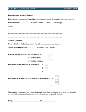 KOLONIA ZUCHOWA 2014 ZGŁOSZENIE Zgłaszam na kolonię Zucha: Imię .................................... Nazwisko .................................... Gromada:…………………….. Data urodzenia ...... / ...... / ...... Wiek na kolonii ........(lat) ..........(miesięcy) Adres ………………………………………………………………………………… ………………………………………………………………………………… ………………………………………………………………………………… Numery Telefonów................................................................................. Numer Telefonu Rodziców podczas Kolonii ............................................. Jednocześnie przesyłam £................... ( Wpisowe / Cała Opłata) Rozmiar koszuli (t-shirt) - 30” 33/34 (9-11 lat) 28” 30/32 (7-8 lat) 32” 35/36 (12-13 lat) Ilość zdobytych GWIAZDEK zuchowych: 1 2 3 Ilość zdobytych SPECJALNYCH ODZNAK zuchowych: 1 2 3 Mając pełne zaufanie do kierownictwa kolonii pozwalam mojemu synowi na branie udziału we wszystkich zajęciach i zabawach przewidzianych w programie kolonii. Podpis............................................................ Data........................... Uwagi rodziców odnośnie Zucha, na co należy specjalnie zwrócić uwagę, itp. Proszę umieścić wszystkie informacje które pomogą nam zapewnić szczególną opiekę nad Zuchem podczas koloni. Na przykład, jeżeli Zuchowi zdarza się zmoczenie pościeli podczas nocy, będąc o tym poinformowani możemy nad tym dyskretnie czuwać i zrobić co należy. Proszę dać znać jeżeli Zuch ma jakieś trudności emocjonalne, czy w zachowaniu, albo jeżeli przeżywa żałobę. Prosimy też poinformować, jeżeli są osoby z którymi Zuch nie powinien mieć kontaktu. Czasami jest łatwiej wytłumaczyć / przedyskutować niektóre sprawy w rozmowie. W takim wypadku proszę zadzwonić do Druha Olusia lub Druha Marcia. Wszyskie te uwagi będą traktowane ściśle poufnie. ………………………………………………………………………………………………………… ………………………………………………………………………………………………………… ………………………………………………………………………………………………………… (Jeżeli potrzeba, proszę użyć tylną stronę papieru) Ponieważ nie wszyscy się orientują jak należy wypisać czeki, przykład jest pokazany poniżej. Proszę czeki wysłąć zwyczajną pocztą. To jest zupełnie bezpieczne. Nawet jeśli ktoś skradłby taki czek, to ten złodziej jedynie mógłby go wpłacić na konto koloni, a nie na swoje. Wysyłanie czeków przez ‘Recorded Delivery’ jest niepotrzebne, kosztuje więcej i każda przesyłka wymaga od nas dodatkowej podróży na pocztę aby go odebrac. Jeżeli nazwisko osoby która wystawia czek różni się od nazwiska zgłoszonego Zucha, prosimy dodać nazwisko Zucha na tylnej stronie czeku.