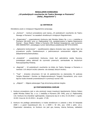 REGULAMIN KONKURSU „10 podwójnych voucherów do Teatru Nowego w Poznaniu” (dalej „Regulamin”) §1 DEFINICJE Określenia użyte w niniejszym Regulaminie oznaczają: a. „Konkurs” – konkurs prowadzony pod nazwą „10 podwójnych voucherów do Teatru Nowego w Poznaniu” na zasadach określonych niniejszym Regulaminem. b. „Organizator” – organizatorem Konkursu jest Monday Sołacz Sp. z o.o. z siedzibą w Poznaniu (60-649), przy ul. Piątkowskiej 116, zarejestrowana w Sądzie Rejonowym Poznań – Nowe Miasto i Wilda w Poznaniu VIII Wydział Gospodarczy, pod numerem KRS 0000567047, posiadająca numer identyfikacji podatkowej NIP 9721253055. c. „Zgłoszenie konkursowe” – opublikowanie zdjęcia drzewka typu tuja (dalej Tuja) na prywatnym profilu Facebookowym z jednoczesnym oznaczeniem zdjęcia jako @ApartamentyZielonySołacz. d. „Uczestnik” – uczestnikiem Konkursu może być pełnoletnia osoba fizyczna, posiadająca pełną zdolność do czynności prawnych, zamieszkała na terytorium Rzeczypospolitej Polskiej. e. „Nagroda” – 10 podwójnych voucherów na bilety do Teatru Nowego w Poznaniu o wartości 110 złotych brutto (słownie: sto dziesięć złotych brutto). f. “Tuja” – drzewko otrzymane 15 lub 16 października na stanowisku F2 podczas Targów Mieszkań i Domów na Międzynarodowych Targach Poznańskich, przy czym łączna liczba drzewek przewidzianych w promocji wynosi 100. g. „Zdjęcie” – Zdjęcie pokazujące Tuję otrzymaną podczas targów. §2 POSTANOWIENIA OGÓLNE 1. Konkurs prowadzony jest w celu promocji nowej inwestycji Apartamenty Zielony Sołacz spółki Monday Sołacz Sp. z o.o. z siedzibą w Poznaniu (60- 649), przy ul. Piątkowskiej 116. Konkurs ma charakter ogólnopolski, rozpoczyna się on w dniu 15.10.2016 r. o godz. 10.00 i trwa do 16.10.2016 r. do godz. 17.00. 2. Konkurs nie podlega zatwierdzeniu w trybie określonym w ustawie z dnia 19 listopada 2009 r. o grach hazardowych (Dz. U. z 2009 r. Nr 201, poz. 1540 z późn. zm.). Organizator oświadcza, że Konkurs nie jest grą losową, loterią fantową, zakładem wzajemnym, loterią promocyjną, której wynik zależy od przypadku, ani żadną inną formą przewidzianą w ustawie z dnia 19 listopada 2009 r. o grach hazardowych. 3. Konkurs będzie prowadzony i dostępny za pośrednictwem fanpage’y: Apartamenty Zielony Sołacz https://www.facebook.com/ApartamentyZielonySolacz/ oraz Monday Development: https://www.facebook.com/MondayDevelopment/ Uczestnikiem Konkursu, na warunkach określonych w Regulaminie Konkursu, może być każda osoba fizyczna, powyżej 18 roku życia, posiadająca pełną zdolność do czynności prawnych, zamieszkała na terytorium Rzeczypospolitej Polski. 4. W Konkursie nie mogą brać udziału: Organizator, pracownicy Organizatora, jak również ich małżonkowie, zstępni, wstępni oraz rodzeństwo. 5. W trakcie trwania Konkursu Organizator może przesyłać Uczestnikom, za pomocą środków komunikacji elektronicznej, wiadomości związane z przebiegiem Konkursu. 6. Uczestnictwo w Konkursie jest dobrowolne. 7. Uczestnik może wziąć udział w Konkursie jeden raz w trakcie trwania Konkursu. §3 ZASADY PROWADZENIA KONKURSU 1. Aby wziąć udział w Konkursie należy spełnić łącznie następujące warunki: a. Zapoznać się z treścią Regulaminu Konkursu dostępnym na stoisku F2 Targów Mieszkań i Domów w dniach 15-16.10.2016 r. oraz na stronie www.zielonysolacz.pl b. Opublikować publicznie zdjęcie Tui na prywatnym profilu Facebookowym, wraz z oznaczeniem inwestycji @ApartamentyZielonySołacz 2. Spełnienie warunków określonych w ustępie 1 pkt a-b niniejszego paragrafu stanowi zgłoszenie (zwane dalej „Zgłoszeniem Konkursowym”). 3. Nadesłane Zgłoszenia Konkursowe nie mogą zawierać treści wulgarnych, obraźliwych lub naruszających dóbr osobistych innych osób. 4. Zgłoszenia Konkursowe niespełniające wymogów określonych w § 3 ust. 1 lub § 3 ust. 3 nie będą przyjmowane. 5. Uczestnicy Konkursu są zobowiązani do przestrzegania niniejszego Regulaminu. Nieprzestrzeganie Regulaminu może skutkować wykluczeniem Uczestnika z udziału w Konkursie. §4 PRAWA AUTORSKIE 1. Organizator jako przyrzekający nagrodę zastrzega, że nabywa własność i prawa autorskie w stosunku do nagrodzonego Zdjęcia. Niezależnie od tego Uczestnik oświadcza, iż w dniu wyłonienia go przez Komisję Konkursową jako Zwycięzcę – przeniesione zostają, bez konieczności składania dodatkowych oświadczeń, nieodpłatnie na Monday Sołacz Sp. z o.o. autorskie prawa majątkowe do nieograniczonego w czasie i terytorialnie korzystania i rozporządzania Zdjęciem na następujących polach eksploatacji: 1) w zakresie utrwalania i zwielokrotniania utworu - wytwarzanie określoną techniką egzemplarzy utworu, w tym techniką drukarską, reprograficzną, zapisu magnetycznego oraz techniką cyfrową; 2) w zakresie obrotu oryginałem albo egzemplarzami, na których utwór utrwalono wprowadzanie do obrotu, użyczenie lub najem oryginału albo egzemplarzy; 3) w zakresie rozpowszechniania utworu w sposób inny niż określony w pkt 2 - publiczne wykonanie, wystawienie, wyświetlenie, odtworzenie oraz nadawanie i reemitowanie, a także publiczne udostępnianie utworu w taki sposób, aby każdy mógł mieć do niego dostęp w miejscu i w czasie przez siebie wybranym. §5 NAGRODY W KONKURSIE I SPOSÓB ICH PRZYZNANIA 1. W ramach Konkursu przewidziane są następujące nagrody: a. Po zakończeniu trwania Konkursu, nie później jednak niż do 19.10.2016 r., powołana przez Organizatora Komisja Konkursowa składająca się z przedstawicieli (zwana dalej „Komisją Konkursową”), spośród Uczestników wybierze 10 osób, które opublikowały najciekawsze Zdjęcie w oparciu o subiektywne kryterium kreatywności (zwanymi dalej „Laureatami”). Każdy z Laureatów otrzyma Nagrodę w postaci Podwójnego Vouchera na Bilet do Teatru Nowego w Poznaniu 2. Do zadań