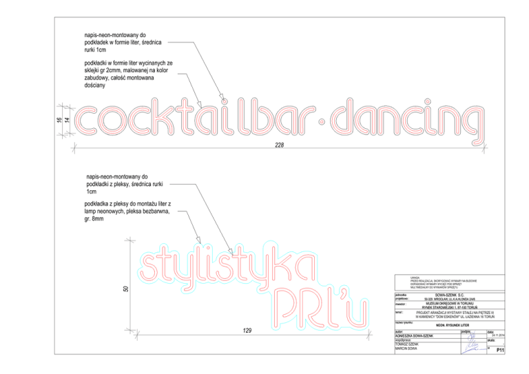 napis-neon-montowany do podkładek w formie liter, średnica rurki 1cm 16 14 podkładki w formie liter wycinanych ze sklejki gr 2cmm, malowanej na kolor zabudowy, całość montowana dościany 228 napis-neon-montowany do podkładki z pleksy, średnica rurki 1cm podkładka z pleksy do montażu liter z lamp neonowych, pleksa bezbarwna, gr. 8mm 50 UWAGA: PRZED REALIZACJĄ SKORYGOWAĆ WYMIARY NA BUDOWIE DOPASOWAĆ WYMIARY WYCIĘĆ POD SPRZĘT MULTIMEDIALNY DO WYMIARÓW SPRZĘTU jednostka projektowa : inwestor : temat : SOWA-SZENK S.C. 50-329 WROCŁAW, UL.K.A.HLONDA 2/4/6 MUZEUM OKRĘGOWE W TORUNIU RYNEK STAROMIEJSKI 1, 87-100 TORUŃ PROJEKT ARANŻACJI WYSTAWY STAŁEJ NA PIĘTRZE III W KAMIENICY "DOM ESKENÓW" UL. ŁAZIENNA 16 TORUŃ nazwa rysunku: 129 autor: AGNIESZKA SOWA-SZENK współpraca: TOMASZ SZENK MARCIN SOWA NEON. RYSUNEK LITER podpis: data: 24.11.2014 skala: nr - P11
