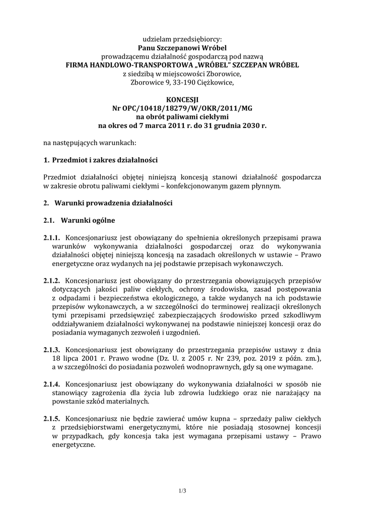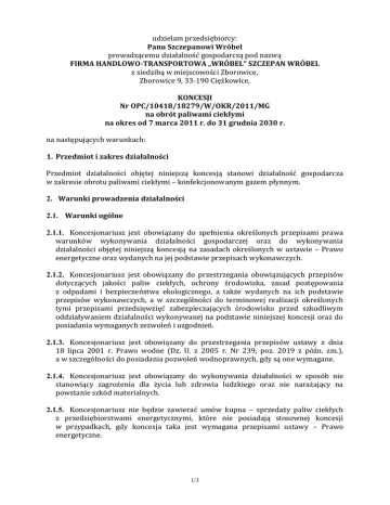 udzielam przedsiębiorcy: Panu Szczepanowi Wróbel prowadzącemu działalność gospodarczą pod nazwą FIRMA HANDLOWO-TRANSPORTOWA „WRÓBEL” SZCZEPAN WRÓBEL z siedzibą w miejscowości Zborowice, Zborowice 9, 33-190 Ciężkowice, KONCESJI Nr OPC/10418/18279/W/OKR/2011/MG na obrót paliwami ciekłymi na okres od 7 marca 2011 r. do 31 grudnia 2030 r. na następujących warunkach: 1. Przedmiot i zakres działalności Przedmiot działalności objętej niniejszą koncesją stanowi działalność gospodarcza w zakresie obrotu paliwami ciekłymi – konfekcjonowanym gazem płynnym. 2. Warunki prowadzenia działalności 2.1. Warunki ogólne 2.1.1. Koncesjonariusz jest obowiązany do spełnienia określonych przepisami prawa warunków wykonywania działalności gospodarczej oraz do wykonywania działalności objętej niniejszą koncesją na zasadach określonych w ustawie – Prawo energetyczne oraz wydanych na jej podstawie przepisach wykonawczych. 2.1.2. Koncesjonariusz jest obowiązany do przestrzegania obowiązujących przepisów dotyczących jakości paliw ciekłych, ochrony środowiska, zasad postępowania z odpadami i bezpieczeństwa ekologicznego, a także wydanych na ich podstawie przepisów wykonawczych, a w szczególności do terminowej realizacji określonych tymi przepisami przedsięwzięć zabezpieczających środowisko przed szkodliwym oddziaływaniem działalności wykonywanej na podstawie niniejszej koncesji oraz do posiadania wymaganych zezwoleń i uzgodnień. 2.1.3. Koncesjonariusz jest obowiązany do przestrzegania przepisów ustawy z dnia 18 lipca 2001 r. Prawo wodne (Dz. U. z 2005 r. Nr 239, poz. 2019 z późn. zm.), a w szczególności do posiadania pozwoleń wodnoprawnych, gdy są one wymagane. 2.1.4. Koncesjonariusz jest obowiązany do wykonywania działalności w sposób nie stanowiący zagrożenia dla życia lub zdrowia ludzkiego oraz nie narażający na powstanie szkód materialnych. 2.1.5. Koncesjonariusz nie będzie zawierać umów kupna – sprzedaży paliw ciekłych z przedsiębiorstwami energetycznymi, które nie posiadają stosownej koncesji w przypadkach, gdy koncesja taka jest wymagana przepisami ustawy – Prawo energetyczne. 1/3 2.2. Szczególne warunki wykonywania działalności objętej koncesją ze względu na właściwą obsługę odbiorców 2.2.1. Koncesjonariusz jest obowiązany do utrzymania stanu technicznego oraz wyposażenia obiektów, instalacji i urządzeń zapewniających wysoką efektywność i najlepszą jakość wykonywanej działalności objętej niniejszą koncesją, z uwzględnieniem racjonalnego poziomu kosztów, przy zachowaniu obowiązujących przepisów określających wymogi techniczne, w tym metrologiczne, jakościowe i ochrony środowiska oraz do przestrzegania przepisów o bezpieczeństwie i higienie pracy, w tym w szczególności w zakresie bezpieczeństwa pożarowego oraz bezpieczeństwa ludzi i mienia. 2.2.2. Koncesjonariusz jest obowiązany do zapewnienia, aby czynności w zakresie samodzielnej eksploatacji instalacji i urządzeń wykonywały wyłącznie osoby legitymujące się posiadaniem wymaganych w tym zakresie kwalifikacji. 2.2.3. Koncesjonariuszowi nie wolno czynić przedmiotem obrotu paliw ciekłych, których parametry jakościowe są niezgodne z parametrami określonymi obowiązującymi przepisami i wynikającymi z zawartych umów. 2.2.4. Koncesjonariusz jest obowiązany do posiadania ważnego dokumentu określającego parametry fizyko-chemiczne danej partii paliwa będącego przedmiotem obrotu, wydanego każdorazowo przez bezpośredniego sprzedawcę tego paliwa, a także do wydania na jego podstawie każdemu przedsiębiorcy prowadzącemu obrót paliwami ciekłymi, a innemu odbiorcy na jego żądanie, oświadczenia we własnym imieniu o zgodności parametrów jakości dostarczonego paliwa z parametrami jakości wynikającymi z obowiązujących w tym zakresie przepisów i z zawartej z odbiorcą umowy. W przypadku importu lub przesunięcia wewnątrzwspólnotowego paliw ciekłych określonych niniejszą koncesją, Koncesjonariusz jest obowiązany do przeprowadzania kontroli jakości wprowadzanych do obrotu paliw celem sprawdzenia dotrzymywania przez te paliwa parametrów jakościowych wynikających z krajowych norm jakościowych określonych w obowiązujących przepisach oraz przekazania wyników badań odbiorcy. 2.2.5. Koncesjonariusz jest obowiązany w okresie, na jaki została udzielona niniejsza koncesja, do utrzymywania lub zagwarantowania możliwości pozyskania środków finansowych lub majątku pozwalającego na zaspokojenie roszczeń osób trzecich mogących powstać wskutek niewłaściwego prowadzenia działalności objętej koncesją lub szkód w środowisku. 2.3. Warunki zaprzestania działalności po wygaśnięciu koncesji lub jej cofnięciu 2.3.1. W przypadku, gdy działalność objęta niniejszą koncesją wywiera wpływ na środowisko, Koncesjonariusz jest obowiązany, w trakcie prowadzenia działalności koncesjonowanej oraz po jej zaprzestaniu, do likwidacji skutków tej działalności. 2.4. Sprawozdawczość i udzielanie informacji 2.4.1. Koncesjonariusz jest obowiązany zawiadomić Prezesa URE o istotnych zmianach dotyczących wykonywanej działalności objętej niniejszą koncesją (w tym 2/3 w szczególności nazwy, siedziby, numeru w rejestrze przedsiębiorców, numeru identyfikacji podatkowej, rozszerzenia bądź ograniczenia tej działalności) nie później niż 14 dni od dnia ich powstania. 2.4.2. Koncesjonariusz jest obowiązany do pisemnego poinformowania Prezesa URE o zamiarze zaprzestania działalności koncesjonowanej nie później niż na 3 miesiące przed przewidywaną datą zaprzestania działalności. 3/3