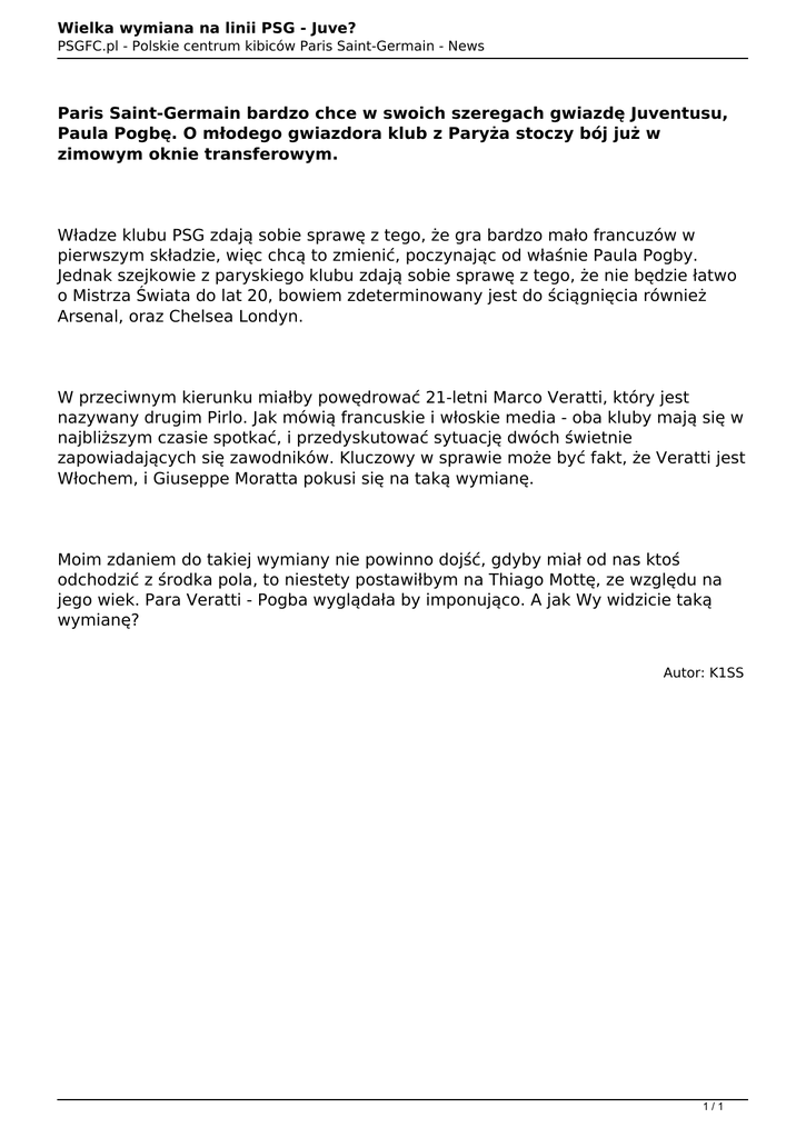 Wielka wymiana na linii PSG - Juve? PSGFC.pl - Polskie centrum kibiców Paris Saint-Germain - News Paris Saint-Germain bardzo chce w swoich szeregach gwiazdę Juventusu, Paula Pogbę. O młodego gwiazdora klub z Paryża stoczy bój już w zimowym oknie transferowym. Władze klubu PSG zdają sobie sprawę z tego, że gra bardzo mało francuzów w pierwszym składzie, więc chcą to zmienić, poczynając od właśnie Paula Pogby. Jednak szejkowie z paryskiego klubu zdają sobie sprawę z tego, że nie będzie łatwo o Mistrza Świata do lat 20, bowiem zdeterminowany jest do ściągnięcia również Arsenal, oraz Chelsea Londyn. W przeciwnym kierunku miałby powędrować 21-letni Marco Veratti, który jest nazywany drugim Pirlo. Jak mówią francuskie i włoskie media - oba kluby mają się w najbliższym czasie spotkać, i przedyskutować sytuację dwóch świetnie zapowiadających się zawodników. Kluczowy w sprawie może być fakt, że Veratti jest Włochem, i Giuseppe Moratta pokusi się na taką wymianę. Moim zdaniem do takiej wymiany nie powinno dojść, gdyby miał od nas ktoś odchodzić z środka pola, to niestety postawiłbym na Thiago Mottę, ze względu na jego wiek. Para Veratti - Pogba wyglądała by imponująco. A jak Wy widzicie taką wymianę? Autor: K1SS 1/1 Powered by TCPDF (www.tcpdf.org)