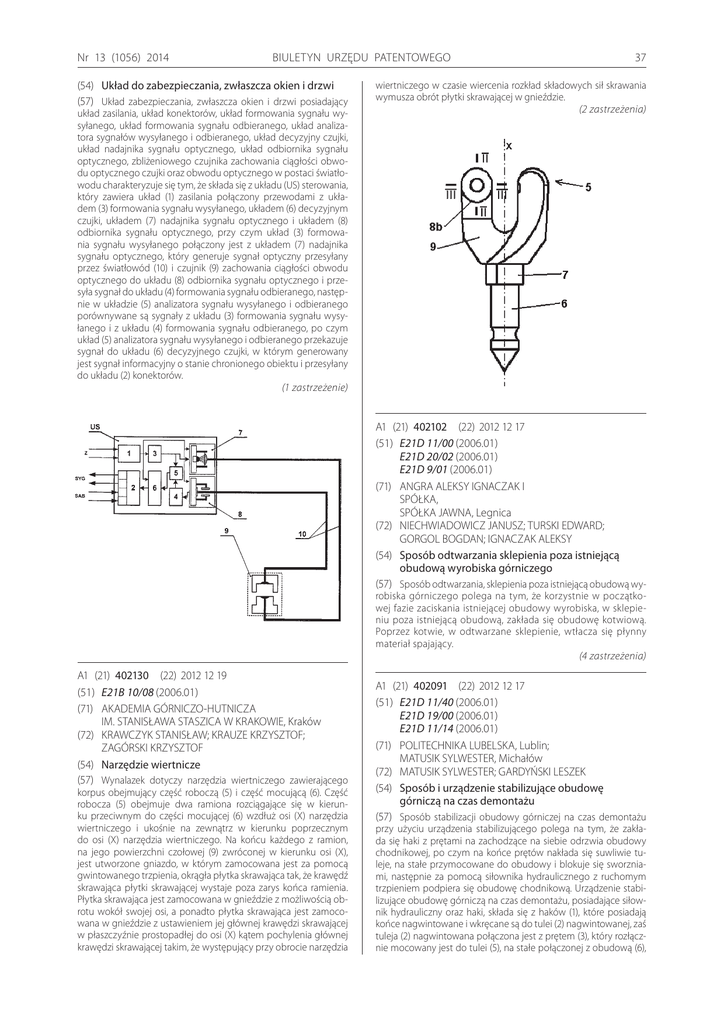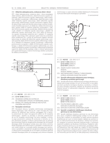 Nr 13 (1056) 2014 BIULETYN URZĘDU PATENTOWEGO (54) 6LBEEP[BCF[QJFD[BOJB[XBT[D[BPLJFOJES[XJ (57) Układ zabezpieczania, zwłaszcza okien i drzwi posiadający układ zasilania, układ konektorów, układ formowania sygnału wysyłanego, układ formowania sygnału odbieranego, układ analizatora sygnałów wysyłanego i odbieranego, układ decyzyjny czujki, układ nadajnika sygnału optycznego, układ odbiornika sygnału optycznego, zbliżeniowego czujnika zachowania ciągłości obwodu optycznego czujki oraz obwodu optycznego w postaci światłowodu charakteryzuje się tym, że składa się z układu (US) sterowania, który zawiera układ (1) zasilania połączony przewodami z układem (3) formowania sygnału wysyłanego, układem (6) decyzyjnym czujki, układem (7) nadajnika sygnału optycznego i układem (8) odbiornika sygnału optycznego, przy czym układ (3) formowania sygnału wysyłanego połączony jest z układem (7) nadajnika sygnału optycznego, który generuje sygnał optyczny przesyłany przez światłowód (10) i czujnik (9) zachowania ciągłości obwodu optycznego do układu (8) odbiornika sygnału optycznego i przesyła sygnał do układu (4) formowania sygnału odbieranego, następnie w układzie (5) analizatora sygnału wysyłanego i odbieranego porównywane są sygnały z układu (3) formowania sygnału wysyłanego i z układu (4) formowania sygnału odbieranego, po czym układ (5) analizatora sygnału wysyłanego i odbieranego przekazuje sygnał do układu (6) decyzyjnego czujki, w którym generowany jest sygnał informacyjny o stanie chronionego obiektu i przesyłany do układu (2) konektorów. (1 zastrzeżenie) 37 wiertniczego w czasie wiercenia rozkład składowych sił skrawania wymusza obrót płytki skrawającej w gnieździe. (2 zastrzeżenia) A1 (21) 402102 (22) 2012 12 17 (51) E21D 11/00 (2006.01) E21D 20/02 (2006.01) E21D 9/01 (2006.01) (71) ANGRA ALEKSY IGNACZAK I SPÓŁKA, SPÓŁKA JAWNA, Legnica (72) NIECHWIADOWICZ JANUSZ; TURSKI EDWARD; GORGOL BOGDAN; IGNACZAK ALEKSY (54) 4QPTØCPEUXBS[BOJBTLMFQJFOJBQP[BJTUOJFKnjDnj PCVEPXnjXZSPCJTLBHØSOJD[FHP (57) Sposób odtwarzania, sklepienia poza istniejącą obudową wyrobiska górniczego polega na tym, że korzystnie w początkowej fazie zaciskania istniejącej obudowy wyrobiska, w sklepieniu poza istniejącą obudową, zakłada się obudowę kotwiową. Poprzez kotwie, w odtwarzane sklepienie, wtłacza się płynny materiał spajający. (4 zastrzeżenia) A1 (21) 402130 (22) 2012 12 19 (51) E21B 10/08 (2006.01) (71) AKADEMIA GÓRNICZO-HUTNICZA IM. STANISŁAWA STASZICA W KRAKOWIE, Kraków (72) KRAWCZYK STANISŁAW; KRAUZE KRZYSZTOF; ZAGÓRSKI KRZYSZTOF (54) /BS[ǗE[JFXJFSUOJD[F (57) Wynalazek dotyczy narzędzia wiertniczego zawierającego korpus obejmujący część roboczą (5) i część mocującą (6). Część robocza (5) obejmuje dwa ramiona rozciągające się w kierunku przeciwnym do części mocującej (6) wzdłuż osi (X) narzędzia wiertniczego i ukośnie na zewnątrz w kierunku poprzecznym do osi (X) narzędzia wiertniczego. Na końcu każdego z ramion, na jego powierzchni czołowej (9) zwróconej w kierunku osi (X), jest utworzone gniazdo, w którym zamocowana jest za pomocą gwintowanego trzpienia, okrągła płytka skrawająca tak, że krawędź skrawająca płytki skrawającej wystaje poza zarys końca ramienia. Płytka skrawająca jest zamocowana w gnieździe z możliwością obrotu wokół swojej osi, a ponadto płytka skrawająca jest zamocowana w gnieździe z ustawieniem jej głównej krawędzi skrawającej w płaszczyźnie prostopadłej do osi (X) kątem pochylenia głównej krawędzi skrawającej takim, że występujący przy obrocie narzędzia A1 (21) 402091 (22) 2012 12 17 (51) E21D 11/40 (2006.01) E21D 19/00 (2006.01) E21D 11/14 (2006.01) (71) POLITECHNIKA LUBELSKA, Lublin; MATUSIK SYLWESTER, Michałów (72) MATUSIK SYLWESTER; GARDYŃSKI LESZEK (54) 4QPTØCJVS[njE[FOJFTUBCJMJ[VKnjDFPCVEPXǗ HØSOJD[njOBD[BTEFNPOUBȈV (57) Sposób stabilizacji obudowy górniczej na czas demontażu przy użyciu urządzenia stabilizującego polega na tym, że zakłada się haki z prętami na zachodzące na siebie odrzwia obudowy chodnikowej, po czym na końce prętów nakłada się suwliwie tuleje, na stałe przymocowane do obudowy i blokuje się sworzniami, następnie za pomocą siłownika hydraulicznego z ruchomym trzpieniem podpiera się obudowę chodnikową. Urządzenie stabilizujące obudowę górniczą na czas demontażu, posiadające siłownik hydrauliczny oraz haki, składa się z haków (1), które posiadają końce nagwintowane i wkręcane są do tulei (2) nagwintowanej, zaś tuleja (2) nagwintowana połączona jest z prętem (3), który rozłącznie mocowany jest do tulei (5), na stałe połączonej z obudową (6),