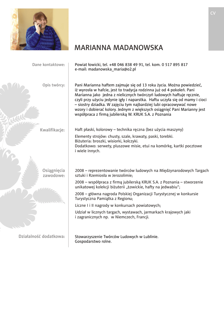 CV MARIANNA MADANOWSKA Dane kontaktowe: Opis twórcy: Kwalifikacje: Powiat ³owicki, tel. +48 046 838 49 91, tel. kom. 0 517 895 817 e-mail: [email protected] Pani Marianna haftem zajmuje siê od 13 roku ¿ycia. Mo¿na powiedzieæ, i¿ wyros³a w hafcie, jest to tradycja rodzinna ju¿ od 4 pokoleñ. Pani Marianna jako jedna z nielicznych twórczyñ ludowych haftuje rêcznie, czyli przy u¿yciu jedynie ig³y i naparstka. Haftu uczy³a siê od mamy i cioci – siostry dziadka. W zajêciu tym najbardziej lubi opracowywaæ nowe wzory i dobieraæ kolory. Jednym z wiêkszych osi¹gniêæ Pani Marianny jest wspó³praca z firm¹ jubilersk¹ W. KRUK S.A. z Poznania Haft p³aski, kolorowy – technika rêczna (bez u¿ycia maszyny) Elementy strojów: chusty, szale, krawaty, paski, torebki. Bi¿uteria: broszki, wisiorki, kolczyki. Dodatkowo: serwety, pluszowe misie, etui na komórkê, kartki pocztowe i wiele innych. Osi¹gniêcia zawodowe: 2008 – reprezentowanie twórców ludowych na Miêdzynarodowych Targach sztuki i Rzemios³a w Jerozolimie; 2008 – wspó³praca z firm¹ jubilersk¹ KRUK S.A. z Poznania – stworzenie unikatowej kolekcji bi¿uterii „£owickie, hafty na jedwabiu”; 2008 – g³ówna nagroda Polskiej Organizacji Turystycznej w konkursie Turystyczna Pami¹tka z Regionu; Liczne I i II nagrody w konkursach powiatowych; Udzia³ w licznych targach, wystawach, jarmarkach krajowych jaki i zagranicznych np. w Niemczech, Francji. Dzia³alnoœæ dodatkowa: Stowarzyszenie Twórców Ludowych w Lublinie. Gospodarstwo rolne.