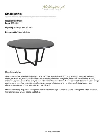 Stolik Maple http://www.meblonista.pl/pl/offer/oferta/stoly-stoliki/stoliki-kawowe/stolik-maple.html/ Projekt Stolik Maple Cena: 999.00 zł Wymiary: D: 80 | S: 80 | W: 38,5 Dostępność: Na zamówienie Charakterystyka: Nowoczesny stolik kawowy Maple łączy w sobie prostotę i szlachetność formy. Funkcjonalny, pozbawiony zbędnych detali projekt, stylowo wpisze się w aranżacje zarówno klasyczne, retro oraz nowoczesne. Cechą charakterystyczną projektu są skrzyżowane nóżki oraz blat z wertzalitu. Uniwersalny styl stolika odnajdzie swoje zastosowanie nie tylko w domowym salonie, czy pokoju młodzieżowym - to także stolik dedykowany dla większych przestrzeni, stref wypoczynku i poczekalni. Stolik lakierowany na półmat. Dostępne kolory można zobaczyć w próbniku palety Ral w galerii zdjęć produktu. Przy zamówieniu proszę podać kod koloru. http://www.meblonista.pl Dostępne wersje produktu: nazwa produktu Stolik Maple warianty kolor czarny cena 999.00zł dostępne 4-6 tygodni Stolik Maple kolor biały 999.00zł 4-6 tygodni http://www.meblonista.pl Zdjęcia produktu: http://www.meblonista.pl Powered by TCPDF (www.tcpdf.org)