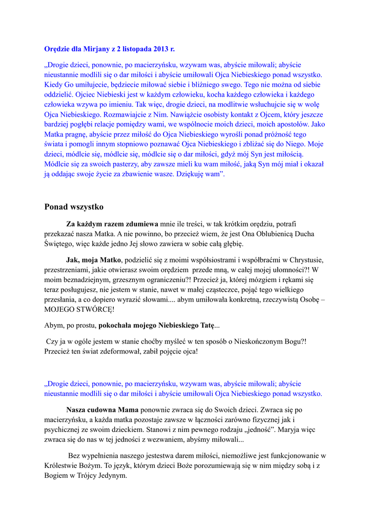 Orędzie dla Mirjany z 2 listopada 2013 r. „Drogie dzieci, ponownie, po macierzyńsku, wzywam was, abyście miłowali; abyście nieustannie modlili się o dar miłości i abyście umiłowali Ojca Niebieskiego ponad wszystko. Kiedy Go umiłujecie, będziecie miłować siebie i bliźniego swego. Tego nie można od siebie oddzielić. Ojciec Niebieski jest w każdym człowieku, kocha każdego człowieka i każdego człowieka wzywa po imieniu. Tak więc, drogie dzieci, na modlitwie wsłuchujcie się w wolę Ojca Niebieskiego. Rozmawiajcie z Nim. Nawiążcie osobisty kontakt z Ojcem, który jeszcze bardziej pogłębi relacje pomiędzy wami, we wspólnocie moich dzieci, moich apostołów. Jako Matka pragnę, abyście przez miłość do Ojca Niebieskiego wyrośli ponad próżność tego świata i pomogli innym stopniowo poznawać Ojca Niebieskiego i zbliżać się do Niego. Moje dzieci, módlcie się, módlcie się, módlcie się o dar miłości, gdyż mój Syn jest miłością. Módlcie się za swoich pasterzy, aby zawsze mieli ku wam miłość, jaką Syn mój miał i okazał ją oddając swoje życie za zbawienie wasze. Dziękuję wam”. Ponad wszystko Za każdym razem zdumiewa mnie ile treści, w tak krótkim orędziu, potrafi przekazać nasza Matka. A nie powinno, bo przecież wiem, że jest Ona Oblubienicą Ducha Świętego, więc każde jedno Jej słowo zawiera w sobie całą głębię. Jak, moja Matko, podzielić się z moimi współsiostrami i współbraćmi w Chrystusie, przestrzeniami, jakie otwierasz swoim orędziem przede mną, w całej mojej ułomności?! W moim beznadziejnym, grzesznym ograniczeniu?! Przecież ja, której mózgiem i rękami się teraz posługujesz, nie jestem w stanie, nawet w małej cząsteczce, pojąć tego wielkiego przesłania, a co dopiero wyrazić słowami.... abym umiłowała konkretną, rzeczywistą Osobę – MOJEGO STWÓRCĘ! Abym, po prostu, pokochała mojego Niebieskiego Tatę... Czy ja w ogóle jestem w stanie choćby myśleć w ten sposób o Nieskończonym Bogu?! Przecież ten świat zdeformował, zabił pojęcie ojca! „Drogie dzieci, ponownie, po macierzyńsku, wzywam was, abyście miłowali; abyście nieustannie modlili się o dar miłości i abyście umiłowali Ojca Niebieskiego ponad wszystko. Nasza cudowna Mama ponownie zwraca się do Swoich dzieci. Zwraca się po macierzyńsku, a każda matka pozostaje zawsze w łączności zarówno fizycznej jak i psychicznej ze swoim dzieckiem. Stanowi z nim pewnego rodzaju „jedność”. Maryja więc zwraca się do nas w tej jedności z wezwaniem, abyśmy miłowali... Bez wypełnienia naszego jestestwa darem miłości, niemożliwe jest funkcjonowanie w Królestwie Bożym. To język, którym dzieci Boże porozumiewają się w nim między sobą i z Bogiem w Trójcy Jedynym. Tak więc, żebyśmy mogli żyć w Królestwie Bożym, musimy nauczyć się języka jaki tam „obowiązuje”. Jeśli tego nie zdążymy zrobić w rzeczywistości Kościoła Walczącego, będziemy musieli dokończyć naszej „edukacji” w rzeczywistości Kościoła Cierpiącego, a więc w czyśćcu. Nasza Mama wzywa nas, abyśmy miłowali mocą daru Miłości i UMIŁOWALI Ojca Niebieskiego... ponad wszystko! Dobrze w tym miejscu uzmysłowić sobie to, co właśnie przeczytaliśmy: PONAD WSZYSTKO?! A więc bardziej niż swoje zdrowie, swoje dzieci, swoich rodziców, czy współmałżonków. Bardziej niż złe cele jakie sobie często obieramy, a więc dorobienie się majątku, kariera, czy potrzeba wzbudzania podziwu u innych.... Kiedy Go umiłujecie, będziecie miłować siebie i bliźniego swego. Tego nie można od siebie oddzielić. Kiedy UMIŁUJEMY Ojca, będziemy miłować we właściwy sposób samych siebie. Bez egocentryzmu, egoizmu, czy narcyzmu. Będziemy we właściwy sposób miłować bliźnich to jest tak, jak dzieci Boże, a nie obiekty do spełniania naszych własnych oczekiwań. Chodzi po prostu o szeroko pojętą Bezinteresowną Miłość. Żebyśmy w pełni uświadomili sobie, do jakiego rodzaju relacji nasza cudowna Mama nas wzywa, dobrze powiedzieć jasno co znaczy „umiłować”. To znaczy pokochać kogoś na śmierć i życie. Oszaleć na czyimś punkcie. To poświęcić komuś całe serce i nosić go w swoim sercu. Świata poza nim nie widzieć, uwielbiać i adorować Go. Tak, to wezwanie do istnego szaleństwa z Miłości do Ojca. O TO MAMY SIĘ NIUSTANNIE MODLIĆ! Ojciec Niebieski jest w każdym człowieku, kocha każdego człowieka i każdego człowieka wzywa po imieniu. Tak więc, drogie dzieci, na modlitwie wsłuchujcie się w wolę Ojca Niebieskiego. Rozmawiajcie z Nim. Nawiążcie osobisty kontakt z Ojcem, który jeszcze bardziej pogłębi relacje pomiędzy wami, we wspólnocie moich dzieci, moich apostołów. Ta potężna, nieprzejednana Miłość powinna być skierowana do Ojca, który przebywa w każdym człowieku. Równocześnie Bóg kieruje Swoją Miłość do każdego człowieka. Następuje cudowna wymiana, wzajemne darzenie się, czyli równoczesne dawanie i branie. Tak, wtedy, gdy umiłujemy, będziemy uczestniczyć w obiegu wzajemnego miłowania się Trójcy Świętej. Jeśli nie będę modlić się o dar miłowania i nie będę pragnęła z całych sił nauczyć się języka Miłości, nie będę w stanie świadomie uczestniczyć w Życiu Trójcy Świętej do jakiej jestem zaproszona. A wszystko w granicach możliwości mojej grzesznej natury, jaką mój Ojciec mi wyznaczy. Maryja dokładnie wie, czym jest ojcostwo, bo jest wypełniona Mądrością. Tak jak matka pozostaje z dzieckiem w łączności psychicznej i fizycznej, tak ojciec, dzięki swojej „inności”, powinien być TYM, który poprowadzi dziecko do odkrycia własnej tożsamości, a więc pomoże stać się dziecku osobą dorosłą. Tak, to sama Mądrość. Maryja jako Matka przez tyle lat wychowywała nas zanurzonych w Swojej macierzyńskiej Miłości. Teraz, jak każda matka ukorzeniona w Bogu, kieruje nas do Ojca, który pomo
