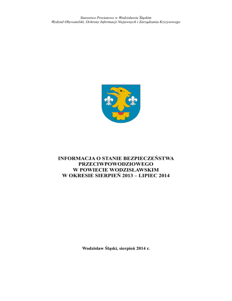 Starostwo Powiatowe w Wodzisławiu Śląskim Wydział Obywatelski, Ochrony Informacji Niejawnych i Zarządzania Kryzysowego INFORMACJA O STANIE BEZPIECZEŃSTWA PRZECIWPOWODZIOWEGO W POWIECIE WODZISŁAWSKIM W OKRESIE SIERPIEŃ 2013 – LIPIEC 2014 Wodzisław Śląski, sierpień 2014 r. WPROWADZENIE Powodzie są zjawiskiem naturalnym, które zawsze było, jest i będzie stanowić zagrożenia dla zdrowia i życia ludzi oraz ich mienia i środowiska przyrodniczego. Całkowite wyeliminowanie powodzi nie jest możliwe, ale aktualny stan wiedzy pozwala uzyskać znaczne ograniczenie tych zagrożeń. Największy wpływ na przebieg powodzi w obrębie głównych polskich rzek ma człowiek, który swoją działalnością tak przekształcił naturalne środowisko, że warunki kształtowania się fal powodziowych w dolinach rzecznych są zupełnie inne od tych, jakie występowały jeszcze kilkadziesiąt lat wcześniej. Na skutek zagospodarowania zlewni spływ powierzchniowy jest znacznie szybszy i intensywniejszy. Jednocześnie zabudowa dolin rzecznych (nierzadko terenów zalewowych) sprawia, że straty powodziowe są coraz większe. Dlatego też współpraca przy rozwiązywaniu problemów powodziowych musi dotyczyć całego obszaru oraz odbywać się w ścisłym porozumieniu pomiędzy gospodarką wodną a gospodarką przestrzenną i urbanistyką, rolnictwem i leśnictwem oraz ochroną środowiska. Bardzo istotne znaczenie w tym zakresie ma ciągłe wzmacnianie świadomości istniejącego ryzyka oraz świadomość odpowiedzialności za własne bezpieczeństwo wszystkich podmiotów zagrożonych powodzią. ZAGROŻENIE POWODZIOWE NA TERENIE POWIATU WODZISŁAWSKIEGO W powiecie wodzisławskim wody zajmują około 8,5 km2 powierzchni, co stanowi 2,9 % całej powierzchni powiatu. Na wielkości te wpływają wody rzek i potoków, a także zbiorniki pożwirowe oraz kompleks stawów hodowlanych, zlokalizowane wzdłuż koryta rzeki Odry. Najbardziej zagrożone tereny w powiecie znajdują się w jego południowo – zachodniej części i obejmują gminy: Godów, Gorzyce i Lubomia. Zagrożenie to powodują rzeki Odra i Olza, szczególnie w okresie wiosennych i letnich przyborów wód, spowodowanych roztopami lub długotrwałymi opadami deszczu. W pozostałej części powiatu zagrożenie powodziowe jest zdecydowanie mniejsze, niemniej jednak mogą wystąpić podtopienia spowodowane wezbraniami małych rzek i lokalnych potoków w wyniku intensywnych opadów atmosferycznych. Szczególnie dotyczy to Wodzisławia Śląskiego w dzielnicy Radlin II, Rydułtów i Marklowic. Rzeki i potoki, które stwarzają potencjalne zagrożenie powodziowe to: 1) Odra – na odcinku długości 14,5 km, 2) Olza – na odcinku długości 8,5 km, 3) Leśnica – na odcinku długości 15,2 km, 4) Szotkówka – na odcinku długości 13,2 km, 5) Lubomka – na odcinku długości 3 km, Strona 2/9 6) Piotrówka – na odcinku długości 8,3 km, 7) Syrynka – na odcinku długości 11,5 km, 8) Nacyna – na odcinku długości 11,37 km, 9) potok Łęgoń – na odcinku długości 14,92 km. Na terenie powiatu wodzisławskiego mogą wystąpić powodzie opadowe i roztopowe. Dominują wezbrania opadowe, związane z gwałtownymi, nawalnymi opadami deszczu, niemniej jednak w przypadku dużych opadów śniegu i wysokich temperatur wiosną na rzekach Odrze i Olzie mogą wystąpić również powodzie roztopowe. Prognozowanie wezbrań jest możliwe przez obserwację w punktach pomiarowych, które znajdują się na rzekach: 1) Odrze – w Republice Czeskiej oraz w Chałupkach, Olzie, Bukowie – Krzyżanowicach, 2) Olzie – w Istebnej, Cieszynie, Godowie oraz przy ujściu w miejscowości Olza. Sieć posterunków obserwacyjno – pomiarowych stanowi własność Instytutu Meteorologii i Gospodarki Wodnej. Wraz z budową na terenie powiatu wodzisławskiego nowych obiektów hydrotechnicznych, zagrożenia powodziowe w coraz mniejszym stopniu będą miały wpływ na bezpieczeństwo, to jednak na dzień dzisiejszy występują i tworzą realne zagrożenie dla mieszkańców. Nie uległy one zmianie w stosunku do lat poprzednich, ale ze względu na istotny wpływ na poczucie bezpieczeństwa, ponownie zostają umieszczone w niniejszym opracowaniu. W Gminie Godów zagrożenie powodują rzeki: Olza, Szotkówka, Leśnica i Piotrówka, a najbardziej narażone na podtopienia są domostwa i posesje położone przy ul. J. III Sobieskiego (Głębocz), ul. Dębina w Gołkowicach, ul. Gliniki w Godowie, ul. Graniczna w Godowie, ul. Nowa w Godowie, ul. 1 Maja w Godowie, ul. Powstańców Śląskich w Godowie. Natomiast objęte zagrożeniem łąki, pola uprawne i odłogi znajdują się w obrębie ul. Granicznej w Godowie, depresyjnej części Skrbeńska (głównie tereny przygraniczne) oraz pozostałych terenach przygranicznych. W Gminie Gorzyce w strefie bezpośredniego zagrożenia rzek Olzy i Odry znajdują się miejscowości Uchylsko, Olza i Odra. Ponadto na terenie gminy Gorzyce podtopienia znacznych terenów powodowane są przez liczne ciągi melioracyjne i cieki kanałowe, które podczas występowania podwyższonych stanów wód w korytach rzek Olzy i Odry, mają uniemożliwione ujście do tych rzek. W Gminie Lubomia zagrożenie powodziowe powodują rzeki Odra, Lubomka i Syrynka, a najbardziej zagrożone powodzią są miejscowości Buków i Ligota Tworkowska. Zagrożenie powodziowe ze strony rzeki Lubomki w Lubomi występuje w rejonie ulic Korfantego, Mickiewicza i Polnej. Strona 3/9 W Wodzisławiu Śląskim zagrożone są budynki położone w bezpośrednim sąsiedztwie rzeki Leśnica. W dzielnicy Radlin II zagrożony jest rejon ulic: Chrobrego i Dąbrowskiego, natomiast w dzielnicy Stare Miasto rejon ulic: Witosa, Bogumińskiej i Rzecznej. W Rydułtowach zagrożone są budynki zlokalizowane w bezpośrednim sąsiedztwie rzeki Nacyna w rejonie ulic: Sobieskiego, Strzody, Radoszowskiej i przyległych. W pozostałych miastach i gminach powiatu wodzisławskiego nie występuje 