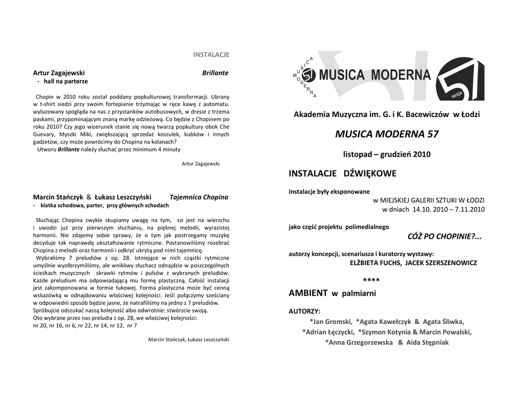 INSTALACJE Artur Zagajewski Brillante - hall na parterze Chopin w 2010 roku został poddany popkulturowej transformacji. Ubrany w t-shirt siedzi przy swoim fortepianie trzymając w ręce kawę z automatu. wyluzowany spogląda na nas z przystanków autobusowych, w dresie z trzema paskami, przypominającym znaną markę odzieżową. Co będzie z Chopinem po roku 2010? Czy jego wizerunek stanie się nową twarzą popkultury obok Che Guevary, Myszki Miki, zwiększającą sprzedaż koszulek, kubków i innych gadżetów, czy może powrócimy do Chopina na kolanach? Utworu Brillante należy słuchać przez minimum 4 minuty Akademia Muzyczna im. G. i K. Bacewiczów w Łodzi MUSICA MODERNA 57 listopad – grudzień 2010 Artur Zagajewski INSTALACJE DŹWIĘKOWE Marcin Stańczyk & Łukasz Leszczyński Tajemnica Chopina - klatka schodowa, parter, przy głównych schodach Słuchając Chopina zwykle skupiamy uwagę na tym, co jest na wierzchu i uwodzi już przy pierwszym słuchaniu, na pięknej melodii, wyrazistej harmonii. Nie zdajemy sobie sprawy, że o tym jak postrzegamy muzykę decyduje tak naprawdę ukształtowanie rytmiczne. Postanowiliśmy rozebrać Chopina z melodii oraz harmonii i odkryć ukrytą pod nimi tajemnicę. Wybraliśmy 7 preludiów z op. 28. Istniejące w nich cząstki rytmiczne umyślnie wyolbrzymiliśmy, ale wnikliwy słuchacz odnajdzie w poszczególnych ścieżkach muzycznych skrawki rytmów i pulsów z wybranych preludiów. Każde preludium ma odpowiadającą mu formę plastyczną. Całość instalacji jest zakomponowana w formie łukowej. Forma plastyczna może być cenną wskazówką w odnajdowaniu właściwej kolejności. Jeśli połączymy sześciany w odpowiedni sposób będzie jasne, że natrafiliśmy na jedno z 7 preludiów. Spróbujcie odszukać naszą kolejność albo odwrotnie: stwórzcie swoją. Oto wybrane przez nas preludia z op. 28, we właściwej kolejności: nr 20, nr 16, nr 6, nr 22, nr 14, nr 12, nr 7 Marcin Stańczyk, Łukasz Leszczyński Instalacje były eksponowane w MIEJSKIEJ GALERII SZTUKI W ŁODZI w dniach 14.10. 2010 – 7.11.2010 jako część projektu polimedialnego CÓŻ PO CHOPINIE?... autorzy koncepcji, scenariusza i kuratorzy wystawy: ELŻBIETA FUCHS, JACEK SZERSZENOWICZ **** AMBIENT w palmiarni AUTORZY: *Jan Gromski, *Agata Kawełczyk & Agata Śliwka, *Adrian Łęczycki, *Szymon Kotynia & Marcin Powalski, *Anna Grzegorzewska & Aida Stępniak INSTALACJE Dobromiła Jaskot & Ian Giedrojć Chopin Quest INSTALACJE Marta Śniady Pieces of Chopin after bottle of wine - obok studia komputerowego, przy wejściu do palmiarni - hall na parterze, przy portierni Chopin Quest to krótkometrażowy film animowany nawiązujący do konwencji gry komputerowej z gatunku action/adventure. Mroczna wizja z surrealistycznego świata, gdzie fortepianowe preludia mieszają się z heavy metalem, a dylematy wokół komercjalizacji sztuki wysokiej rozstrzyga przemoc. Wszystko co znasz, zostało w innym świecie. Tu muzyka Chopina sącząca się zza tajemniczych drzwi oznacza poważne kłopoty, a stawką jest życie. Chopin Quest jest pierwszym na świecie filmem akcji wykorzystującym postać wybitnego kompozytora. Strzępy utworów Fryderyka Chopina, często ograniczone jedynie do wybrzmiewania ostatnich akordów kompozycji lub mało znaczących pasaży zostały przetworzone przez komputer i wzbogacone m. in. o beaty perkusyjne w taki sposób, iż oryginalne źródło pochodzenia dźwięków staje się ledwie rozpoznawalne. Chopin wyłania się z materii dźwiękowej, a po chwili niknie zupełnie, by w niedalekim czasie powrócić. Swoją instalacją chciałam ukazać dwubiegunowość muzyki kompozytora, który potrafił tworzyć niebanalne, subtelne melodie, a w kolejnej odsłonie ukazać bardzo intensywne emocje. Te dwa aspekty przenikają się w dźwiękach instalacji. Moją intencją było ukazanie Chopina improwizującego na fortepianie, nocą w zaciszu domu, po kilku kieliszkach wina. Chopina, który daje się ponieść szczerym emocjom, od zadumy do rozdzierającej rozpaczy i gniewu. Dobromiła Jaskot Marta Śniady Krzysztof Knittel & Jan Pieniążek Chopin Air - w palmiarni Jacek Partyka & Maja Magda Urbańczyk Instalacja Chopin Air składa się z dwóch kartonowych pudeł po sprzęcie audio-video, słuchawek i odtwarzacza CD z nagraniem mojego utworu „norcet III”, a także zwykłego biurkowego wentylatora o średnicy 34 cm oraz nut Mazurka op. 59 nr 1 Fryderyka Chopina. Kapliczka Chopina - piwnica, przy wejściu do sali perkusyjnej Wejdę do kapliczki i poszukam Chopina w sobie To co z niego zostało co się ukryło A może kwili? Poszukam i znajdę Kalejdoskop impresji Zabłąkanych inspiracji Intuicyjnych wolt Jak zapomniane myśli co jeszcze żyją ale pod pajęczyną tylko drżą Jacek Partyka , Maja Magda Urbańczyk Krzysztof Knittel, 11.07.2010