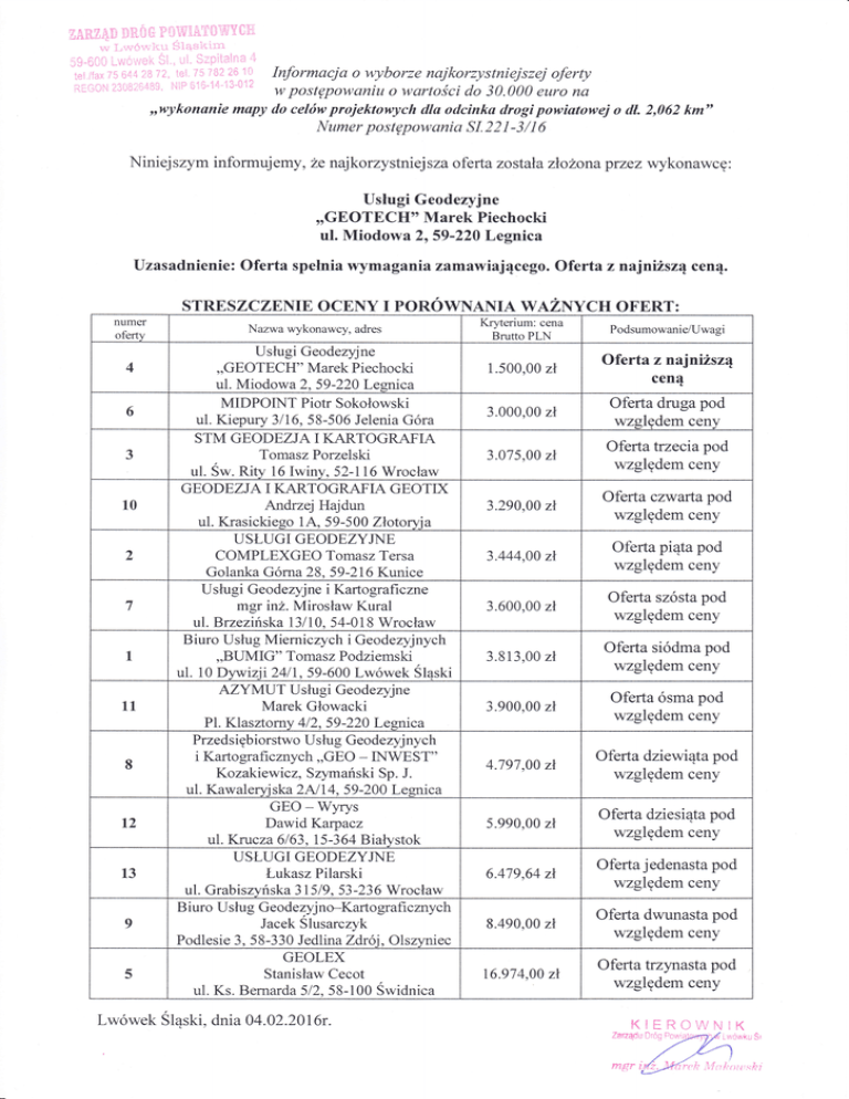 STRESZCZENIE OCENY I POROWNANIA WAZNYCH OFERT: