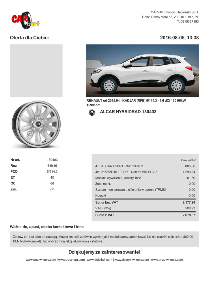CAR-BUT Kocoń i Jabłoński Sp.J. Dolna Panny Marii 53, 20-010 Lublin, PL T: 0815327183 Oferta dla Ciebie: 2016-08-05, 13:38 RENAULT od 2015.04 - KADJAR (RFE) 5/114.3 - 1.6 dCi 130 96kW 1598ccm ALCAR HYBRIDRAD 130403 Nr art. 130403 Roz 6.5x16 4x ALCAR HYBRIDRAD 130403 PCD 5/114.3 4x 215/65R16 102H XL Nokian WR SUV 3 Ceny w PLN 805,80 1.290,84 ET 40 Montaż, wyważenie, zawory, inne OC 66 Zest. mont. 0,00 Z.m. i.P. System monitorowania ciśnienia w oponie (TPMS) 0,00 Kołpaki 0,00 Suma bez VAT 81,30 2.177,94 VAT (23%) Suma z VAT 500,93 2.678,87 Ważne do, upust, osoba kontaktowa i inne Zestaw ten jest tylko propozycją. Można zmienić zarówno wymiar jak i model opony,zamontować lub nie czujniki ciśnienia ( 800,00 PLN brutto/komplet) , lub wybrać inną felgę aluminiową - stalową. Dziękujemy za zainteresowanie! www.aez-wheels.com | www.dotzmag.com | www.dotz4x4.com | www.dezent-wheels.com | www.enzo-wheels.com