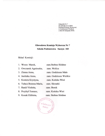 Załącznik Nr 7 do uchwały nr 6 /2010 Gminnej Komisji Wyborczej w Godzieszach Wielkich z dnia 02 listopada 20 l Or. Obwodowa Komisja Wyborcza Nr 7 Szkoła Podstawowa Saczyn 103 Skład Komisji: 1. Wrzos Marek, zam.Stobno Siódme 2. Owczarek Agnieszka, zam. Wolica 3. Zimna Anna, zam. Godziesze Małe 4. Jasińska Anna, zam. Godziesze Wielkie 5. Kostera Krystyna, zam. Końska Wieś 6. Tułacz Bożena Maria, zam. Skrzatki 7. Raniś Violetta, zam. Borek 8. Przybył Tomasz, zam. Końska Wieś 9. Kozak Elżbieta, zam. Stobno Siódme