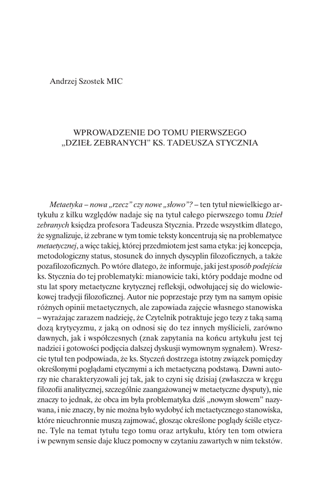 15 Andrzej Szostek MIC WPROWADZENIE DO TOMU PIERWSZEGO „DZIEŁ ZEBRANYCH” KS. TADEUSZA STYCZNIA Metaetyka – nowa „rzecz” czy nowe „słowo”? – ten tytuł niewielkiego artykułu z kilku względów nadaje się na tytuł całego pierwszego tomu Dzieł zebranych księdza profesora Tadeusza Stycznia. Przede wszystkim dlatego, że sygnalizuje, iż zebrane w tym tomie teksty koncentrują się na problematyce metaetycznej, a więc takiej, której przedmiotem jest sama etyka: jej koncepcja, metodologiczny status, stosunek do innych dyscyplin filozoficznych, a także pozafilozoficznych. Po wtóre dlatego, że informuje, jaki jest sposób podejścia ks. Stycznia do tej problematyki: mianowicie taki, który poddaje modne od stu lat spory metaetyczne krytycznej refleksji, odwołującej się do wielowiekowej tradycji filozoficznej. Autor nie poprzestaje przy tym na samym opisie różnych opinii metaetycznych, ale zapowiada zajęcie własnego stanowiska – wyrażając zarazem nadzieję, że Czytelnik potraktuje jego tezy z taką samą dozą krytycyzmu, z jaką on odnosi się do tez innych myślicieli, zarówno dawnych, jak i współczesnych (znak zapytania na końcu artykułu jest tej nadziei i gotowości podjęcia dalszej dyskusji wymownym sygnałem). Wreszcie tytuł ten podpowiada, że ks. Styczeń dostrzega istotny związek pomiędzy określonymi poglądami etycznymi a ich metaetyczną podstawą. Dawni autorzy nie charakteryzowali jej tak, jak to czyni się dzisiaj (zwłaszcza w kręgu filozofii analitycznej, szczególnie zaangażowanej w metaetyczne dysputy), nie znaczy to jednak, że obca im była problematyka dziś „nowym słowem” nazywana, i nie znaczy, by nie można było wydobyć ich metaetycznego stanowiska, które nieuchronnie muszą zajmować, głosząc określone poglądy ściśle etyczne. Tyle na temat tytułu tego tomu oraz artykułu, który ten tom otwiera i w pewnym sensie daje klucz pomocny w czytaniu zawartych w nim tekstów. 16 Andrzej Szostek MIC Są wśród nich dwa teksty, które dotąd nie były publikowane. Pierwszym z nich jest praca magisterska: Koncepcja cnoty u Mikołaja Hartmanna, napisana pod kierunkiem ks. bpa doc. dra hab. Karola Wojtyły w roku 1959, drugim zaś – rozprawa doktorska, zatytułowana Możliwość etyki naukowej u Johna Locke’a, obroniona w roku 1963, a napisana pod kierunkiem tego samego naukowego mistrza, późniejszego papieża Jana Pawła II, z którym ks. Styczeń współpracował aż do jego śmierci. Praca magisterska, formalnie biorąc, nie podejmuje problematyki ściśle metaetycznej, Czytelnik jednak łatwo zorientuje się, że krytyka, jakiej ks. Styczeń poddaje myśl Hartmanna, odnosi się – poprzez jego ujęcie cnoty – do prezentowanej przez tego filozofa całej koncepcji etyki, ze szczególnym podkreśleniem jej związku z przesłankami antropologicznymi i metafizycznymi. Tekst ten wart jest uwagi również dlatego, że pokazuje poziom naukowej dojrzałości, a także potencjał naukowej pasji, jaką już wówczas prezentował ks. Styczeń. Jak pisze prof. Ryszard Wiśniewski w swej recenzji wydawniczej, ta „znakomita praca magisterska ujmuje zagadnienie szeroko, wnikliwie i dojrzale, w sposób porównywalny z monografiami na stopień naukowy”. Wyraźnie metaetyczny charakter ma rozprawa doktorska, której tylko niewielki fragment został wcześniej opublikowany1. Obie te prace świadczą o tym, jak wielki wpływ na kształtowanie się sylwetki naukowej ks. Stycznia wywarli profesorowie, których słusznie uznaje się za twórców lubelskiej szkoły filozoficznej: ks. bp Karol Wojtyła, który ukierunkował jego etyczne zainteresowania i niejako „zaraził” go szczególną wrażliwością na godność ludzkiej osoby, o. prof. Albert M. Krąpiec, ukazujący metafizyczny wymiar wszelkich problemów filozoficznych, także etycznych (co widać zwłaszcza we wspomnianej pracy magisterskiej), oraz ks. prof. Stanisław Kamiński, któremu ks. Styczeń zawdzięcza wrażliwość na metodologiczną samoświadomość oraz logiczną precyzję wywodów, o czym świadczy szczególnie rozprawa doktorska. Teksty obu tych prac zostały zamieszczone w pierwszym tomie Dzieł zebranych, pokazują one bowiem sylwetkę młodego etyka, który w 1963 roku rozpoczął pracę jako adiunkt w Katolickim Uniwersytecie Lubelskim – i pozostał wierny tej pracy i tej uczelni przez całe swe twórcze i pracowite życie naukowe. Ważniejsze jest jednak to, że rozprawy te wyznaczają perspektywę nau1 T. Styczeń, Możliwość etyki naukowej u Johna Locke’a, „Roczniki Filozoficzne” 11(1963) z. 2, s. 87-109. Wprowadzenie do tomu pierwszego „Dzieł zebranych” 17 kowego rozwoju ks. Stycznia, perspektywę, którą konsekwentnie rozwijał i ubogacał aż do końca swej naukowej aktywności. Nie tyle więc o zachowanie porządku chronologicznego chodzi w proponowanym tu – w niniejszym tomie oraz w całej edycji Dzieł zebranych – układzie prac ks. Stycznia, ile raczej o to, by móc ów rozwój możliwie wiernie śledzić i jak najtrafniej odczytać podstawowe intuicje Autora, którym daje on wyraz niekiedy – zwłaszcza w początkowych studiach – w sposób wyraźny, z czasem jednak nadając swym przemyśleniom formę stylistyczną niełatwą dla mało przygotowanego Czytelnika. Już rozprawa Zarys etyki. Część I: Metaetyka (Lublin 1974) wymaga odeń skupionej uwagi, Autor bowiem wkłada wiele wysiłku w to, by jak najzwięźlej powiedzieć jak najwięcej. Rysuje w tej części podręcznika (po której, niestety, ks. Styczeń nie napisał dalszych2) własną koncepcję etyki, która wyrasta ze środowiska lubelskiej szkoły filozoficznej, rozwijającej myśl św. Tomasza z Akwinu, ale daleko odbiegającą od typowo tomistycznych jej ujęć3. W szczególności nacisk na doświadczalny punkt wyjścia etyki oraz na godność osoby jako źródło moralnej powinności działania pociągają za sobą krytykę takiego rozumienia et