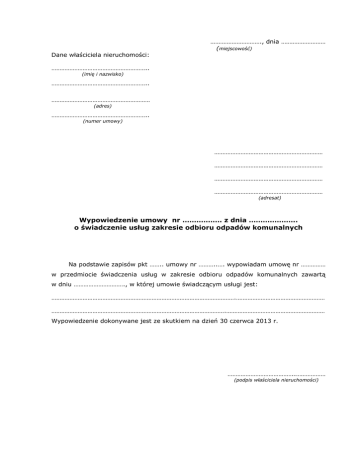 Dane właściciela nieruchomości: …………………………., dnia ……………………… (miejscowość) ………………………………………………….. (imię i nazwisko) ………………………………………………….. …………………………………………………… (adres) ………………………………………………….. (numer umowy) ………………………………………………………… ………………………………………………………… ………………………………………………………… ………………………………………………………… (adresat) Wypowiedzenie umowy nr …….………. z dnia ……….……….. o świadczenie usług zakresie odbioru odpadów komunalnych Na podstawie zapisów pkt …….. umowy nr ………..…. wypowiadam umowę nr …………… w przedmiocie świadczenia usług w zakresie odbioru odpadów komunalnych zawartą w dniu …………………………., w której umowie świadczącym usługi jest: ………………………………………………………………………………………………….……………………………………………… …………………………………………………………………………………………….…………………………………………………… Wypowiedzenie dokonywane jest ze skutkiem na dzień 30 czerwca 2013 r. …………………………………..……………… (podpis właściciela nieruchomości)