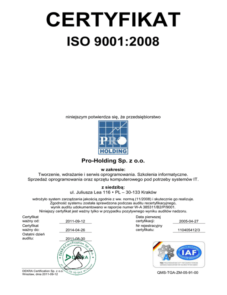CERTYFIKAT ISO 9001:2008 niniejszym potwierdza się, że przedsiębiorstwo Pro-Holding Sp. z o.o. w zakresie: Tworzenie, wdrażanie i serwis oprogramowania. Szkolenia informatyczne. Sprzedaż oprogramowania oraz sprzętu komputerowego pod potrzeby systemów IT. z siedzibą: ul. Juliusza Lea 116 s PL – 30-133 Kraków wdrożyło system zarządzania jakością zgodnie z ww. normą (11/2008) i skutecznie go realizuje. Zgodność systemu została sprawdzona podczas auditu recertyfikacyjnego, wynik auditu udokumentowano w raporcie numer W-A 385311/B2/P/9001. Niniejszy certyfikat jest ważny tylko w przypadku pozytywnego wyniku auditów nadzoru. Certyfikat ważny od: Certyfikat ważny do: Ostatni dzień auditu: DEKRA Certification Sp. z o.o. Wrocław, dnia 2011-09-12 2011-09-12 2014-04-26 Data pierwszej certyfikacji: Nr rejestracyjny certyfikatu: 2005-04-27 110405412/3 2011-08-30 QMS-TGA-ZM-05-91-00