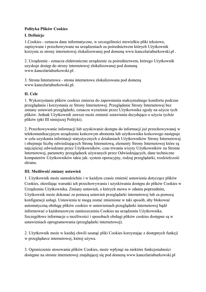 Polityka Plików Cookies I. Definicje 1.Cookies - oznacza dane informatyczne, w szczególności niewielkie pliki tekstowe, zapisywane i przechowywane na urządzeniach za pośrednictwem których Użytkownik korzysta ze strony internetowej zlokalizowanej pod domeną www.kancelariaburkowski.pl . 2. Urządzenie - oznacza elektroniczne urządzenie za pośrednictwem, którego Użytkownik uzyskuje dostęp do strony internetowej zlokalizowanej pod domeną www.kancelariaburkowski.pl . 3. Strona Internetowa - strona internetowa zlokalizowana pod domeną www.kancelariaburkowski.pl. II. Cele 1. Wykorzystanie plików cookies zmierza do zapewnienia maksymalnego komfortu podczas przeglądania i korzystania ze Strony Internetowej. Przeglądanie Strony Internetowej bez zmiany ustawień przeglądarki, oznacza wyrażenie przez Użytkownika zgody na użycie tych plików. Jednak Użytkownik zawsze może zmienić ustawienia decydujące o użyciu tychże plików (pkt III niniejszej Polityki). 2. Przechowywanie informacji lub uzyskiwanie dostępu do informacji już przechowywanej w telekomunikacyjnym urządzeniu końcowym abonenta lub użytkownika końcowego następuje w celu uzyskania informacji statystycznych o działaniach Użytkowników Strony Internetowej i obejmuje liczbę odwiedzających Stronę Internetową, elementy Strony Internetowej które są najczęściej odwiedzane przez Użytkowników, czas trwania wizyty Użytkowników na Stronie Internetowej, parametry przeglądarek używanych przez Odwiedzających, dane techniczne komputerów Użytkowników takie jak: system operacyjny, rodzaj przeglądarki, rozdzielczość ekranu. III. Możliwość zmiany ustawień 1. Użytkownik może samodzielnie i w każdym czasie zmienić ustawienia dotyczące plików Cookies, określając warunki ich przechowywania i uzyskiwania dostępu do plików Cookies w Urządzeniu Użytkownika. Zmiany ustawień, o których mowa w zdaniu poprzednim, Użytkownik może dokonać za pomocą ustawień przeglądarki internetowej lub za pomocą konfiguracji usługi. Ustawienia te mogą zostać zmienione w taki sposób, aby blokować automatyczną obsługę plików cookies w ustawieniach przeglądarki internetowej bądź informować o każdorazowym zamieszczeniu Cookies na urządzeniu Użytkownika. Szczegółowe informacje o możliwości i sposobach obsługi plików cookies dostępne są w ustawieniach oprogramowania (przeglądarki internetowej). 2. Użytkownik może w każdej chwili usunąć pliki Cookies korzystając z dostępnych funkcji w przeglądarce internetowej, której używa. 3. Ograniczenie stosowania plików Cookies, może wpłynąć na niektóre funkcjonalności dostępne na stronie internetowej znajdującej się pod domeną www.kancelariaburkowski.pl