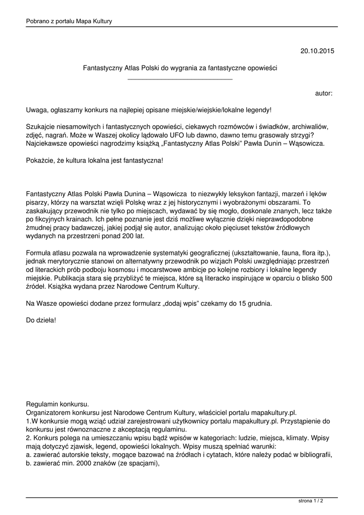 Pobrano z portalu Mapa Kultury 20.10.2015 Fantastyczny Atlas Polski do wygrania za fantastyczne opowieści ____________________________ autor: Uwaga, ogłaszamy konkurs na najlepiej opisane miejskie/wiejskie/lokalne legendy! Szukajcie niesamowitych i fantastycznych opowieści, ciekawych rozmówców i świadków, archiwaliów, zdjęć, nagrań. Może w Waszej okolicy lądowało UFO lub dawno, dawno temu grasowały strzygi? Najciekawsze opowieści nagrodzimy książką „Fantastyczny Atlas Polski” Pawła Dunin – Wąsowicza. Pokażcie, że kultura lokalna jest fantastyczna! Fantastyczny Atlas Polski Pawła Dunina – Wąsowicza to niezwykły leksykon fantazji, marzeń i lęków pisarzy, którzy na warsztat wzięli Polskę wraz z jej historycznymi i wyobrażonymi obszarami. To zaskakujący przewodnik nie tylko po miejscach, wydawać by się mogło, doskonale znanych, lecz także po fikcyjnych krainach. Ich pełne poznanie jest dziś możliwe wyłącznie dzięki nieprawdopodobne żmudnej pracy badawczej, jakiej podjął się autor, analizując około pięciuset tekstów źródłowych wydanych na przestrzeni ponad 200 lat. Formuła atlasu pozwala na wprowadzenie systematyki geograficznej (ukształtowanie, fauna, flora itp.), jednak merytorycznie stanowi on alternatywny przewodnik po wizjach Polski uwzględniając przestrzeń od literackich prób podboju kosmosu i mocarstwowe ambicje po kolejne rozbiory i lokalne legendy miejskie. Publikacja stara się przybliżyć te miejsca, które są literacko inspirujące w oparciu o blisko 500 źródeł. Książka wydana przez Narodowe Centrum Kultury. Na Wasze opowieści dodane przez formularz „dodaj wpis” czekamy do 15 grudnia. Do dzieła! Regulamin konkursu. Organizatorem konkursu jest Narodowe Centrum Kultury, właściciel portalu mapakultury.pl. 1.W konkursie mogą wziąć udział zarejestrowani użytkownicy portalu mapakultury.pl. Przystąpienie do konkursu jest równoznaczne z akceptacją regulaminu. 2. Konkurs polega na umieszczaniu wpisu bądź wpisów w kategoriach: ludzie, miejsca, klimaty. Wpisy mają dotyczyć zjawisk, legend, opowieści lokalnych. Wpisy muszą spełniać warunki: a. zawierać autorskie teksty, mogące bazować na źródłach i cytatach, które należy podać w bibliografii, b. zawierać min. 2000 znaków (ze spacjami), strona 1 / 2 Pobrano z portalu Mapa Kultury c. muszą być opatrzone zdjęciem, publikowanym bez naruszenia praw autorskich (zamieszczanie zdjęć na licencji CC wymaga podania źródła i autora), d. muszą być opatrzone dopiskiem „Konkurs” na końcu tekstu. 3. Redakcja nagrodzi trzy osoby, których wpis/wpisy najlepiej spełniające warunki. Wyboru dokona jury, w składu którego wchodzą redaktorzy portali NCK.Termin dodania wpisów mija 15 grudnia 2015 o godz. 23:50. Ogłoszenie konkursu nastąpi na portalu mapakultury.pl . 4. Nagrodą są 3 książki „Fantastyczny Atlas Polski” oraz pakiet nagród rzeczowych. Nagrody nie podlegają wymianie na ekwiwalent pieniężny. Jedna osoba może wygrać jedną książkę. 5. Zwycięzca jest zobowiązany do podania organizatorowi danych personalnych, niezbędnych do odbioru nagrody. 6. Organizator zastrzega sobie prawo do nierozstrzygnięcia, odwołania lub przerwania konkursu. strona 2 / 2