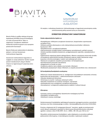 W związku z rozbudową Sanatorium Uzdrowiskowego w Augustowie poszukujemy osoby zainteresowanej pełną wyzwań pracą na stanowisku: DYREKTOR OPERACYJNY SANATORIUM Biavita Polska to spółka należąca do grupy kapitałowej SATORIA Group SA działającej na rynku od ponad 40 lat lidera w organizacji i zarządzaniu obiektami hotelarsko-konferencyjnymi oraz wynajmie powierzchni biurowych Biavita Polska jest właścicielem 6 obiektów, jednym z nich jest Sanatorium Uzdrowiskowe Augustów Sanatorium Uzdrowiskowe Augustów ze względu na swoje położenie i bardzo wysoki poziom świadczonych usług to idealne miejsce na regenerację sił i poprawę stanu zdrowia. Osoba odpowiedzialna będzie za: •Kompleksowe i efektywne zarządzanie Sanatorium, bezpośrednie raportowanie zarządowi firmy •Aktywna polityka akwizycyjna w celu maksymalizacji przychodów i obłożenia Sanatorium i SPA •Współtworzenie i zarządzanie budżetem •Opracowywanie strategii działań marketingowo-sprzedażowych, polityki cenowej •Analiza wyników działania Sanatorium, przygotowywanie raportów, zawiadamianie o ryzykach •Zapewnienie najwyższej jakości obsługi Klienta i dbanie o pozytywny wizerunek ośrodka •Prowadzenie optymalizacji kosztów działalności poprzez wybór dostawców usług i towarów w formie przetargów i nadzór nad realizacją tych umów •Skuteczne zarządzanie zespołem pracowników i ich kompetencjami •Koordynowanie procesów zatrudnienia •Reagowanie na trendy na rynku •Codzienny udział w życiu obiektu oraz kontakt z Klientami •Budowanie pozytywnych relacji z Klientami, w zespole pracowników oraz z dostawcami Od kandydatów/kandydatek oczekujemy: •Minimum 3-letnie doświadczenie na analogicznym lub podobnym stanowisku w branży hotelarskiej lub Sanatoryjnej, z udokumentowanymi sukcesami •Wysoka świadomość biznesowa •Orientacja na wyniki i realizacja założonych celów •Wysokie nastawienie na szukanie rozwiązań, usprawnień •Doświadczenie oraz umiejętność zarządzania personelem •Konsekwencji I umiejętności podejmowania szybkich I trafnych decyzji Oferujemy: •Umowę o pracę w wiarygodnej I dynamicznie rozwijającej się firmie •Niezbędne narzędzia pracy •Możliwość rozwoju osobistego Zainteresowanych kandydatów spełniających powyższe wymagania prosimy o przesłanie życiorysu oraz listu motywacyjnego na adres: [email protected] do dnia 15.04.2016r. Prosimy o dopisanie do CV następującej klauzuli: “wyrażam, zgodę na przetwarzanie moich danych osobowych zawartych w ofercie pracy dla potrzeb procesu rekrutacji zgodnie z ustawa z dnia 27.08.1997r. Dz.U. z 2002r., NR. 101, poz. 923 ze zm.” Wszystkim zainteresowanym kandydatom z góry dziękujemy za przesłane aplikacje, jednocześnie informujemy, iż skontaktujemy się tylko z wybranymi osobami