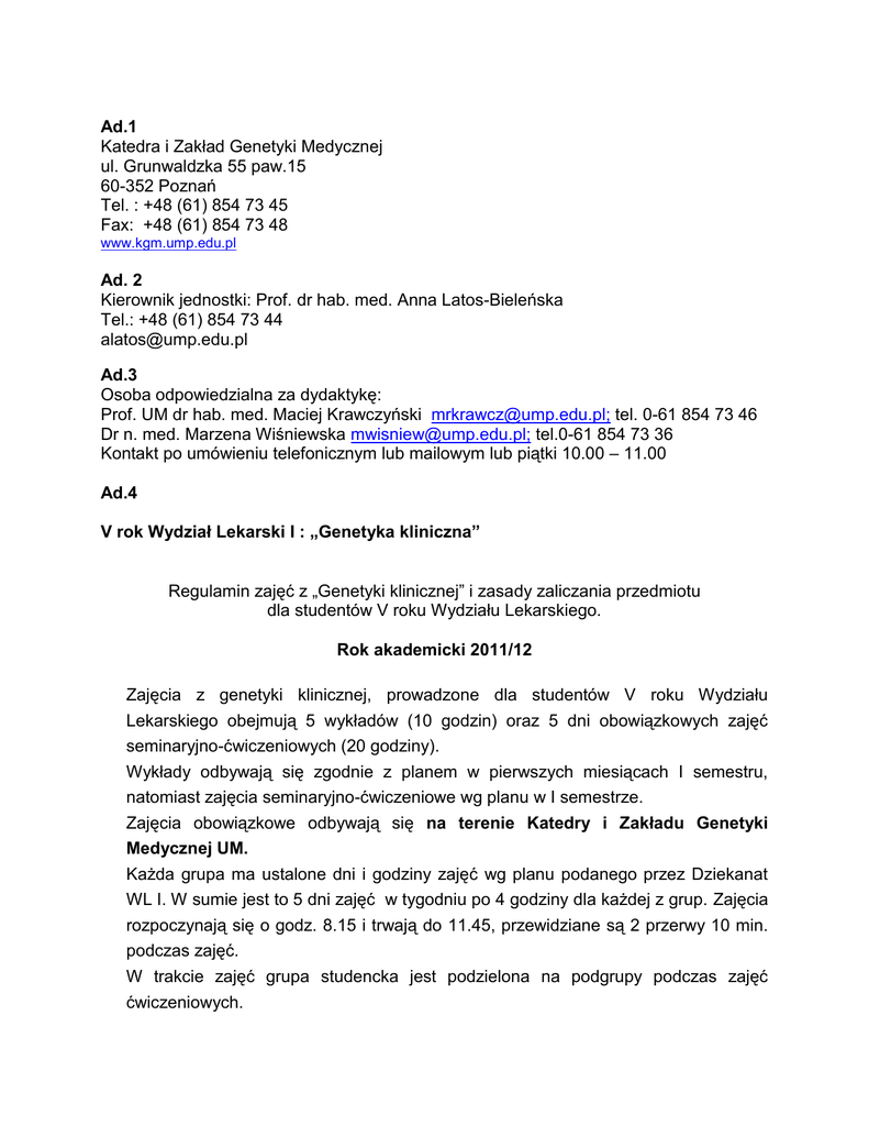 Ad.1 Katedra i Zakład Genetyki Medycznej ul. Grunwaldzka 55 paw.15 60-352 Poznań Tel. : +48 (61) 854 73 45 Fax: +48 (61) 854 73 48 www.kgm.ump.edu.pl Ad. 2 Kierownik jednostki: Prof. dr hab. med. Anna Latos-Bieleńska Tel.: +48 (61) 854 73 44 [email protected] Ad.3 Osoba odpowiedzialna za dydaktykę: Prof. UM dr hab. med. Maciej Krawczyński [email protected]; tel. 0-61 854 73 46 Dr n. med. Marzena Wiśniewska [email protected]; tel.0-61 854 73 36 Kontakt po umówieniu telefonicznym lub mailowym lub piątki 10.00 – 11.00 Ad.4 V rok Wydział Lekarski I : „Genetyka kliniczna” Regulamin zajęć z „Genetyki klinicznej” i zasady zaliczania przedmiotu dla studentów V roku Wydziału Lekarskiego. Rok akademicki 2011/12 Zajęcia z genetyki klinicznej, prowadzone dla studentów V roku Wydziału Lekarskiego obejmują 5 wykładów (10 godzin) oraz 5 dni obowiązkowych zajęć seminaryjno-ćwiczeniowych (20 godziny). Wykłady odbywają się zgodnie z planem w pierwszych miesiącach I semestru, natomiast zajęcia seminaryjno-ćwiczeniowe wg planu w I semestrze. Zajęcia obowiązkowe odbywają się na terenie Katedry i Zakładu Genetyki Medycznej UM. Każda grupa ma ustalone dni i godziny zajęć wg planu podanego przez Dziekanat WL I. W sumie jest to 5 dni zajęć w tygodniu po 4 godziny dla każdej z grup. Zajęcia rozpoczynają się o godz. 8.15 i trwają do 11.45, przewidziane są 2 przerwy 10 min. podczas zajęć. W trakcie zajęć grupa studencka jest podzielona na podgrupy podczas zajęć ćwiczeniowych. Możliwa jest jedna usprawiedliwiona nieobecność podczas jednego dnia zajęć. W przypadku 2 nieobecności, konieczne jest ich odrobienie z inną grupą ćwiczeniową, ale możliwe jest przystąpienie do kolokwium zaliczeniowego z własną grupą. W razie więcej niż dwóch nieobecności, student nie może przystępować do kolokwium zaliczeniowego z własną grupą, a może to zrobić z inną grupą dopiero po odrobieniu zaległości. Dwa spóźnienia traktowane są jak jedna nieobecność (konsekwencje j.w.). Odrobienie zajęć z inną grupą studencką jest możliwe jedynie w wyjątkowych, uzasadnionych przypadkach i wyłącznie po uprzednim uzgodnieniu terminu. Ad. 5 i 6 V rok Wydział lekarski I Cel nauczania przedmiotu Opanowanie podstawowych wiadomości z zakresu genetyki klinicznej oraz poradnictwa genetycznego. Poznanie aktualnego stanu wiedzy w zakresie genetyki klinicznej – przygotowanie do kontaktu z pacjentem chorującym na choroby uwarunkowane genetycznie oraz do współpracy z lekarzem poradni genetycznej i specjalistami z innych dziedzin medycyny. Ad. 7 Program zajęć: „Genetyka kliniczna” Zakres tematyczny: Wykłady: 5x2h 1. Neurogenetyka (prof. Anna Latos-Bieleńska) 2. Dziedziczne choroby tkanki łącznej i inne choroby monogenowe (prof. Anna Latos-Bieleńska). 3. Genetycznie uwarunkowane choroby narządu wzroku (prof. Maciej Krawczyński). 4. Zespoły mikrodelecji (dr n. med. Marzena Wiśniewska). 5. Zespoły zaburzeń płciowych (prof. Maciej Krawczyński). Seminaria i ćwiczenia: 5x4h 1. Bazy danych w genetyce 2. Zasady poradnictwa genetycznego – wybrane przykłady kliniczne 3. Aberracje chromosomowe – diagnostyka, przykłady kliniczne 4. Wrodzone wady rozwojowe – diagnostyka, przykłady kliniczne 5. Upośledzenie umysłowe – diagnostyka, przykłady kliniczne 6. Choroby metaboliczne – wybrane sytuacje kliniczne 7. Ryzyko genetyczne w wybranych przypadkach klinicznych 8. Nowotwory dziedziczne – diagnostyka i poradnictwo genetyczne 9. Niepowodzenia rozrodu 10. Diagnostyka prenatalna Ad. 8 Forma zaliczenia zajęć Tydzień przed rozpoczęciem zajęć odbywa się ustne kolokwium wstępne obejmujące materiał z zajęć z „Podstaw genetyki medycznej” z II r. Starosta każdej grupy ustala termin kolokwium wstępnego dla swojej grupy z odpowiednim wyprzedzeniem. Kolokwium zaliczeniowe obejmuje materiał z seminariów i ćwiczeń, i odbywa się w formie pisemnej w ostatnim dniu zajęć (forma opisowa) lub w innym dniu w uzasadnionych przypadkach na prośbę całej grupy. Jego wyniki (bez ocen, a jedynie w formie zaliczenia) ogłaszane są najpóźniej po tygodniu. W razie nie zaliczenia pisemnego kolokwium zaliczeniowego, kolokwium poprawkowe odbywa się w formie ustnej u jednego z asystentów prowadzących zajęcia. Zaliczenie przedmiotu następuje po odrobieniu wszelkich zaległości. W przypadku zaistnienia uzasadnionej potrzeby, istnieje możliwość zaplanowania dodatkowego terminu odrabiania zajęć seminaryjno-ćwiczeniowych i zaliczania kolokwium po zakończeniu zaplanowanych na V roku zajęć. Egzamin końcowy Egzamin końcowy obejmuje materiał przekazywany podczas wykładów i zajęć na II i V roku studiów. Egzamin odbywa się w formie pisemnej w dwóch terminach: po ukończeniu wykładów i zajęć przez wszystkie grupy studenckie oraz w czerwcu lub wrześniu. Informacja o terminach egzaminów, godzinie i miejscu odbycia egzaminu jest umieszczana na stronie internetowej Katedry z odpowiednim wyprzedzeniem. Egzamin trwa 90 minut, na egzamin składa się 80 pytań testowych ( po 1 punkcie) i jedno pytanie problemowe (za 0-10 punktów), tylko jedna odpowiedź jest prawidłowa. Istnieje możliwość zdawania egzaminu w przedterminie w formie ustnej dla studentów, którzy planują wyjazd zagranicę w ramach stypendiów uczelnianych. Warunki do spełnienia: zaświadczenie z dziekanatu o wyjeździe zagranicę, podanie do Pani Prof. dr hab. med. Anny Latos-Bieleńskiej z prośbą o dopuszczenie do egzaminu w przedterminie. Termin egzaminu zostanie ustalony indywidualnie po złożeniu powyższych dokumentów w Sekretariacie Katedry i Zakładu Genetyki Medycznej. Ad. 9 Materiały dydaktyczne, literatura obowiązująca i uzupełniająca: Konspekty na stronie internetowej Katedry z zajęć obowiązkowych: www.kgm.ump.edu.pl Bradley JR, Johnson DR, Pober BR: Genetyka medyczna. Wyd. I, Wydawnictwo Lekarskie PZWL , Warszawa 2009 – podstawowy