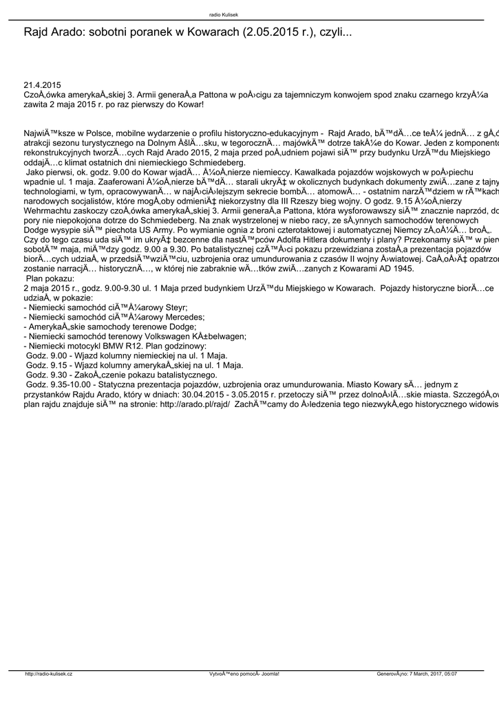 radio Kulisek Rajd Arado: sobotni poranek w Kowarach (2.05.2015 r.), czyli... 21.4.2015 CzoÅ‚ówka amerykaÅ„skiej 3. Armii generaÅ‚a Pattona w poÅ›cigu za tajemniczym konwojem spod znaku czarnego krzyża zawita 2 maja 2015 r. po raz pierwszy do Kowar! NajwiÄ™ksze w Polsce, mobilne wydarzenie o profilu historyczno-edukacyjnym - Rajd Arado, bÄ™dÄ…ce też jednÄ… z gÅ‚ó atrakcji sezonu turystycznego na Dolnym ÅšlÄ…sku, w tegorocznÄ… majówkÄ™ dotrze także do Kowar. Jeden z komponentó rekonstrukcyjnych tworzÄ…cych Rajd Arado 2015, 2 maja przed poÅ‚udniem pojawi siÄ™ przy budynku UrzÄ™du Miejskiego oddajÄ…c klimat ostatnich dni niemieckiego Schmiedeberg. Jako pierwsi, ok. godz. 9.00 do Kowar wjadÄ… żoÅ‚nierze niemieccy. Kawalkada pojazdów wojskowych w poÅ›piechu wpadnie ul. 1 maja. Zaaferowani żoÅ‚nierze bÄ™dÄ… starali ukryć w okolicznych budynkach dokumenty zwiÄ…zane z tajny technologiami, w tym, opracowywanÄ… w najÅ›ciÅ›lejszym sekrecie bombÄ… atomowÄ… - ostatnim narzÄ™dziem w rÄ™kach narodowych socjalistów, które mogÅ‚oby odmienić niekorzystny dla III Rzeszy bieg wojny. O godz. 9.15 żoÅ‚nierzy Wehrmachtu zaskoczy czoÅ‚ówka amerykaÅ„skiej 3. Armii generaÅ‚a Pattona, która wysforowawszy siÄ™ znacznie naprzód, do pory nie niepokojona dotrze do Schmiedeberg. Na znak wystrzelonej w niebo racy, ze sÅ‚ynnych samochodów terenowych Dodge wysypie siÄ™ piechota US Army. Po wymianie ognia z broni czterotaktowej i automatycznej Niemcy zÅ‚ożą broÅ„. Czy do tego czasu uda siÄ™ im ukryć bezcenne dla nastÄ™pców Adolfa Hitlera dokumenty i plany? Przekonamy siÄ™ w pierw sobotÄ™ maja, miÄ™dzy godz. 9.00 a 9.30. Po batalistycznej części pokazu przewidziana zostaÅ‚a prezentacja pojazdów biorÄ…cych udziaÅ‚ w przedsiÄ™wziÄ™ciu, uzbrojenia oraz umundurowania z czasów II wojny Å›wiatowej. CaÅ‚ość opatrzon zostanie narracjÄ… historycznÄ…, w której nie zabraknie wÄ…tków zwiÄ…zanych z Kowarami AD 1945. Plan pokazu: 2 maja 2015 r., godz. 9.00-9.30 ul. 1 Maja przed budynkiem UrzÄ™du Miejskiego w Kowarach. Pojazdy historyczne biorÄ…ce udziaÅ‚ w pokazie: - Niemiecki samochód ciężarowy Steyr; - Niemiecki samochód ciężarowy Mercedes; - AmerykaÅ„skie samochody terenowe Dodge; - Niemiecki samochód terenowy Volkswagen Kűbelwagen; - Niemiecki motocykl BMW R12. Plan godzinowy: Godz. 9.00 - Wjazd kolumny niemieckiej na ul. 1 Maja. Godz. 9.15 - Wjazd kolumny amerykaÅ„skiej na ul. 1 Maja. Godz. 9.30 - ZakoÅ„czenie pokazu batalistycznego. Godz. 9.35-10.00 - Statyczna prezentacja pojazdów, uzbrojenia oraz umundurowania. Miasto Kowary sÄ… jednym z przystanków Rajdu Arado, który w dniach: 30.04.2015 - 3.05.2015 r. przetoczy siÄ™ przez dolnoÅ›lÄ…skie miasta. SzczegóÅ‚ow plan rajdu znajduje siÄ™ na stronie: http://arado.pl/rajd/ ZachÄ™camy do Å›ledzenia tego niezwykÅ‚ego historycznego widowisk http://radio-kulisek.cz VytvoÅ™eno pomocÃ- Joomla! Generováno: 7 March, 2017, 05:07