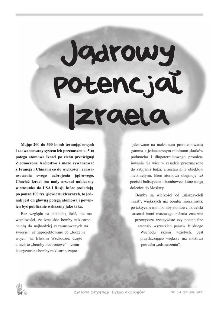 Mając 200 do 500 bomb termojądrowych jektowane na maksimum promieniowania i zaawansowany system ich przenoszenia, 5-ta gamma z jednoczesnym minimum skutków potęga atomowa Izrael po cichu prześcignął podmuchu i długoterminowego promien- Zjednoczone Królestwo i może rywalizować iowania. Są więc w zasadzie przeznaczone z Francją i Chinami co do wielkości i zaawa- do zabijania ludzi, a zostawiania obiektów nsowania jądrowego. nietkniętymi. Broń atomowa obejmuje też Chociaż Izrael ma mały arsenał nuklearny pociski balistyczne i bombowce, które mogą w stosunku do USA i Rosji, które posiadają dolecieć do Moskwy. swego uzbrojenia po ponad 100 tys. głowic nuklearnych, to jednak jest on główną potęgą atomową i powinien być publicznie wskazany jako taka. Bez względu na dokładną ilość, nie ma wątpliwości, że izraelskie bomby nuklearne należą do najbardziej zaawansowanych na Bomby są wielkości od „niszczycieli miast”, większych niż bomba hiroszimska, po taktyczne mini bomby atomowe. Izraelski arsenał broni masowego rażenia znacznie przewyższa rzeczywiste czy potencjalne arsenały wszystkich państw Bliskiego świecie i są zaprojektowane do „toczenia Wschodu wojen” na Bliskim Wschodzie. Część przytłaczająco większy niż możliwa z nich to „bomby neutronowe” – zmin- potrzeba „odstraszenia”. iaturyzowane bomby nuklearne, zapro- 54 razem wziętych. Jest Wielu bliskowschodnich aktywistów pokojowych ma opory dyskutować (nie mówiąc o kwestionowaniu) o izraelskim monopolu na broń atomową w regionie, co często powoduje powstawanie niekompletnych i niepoinformowanych analiz oraz wadliwych strategii aktywizmu. Postawienie kwestii izraelskiej BMR bezpośrednio i uczciwie przed opinią publiczną i w planach działań miałoby kilka korzystnych skutków. Po pierwsze, pokazałoby zasadniczy element destabilizacji na Bliskim Wschodzie, który napędza tam wyścig zbrojeń i zmusza państwa do osiągania własnego poziomu „odstraszenia”. Po drugie, wyeksponowałoby groteskowy podwójny standard, w którym USA i Europa potępiają Irak, Iran i Syrię za rozwój BMR, jednocześnie chroniąc i legitymizując głównego sprawcę wyścigu. Po trzecie, zdemaskowanie nuklearnej strategii Izraela skupiłoby uwagę międzynarodowej opinii publicznej, dając większą presję na rozbrojenie izraelskiej BMR i negocjacje sprawiedliwego pokoju w dobrej wierze. W końcu, Izrael bez broni atomowej przybliżyłby urzeczywistnienie Bezatomowego Bliskiego Wschodu, a szeroką regionalną umowę pokojową uczyniłby o wiele bardziej prawdopodobną. Nie ma szans na faktyczne rozwiązanie konfliktu izraelsko-arabskiego, jeśli i dopóki społeczność światowa nie zweryfikuje tajnego programu nuklearnego Izraela. Izraelskie społeczeństwo może nawet liczy na to u schyłku ery Szarona. John Steinbach tłumaczył Piotr Bein Israel’s Nuclear Arsenal, www.globalresearch.ca/articles/STE203A.html 55