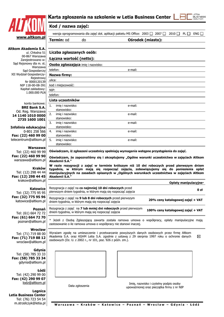 Karta zgłoszenia na szkolenie w Letia Business Center Kod / nazwa zajęć: www.altkom.pl Altkom Akademia S.A. ul. Chłodna 51 00-867 Warszawa Zarejestrowano w: Sąd Rejonowy dla m. st. Warszawa Sąd Gospodarczy XII Wydział GospodarczyRejestrowy Nr 0000120139 NIP 118-00-08-391 Kapitał zakładowy: 1.000.000 PLN konto bankowe: BRE Bank S.A. Od. Reg. Warszawa 14 1140 1010 0000 2735 1600 1001 Infolinia edukacyjna 0-801 258 566 Fax: (22) 460 99 00 [email protected] Warszawa Tel: (22) 460 99 99 Fax: (22) 460 99 90 [email protected] Kraków Tel: (12) 298 44 44 Fax: (12) 298 44 45 [email protected] wersja oprogramowania dla zajęć dot. aplikacji pakietu MS Office: 2003 Termin: od do 2007 2010 PL ENG Ośrodek (miasto): Liczba zgłaszanych osób: Łączna wartość (netto): Osoba zgłaszająca imię i nazwisko: telefon: e-mail: Nazwa firmy: ulica: kod i miejscowość: NIP: telefon: Lista uczestników 1. 2. 3. 4. 5. imię i nazwisko: stanowisko: imię i nazwisko: stanowisko: imię i nazwisko: stanowisko: imię i nazwisko: stanowisko: imię i nazwisko: stanowisko: e-mail: e-mail: e-mail: e-mail: e-mail: Oświadczam, iż zgłoszeni uczestnicy spełniają wymagania wstępne przystąpienia do zajęć. Oświadczam, że zapoznaliśmy się i akceptujemy „Ogólne warunki uczestnictwa w zajęciach Altkom Akademii S.A.” W razie rezygnacji z zajęć w terminie krótszym niż 10 dni roboczych przed pierwszym dniem tygodnia, w którym mają się rozpocząć zajęcia, zobowiązujemy się do poniesienia opłat manipulacyjnych na zasadach opisanych w „Ogólnych warunkach uczestnictwa w zajęciach Altkom Akademii S.A.” Opłaty manipulacyjne* Katowice Tel: (32) 775 95 95 Fax: (32) 775 95 96 [email protected] Rezygnacja z zajęć na co najmniej 10 dni roboczych przed pierwszym dniem tygodnia, w którym mają się rozpocząć zajęcia 0 zł Rezygnacja z zajęć na 9 lub 8 dni roboczych przed pierwszym dniem tygodnia, w którym mają się rozpocząć zajęcia 20% ceny katalogowej zajęć + VAT Poznań Tel: (61) 664 72 72 Fax: (61) 664 72 70 [email protected] Rezygnacja z zajęć na 7 lub mniej dni roboczych przed pierwszym dniem tygodnia, w którym mają się rozpocząć zajęcia Wrocław Tel: (71) 719 88 00 Fax: (71) 719 88 12 [email protected] 100% ceny katalogowej zajęć + VAT * Jeżeli z Osobą Zgłaszającą zawarta została ramowa umowa o współpracy, opłaty manipulacyjne mają zastosowanie o ile ramowa umowa o współpracy nie stanowi inaczej. Wyrażam zgodę na umieszczenie i przetwarzanie powyższych danych osobowych przez firmę Altkom Akademia S.A. oraz KGHM Letia S.A. zgodnie z ustawą z 29 sierpnia 1997 roku o ochronie danych osobowych (Dz. U. z 2002 r., nr 101, poz. 926 z późn. zm.). Gdynia Tel: (58) 785 33 33 Fax: (58) 785 33 34 [email protected] Łódź Tel: (42) 290 99 00 Fax: (42) 290 99 07 [email protected] Legnica Letia Business Center Tel: (76) 723 54 54 [email protected] Data zgłoszenia Imię, nazwisko i czytelny podpis osoby upoważnionej oraz pieczątka firmy z nr NIP Warszawa – Kraków – Katowice – Poznań – Wrocław – Gdynia - Łódź Ogólne warunki uczestnictwa w zajęciach Altkom Akademii S.A. I. Zgłoszenie 1. Wstępne zgłoszenie uczestnictwa w zajęciach oferowanych przez Altkom Akademię S.A. z siedzibą w Warszawie (dalej jako Altkom Akademia) rozumie się przez: 1.1. wypełnienie zgłoszenia online na witrynie internetowej Altkom Akademii lub 1.2. przesłanie zgłoszenia pocztą elektroniczną do przedstawiciela handlowego Altkom Akademii lub do wybranego Ośrodka Altkom Akademii. 2. W przypadku zgłoszenia online lub przesłania wiadomości pocztą elektroniczną, w najbliższym dniu roboczym następującym po dniu zgłoszenia, przedstawiciel handlowy Altkom Akademii skontaktuje się z Osobą Zgłaszającą (tj. osoba wymienioną w Karcie zgłoszenia na zajęcia jako Osoba Zgłaszająca) w celu uzgodnienia szczegółów uczestnictwa w zajęciach. 3. Po uzgodnieniu zakresu i terminu zajęć z przedstawicielem handlowym Altkom Akademii należy wydrukować i wypełnić Kartę Zgłoszenia na zajęcia dostępną w witrynie internetowej Altkom Akademii lub skorzystać z Karty Zgłoszenia otrzymanej pocztą elektroniczną od przedstawiciela handlowego. 3.1. W przypadku osób fizycznych, które nie prowadzą działalności gospodarczej, Karta Zgłoszenia musi być podpisana przez osobę, która zamierza wziąć udział w zajęciach (bądź opiekuna prawnego w przypadku osób niepełnoletnich). 3.2. W przypadku pozostałych podmiotów Karta Zgłoszenia musi być podpisana przez osobę uprawnioną do zaciągania zobowiązań finansowych w imieniu firmy zgłaszającej. 3.3. Podpis na Karcie Zgłoszenia potwierdza akceptację „Ogólnych warunków uczestnictwa w zajęciach Altkom Akademii S.A.”, w tym przyjęcie warunków organizacyjnych i finansowych realizacji usługi oraz upoważnia Altkom Akademię do wystawienia faktury VAT. 4. Podstawą uczestnictwa w zajęciach jest przesłanie prawidłowo wypełnionej Karty Zgłoszenia faksem lub w formie skanu pocztą elektroniczną do przedstawiciela handlowego lub Ośrodka Altkom Akademii, wraz z akceptacją „Ogólnych warunków uczestnictwa w zajęciach Altkom Akademii S.A.” na co najmniej 10 dni roboczych przed pierwszym dniem tygodnia, w którym mają rozpocząć się zajęcia. 5. W przypadku osób fizycznych dodatkowym warunkiem przyjęcia zgłoszenia na zajęcia jest wniesienie opłaty w wysokości 100% ceny zajęć + VAT z zastrzeżeniem poniższego pkt. II. Warunki Płatności. 6. Przed rozpoczęciem zajęć Osoba Zgłaszająca otrzyma telefonicznie lub pocztą elektroniczną potwierdzenie realizacji zajęć w umówionym terminie. 7. Jeżeli z pomiędzy Altkom Akademią a Osobą Zgłaszającą zawarta została ramowa umowa o współpracy, postanowienia niniejszych „Ogólnych warunków uczestnictwa w zajęciach Altkom Akademii S.A.” mają zastosowanie, o ile nie są sprzeczne z postanowieniami ramowej umowy 