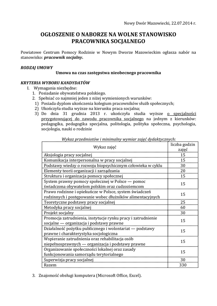 Nowy Dwór Mazowiecki, 22.07.2014 r. OGŁOSZENIE O NABORZE NA WOLNE STANOWISKO PRACOWNIKA SOCJALNEGO Powiatowe Centrum Pomocy Rodzinie w Nowym Dworze Mazowieckim ogłasza nabór na stanowisko: pracownik socjalny. RODZAJ UMOWY Umowa na czas zastępstwa nieobecnego pracownika KRYTERIA WYBORU KANDYDATÓW I. Wymagania niezbędne: 1. Posiadanie obywatelstwa polskiego. 2. Spełniać co najmniej jeden z niżej wymienionych warunków: 1) Posiada dyplom ukończenia kolegium pracowników służb społecznych; 2) Ukończyła studia wyższe na kierunku praca socjalna; 3) Do dnia 31 grudnia 2013 r. ukończyła studia wyższe o specjalności przygotowującej do zawodu pracownika socjalnego na jednym z kierunków: pedagogika, pedagogika specjalna, politologia, polityka społeczna, psychologia, socjologia, nauki o rodzinie Wykaz przedmiotów i minimalny wymiar zajęć dydaktycznych: liczba godzin Wykaz zajęć zajęć Aksjologia pracy socjalnej 15 Komunikacja interpersonalna w pracy socjalnej 15 Podstawy wiedzy o rozwoju biopsychicznym człowieka w cyklu 30 Elementy teorii organizacji i zarządzania 20 Struktura i organizacja pomocy społecznej 15 System prawny pomocy społecznej w Polsce — pomoc 15 świadczona obywatelom polskim oraz cudzoziemcom Prawo rodzinne i opiekuńcze w Polsce, system świadczeń 15 rodzinnych i postępowanie wobec dłużników alimentacyjnych Teoretyczne podstawy pracy socjalnej 25 Metodyka pracy socjalnej 60 Projekt socjalny 30 Promocja zatrudnienia, instytucje rynku pracy i zatrudnienie 15 socjalne — organizacja i podstawy prawne Działalność pożytku publicznego i wolontariat — podstawy 15 prawne i charakterystyka socjologiczna Wspieranie zatrudnienia oraz rehabilitacja osób 15 niepełnosprawnych — organizacja i podstawy prawne Organizowanie społeczności lokalnej oraz zasady 15 funkcjonowania samorządu terytorialnego Superwizja pracy socjalnej 30 Razem 330 3. Znajomość obsługi komputera (Microsoft Office, Excel). 4. Posiadanie pełnej zdolności do czynności prawnych oraz korzystanie z pełni praw publicznych. 5. Niekaralność za przestępstwo popełnione umyślnie. 6. Stan zdrowia pozwalający na wykonanie zawodu pracownik socjalny. II. Wymagania dodatkowe (pożądane): 1. Znajomość ustawy o pomocy społecznej. 2. Znajomość ustawy o wspieraniu rodziny i systemie pieczy zastępczej. 3. Znajomość ustawy o przeciwdziałaniu przemocy w rodzinie. 4. Znajomość przepisów Kodeksu postępowania administracyjnego. 5. Znajomość zagadnień dot. samorządu terytorialnego. 6. Posiadanie prawa jazdy kategorii „B”. 7. Mile widziane doświadczenie zawodowe w tym praktyka, staż. III. Preferowane cechy osobowości kandydata: 1. Punktualność, 2. Odporność na stres, 3. Umiejętność pracy w zespole, 4. Zaangażowanie w wykonywane obowiązki, 5. Mile widziana znajomość języka angielskiego. 6. Dokładność. 7. Skrupulatność. 8. Sumienność. IV. Zakres wykonywanych zadań na stanowisku: 1. Prowadzenie postępowań administracyjnych związanych z przyznawaniem i weryfikacją prawa do świadczeń usamodzielnianych wychowanków pieczy 2. Pomoc w integracji ze środowiskiem osób opuszczających pieczę zastępczą na podstawie ustawy o pomocy społecznej, w szczególności: a) Współpraca przy opracowywaniu, aktualizowaniu i weryfikacji indywidualnych programów usamodzielniania wraz z ich końcową oceną b) Sprawowanie stałego nadzoru nad realizacją indywidualnych programów usamodzielniania. 3. Prowadzenie postępowań administracyjnych w sprawie ustalania odpłatności za pobyt dzieci w pieczy zastępczej od osób zobowiązanych do ich ponoszenia. 4. Obsługa programu informatycznego TT-POMOC. 5. Obsługa aplikacji sprawozdawczej CAS. 6. Sporządzanie sprawozdań i analiz z realizowanych zadań. V. Wymagane dokumenty: 1. Życiorys (CV). 2. List motywacyjny. 3. Kopie dokumentu poświadczającego wykształcenie. 4. Inne dokumenty świadczące o posiadanych kwalifikacjach i umiejętnościach. 5. Oświadczenie o pełnej zdolności do czynności prawnych oraz korzystania w pełni z praw publicznych. 6. Oświadczenie o niekaralności za przestępstwo popełnione umyślnie. 7. Oświadczenie o stanie zdrowia pozwalające na zatrudnienie na w/w stanowisku. 8. Kandydat wyłoniony w drodze naboru, przed zawarciem umowy o pracę zobowiązany jest przedłożyć oryginał zapytania o karalność z Krajowego Rejestru Karnego. Wymagane dokumenty aplikacyjne należy składać osobiście w siedzibie Powiatowego Centrum Pomocy Rodzinie w Nowym Dworze Mazowieckim lub przesłać pocztą do dnia 30.07.2014 r. do godz. 16.00 na adres PCPR, 05-100 Nowy Dwór Mazowiecki, ul. Paderewskiego 6, z dopiskiem: dotyczy naboru na stanowisko pracownika socjalnego(decyduje data doręczenia dokumentu do PCPR), Aplikacje które wpłyną do PCPR po wyżej określonym terminie, nie będą rozpatrywane. Wymagane dokumenty aplikacyjne: list motywacyjny, CV ( z uwzględnieniem dokładnego przebiegu kariery zawodowej, stażu, praktyki), powinny być własnoręcznie podpisane i opatrzone klauzulą: „Wyrażam zgodę na przetwarzanie moich danych osobowych zawartych w mojej ofercie pracy na stanowisko pracownika socjalnego zgodnie z ustawą z dnia 29 sierpnia 1997r. o ochronie danych osobowych (Dz. U. z 2002r. Nr 101, poz. 926 z późn. zm.)”. 7. Informacje dla kandydatów: 1. Etapy naboru: a) ogłoszenie o naborze, b) składanie dokumentów aplikacyjnych, c) wstępna selekcja kandydatów, d) ogłoszenie listy kandydatów, którzy spełniają wymagania formalne, e) końcowa selekcja kandydatów – indywidualna rozmowa kwalifikacyjna z kandydatami, którzy przeszli wstępna selekcję, f) sporządzenie protokołu z przeprowadzonego naboru, g) podjęcie decyzji o zatrudnieniu. 2. Informacja o wyniku naboru będzie umieszczona na stronie internetowej Powiatowego Centrum Pomocy Rodzinie w Nowym Dworze Mazowieckim www.pcprndm.pl Zastępca Dyrektora Powiatowego Centrum Pomocy Rodzinie